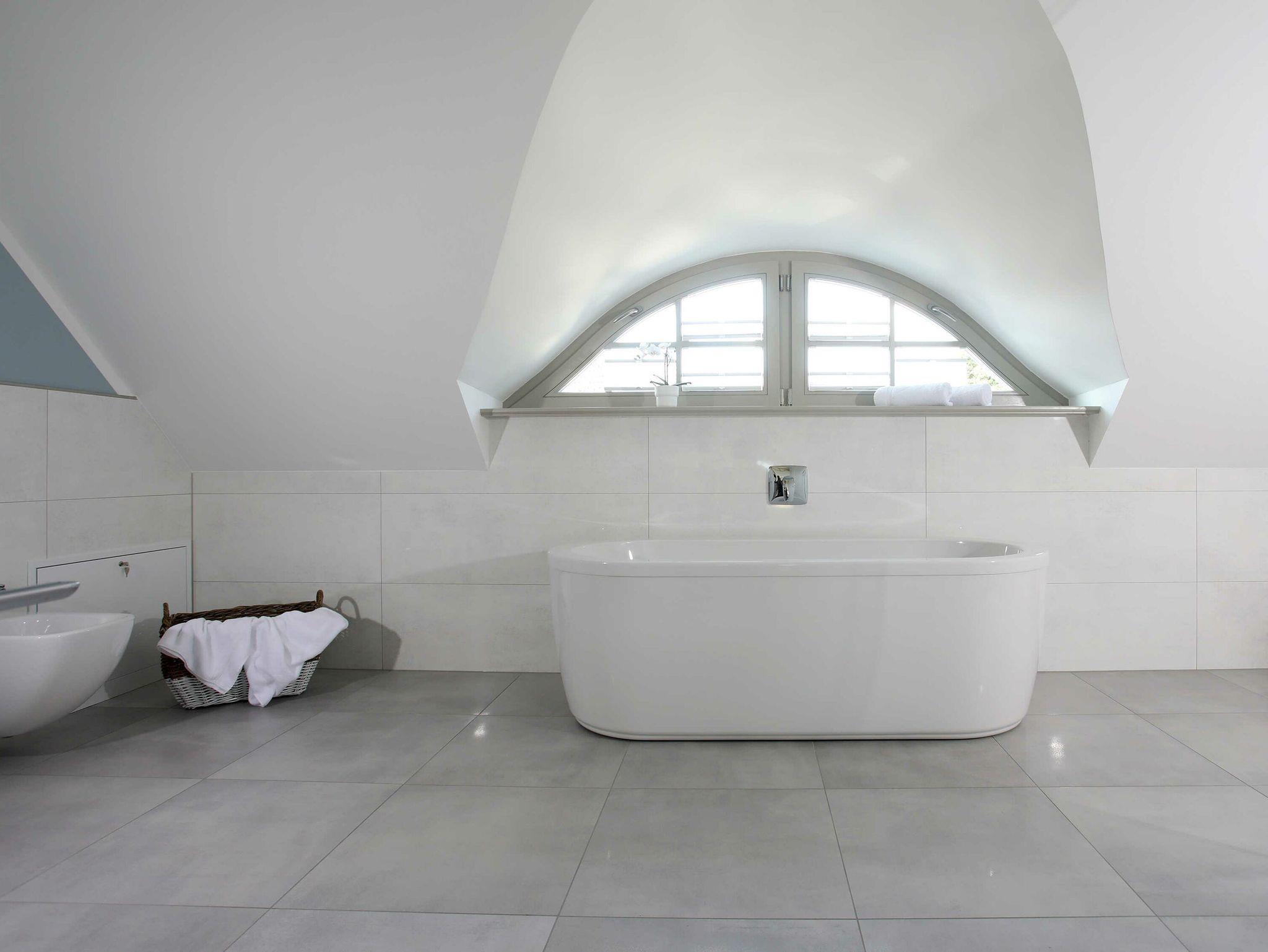 Auch das Hauptbad mit einer großen Dusche, einem Doppelwaschtisch sowie einer freistehenden Badewanne befindet sich im Obergeschoss.
