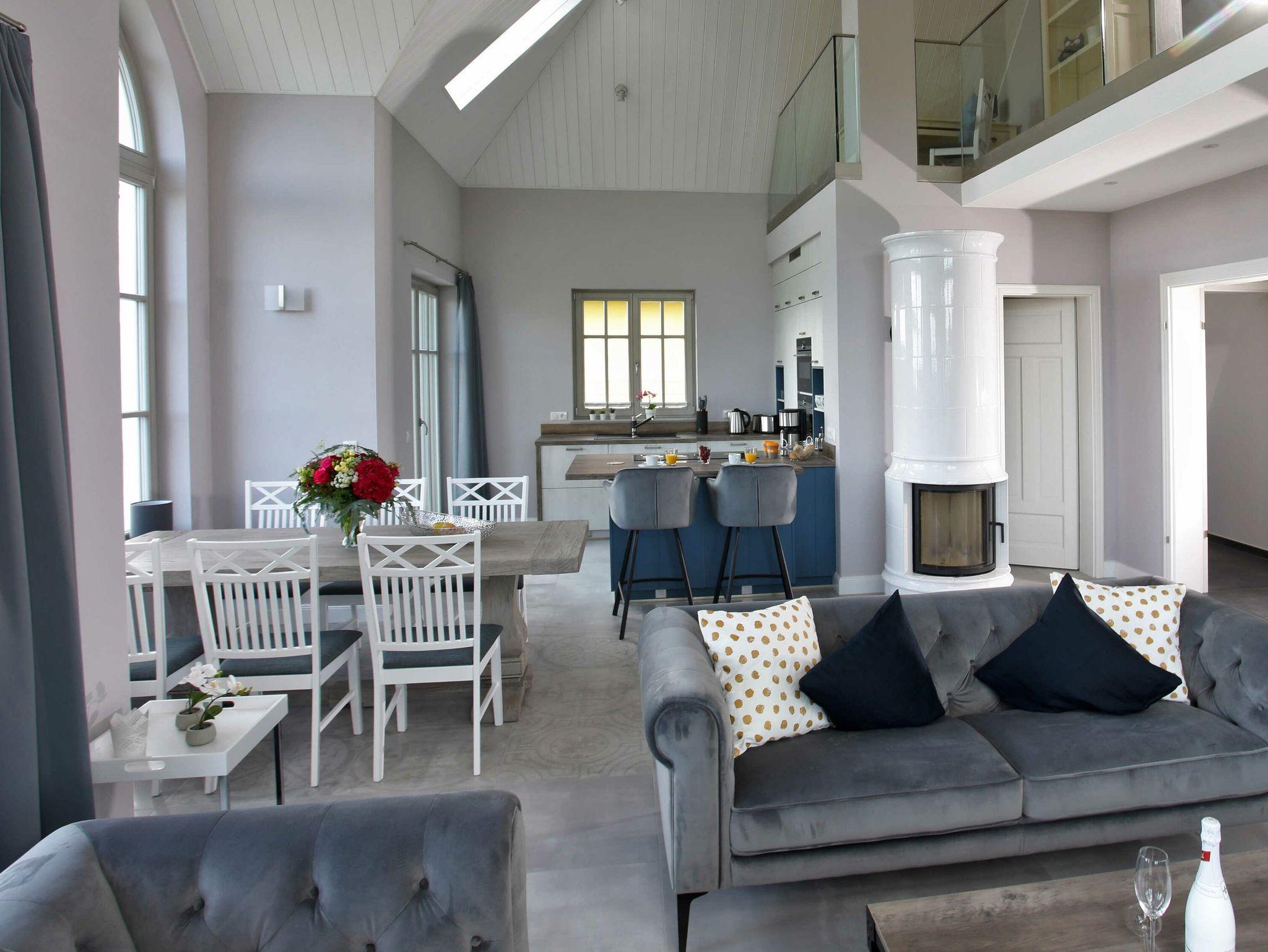 Der lichtdurchflutete Wohn- und Essbereich mit Blick aufs Wasser befindet sich im Erdgeschoss. Das Wohnzimmer ist mit gemütlichen Sofas und einem LED-UHD-TV ausgestattet. In der kühlen Jahreszeit verbreitet der Kaminkachelofen eine besonders behagliche Atmosphäre. Die große integrierte Küchenzeile mit einem Backofen, einer Mikrowelle, einem Geschirrspüler, einem großen Kühlschrank mit Gefrierfach, einer Kaffeemaschine, Toaster, Wasserkocher und diversen Kleininventar lässt das Herz jeden Hobbykochs höher schlagen. Eine freistehende Kochinsel mit Sitzmöglichkeit rundet das Wohnküchenflair ab.