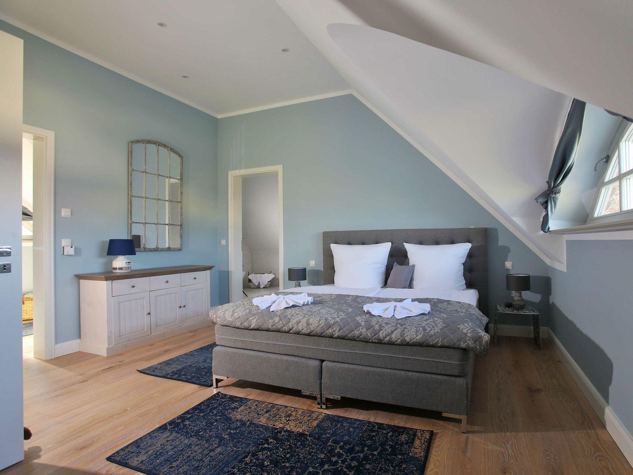 Im Erdgeschoss befinden sich auch zwei der insgesamt vier Schlafzimmer, ausgestattet mit jeweils einem Boxspringbett (180 x 200 cm) mit getrennten Matratzen und durchgehendem Topper. Vor einem der Schlafzimmer haben Sie eine weitere Terrasse zum Wohlfühlen. Ihren eigenen kleinen Saunabereich mit ebenerdiger Dusche und WC finden Sie ebenfalls im Erdgeschoss.