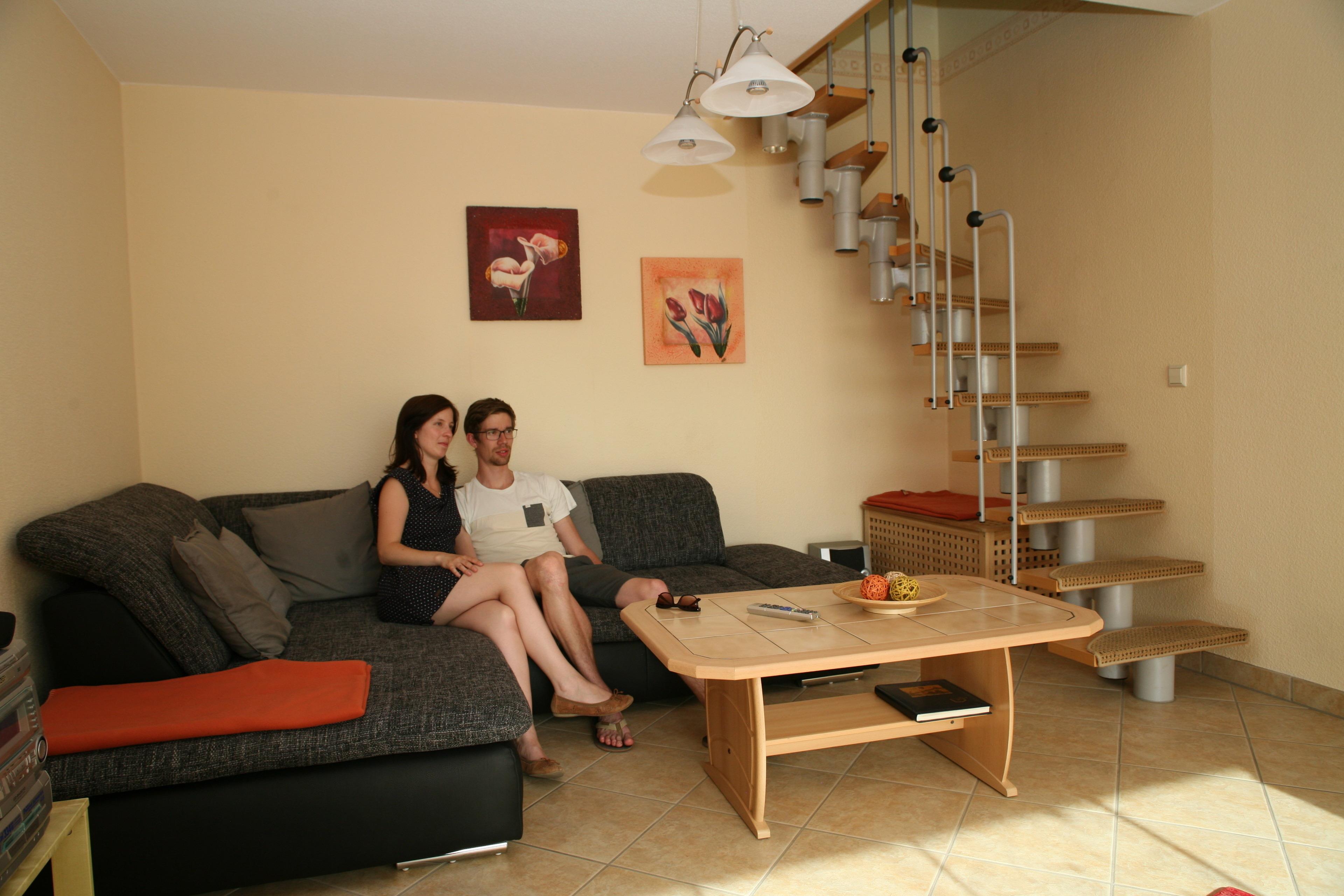 Der Wohnraum mit seinem großen Panoramafenster befindet sich im Erdgeschoß und ist mit einem LCD-Flachbildfernseher, DVD-Player, HiFi-Anlage, Telefon, einer gemütlichen Doppelcouch (ausziehbar) und Fußbodenheizung ausgestattet. Die Lamellenjalousie am Panoramafenster ist elektrisch individuell einstellbar. Weiter befindet sich im EG ein 2. Schlafzimmer mit LCD-Flachbildfernseher sowie der Vorraum mit Kleider- und Schuhtrockner. Über die Wendeltreppe gelangen Sie in den oberen Bereich des Ferienhauses. Das Esszimmer bietet Platz für 4 Personen, Kühl-, Gefriereinheit. Die Küche hält für Sie Kaffeemaschine, Mikrowelle, Cerankochfeld, Geschirrspüler, Toaster und ausreichend Geschirr bereit. Das Bad hat natürlich WC, einen beheizbaren Handtuchhalter und eine Dusche. Von hier aus kommen Sie auch auf den großen Balkon, ausgestattet mit Gartenmöbeln und Markise.