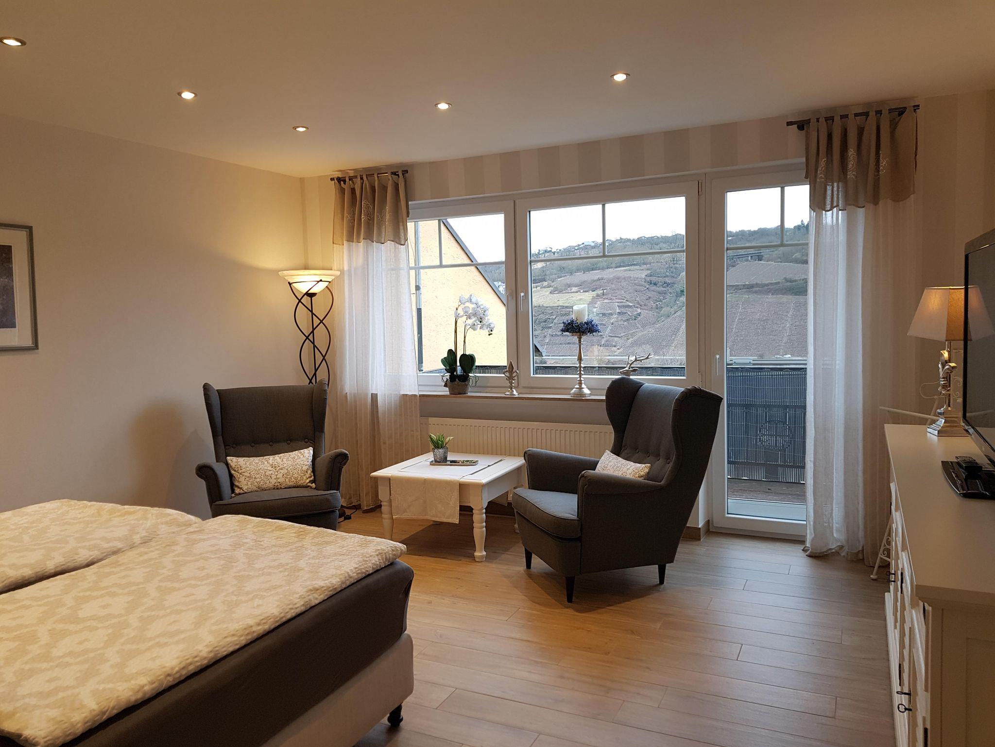Unser neues Appartement, soll Ihnen eine ganz besondere Auszeit, hier an der Mosel verschaffen. Deshalb haben wir bei der Einrichtung unser Augenmerk auf absolutes Wohlfühlen gerichtet. Zum Appartement gelangen Sie über Ihren eigenen Eingang. Unsere kleine Ferienwohnung im Landhausstil ist ca. 42 m² groß. Sie umfasst einen kombinierten Wohn-Schlafbereich, eine vollausgestattete Küche mit gemütlichem Essbereich sowie ein Bad mit ebenerdiger Dusche. Terrasse mit überdachten Freisitz und Balkon mit Moselblick gehören auch dazu. Hier dürfen sich ab sofort gerne 2 Gäste wohlfühlen.