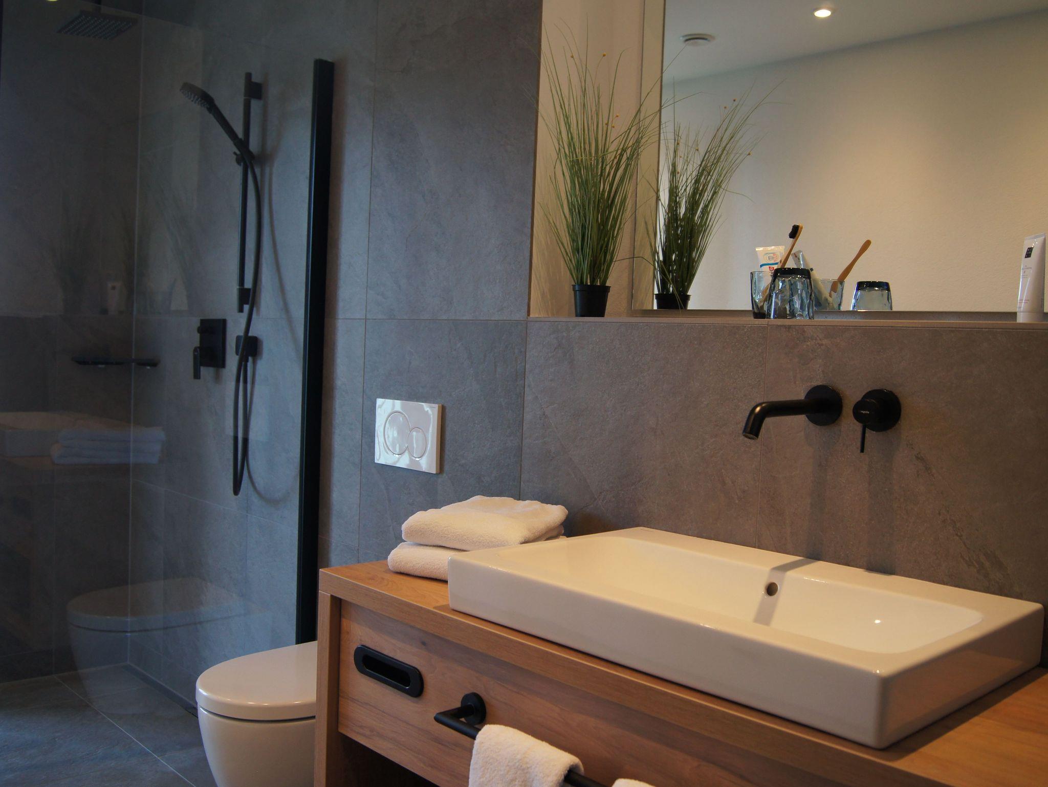 In das separate Schlafzimmer mit großem King-size Doppelbett (2x2 m) und (auch) Seeblick, ist ein großer Schrank eingebaut in dem auch ein kleiner Arbeitsplatz integriert ist (Thema „Workation“). Das Badzimmer mit Fußbodenheizung und begehbaren Dusche verfügt über einen direkten Zugang zum Balkon auf dem sich die kleine private Sauna befindet.