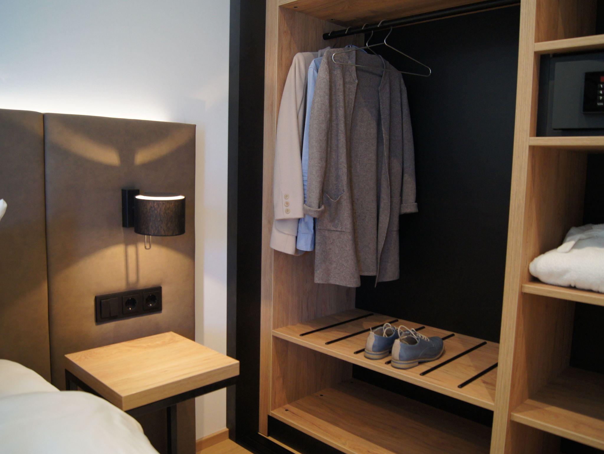In das separate Schlafzimmer mit großem King-size Doppelbett (2x2 m) und (auch) Seeblick, ist ein großer Schrank eingebaut in dem auch ein kleiner Arbeitsplatz integriert ist (Thema „Workation“). Das Badzimmer mit Fußbodenheizung und begehbaren Dusche verfügt über einen direkten Zugang zum Balkon auf dem sich die kleine private Sauna befindet.