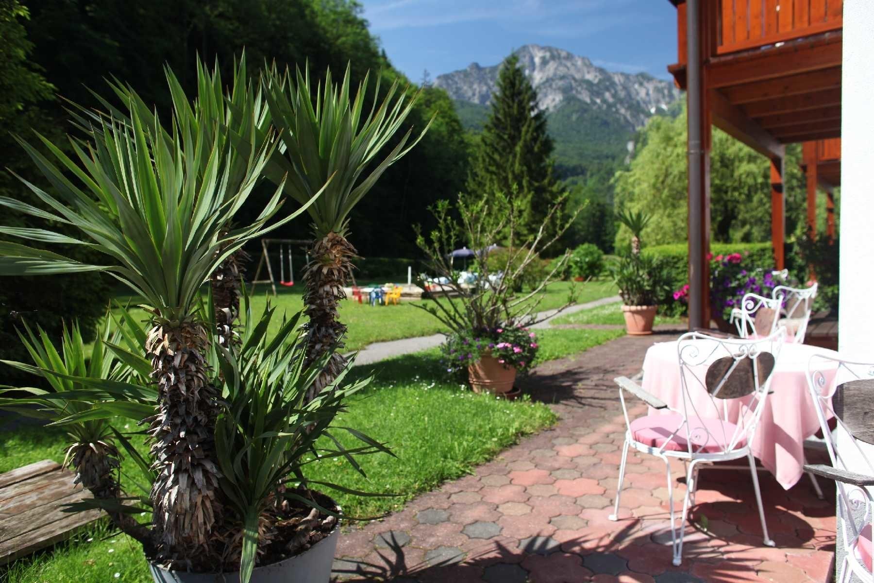 Große Liegewiese mit schönem Bergblick und Doppelholzliegen laden zum entspannen ein.