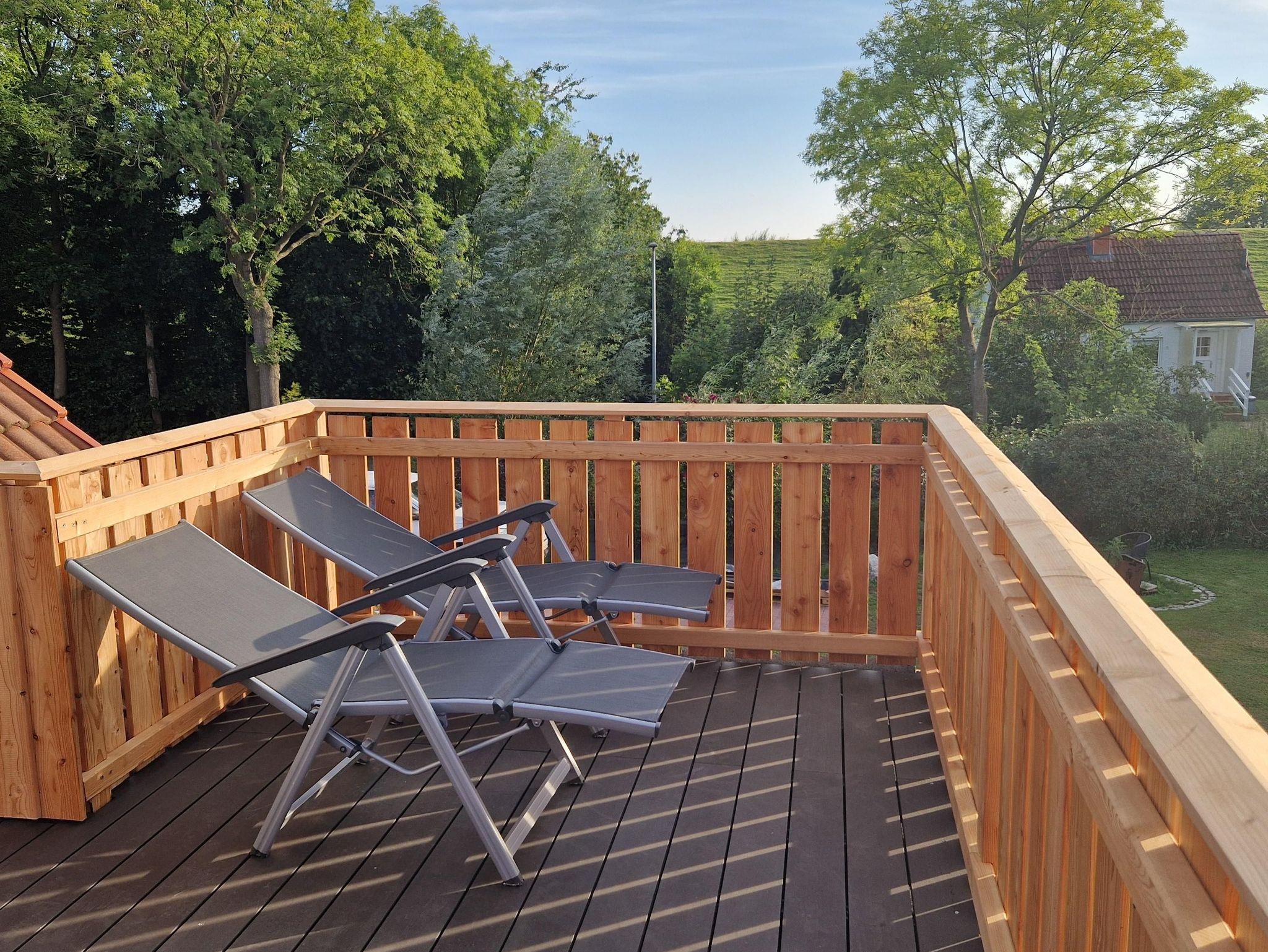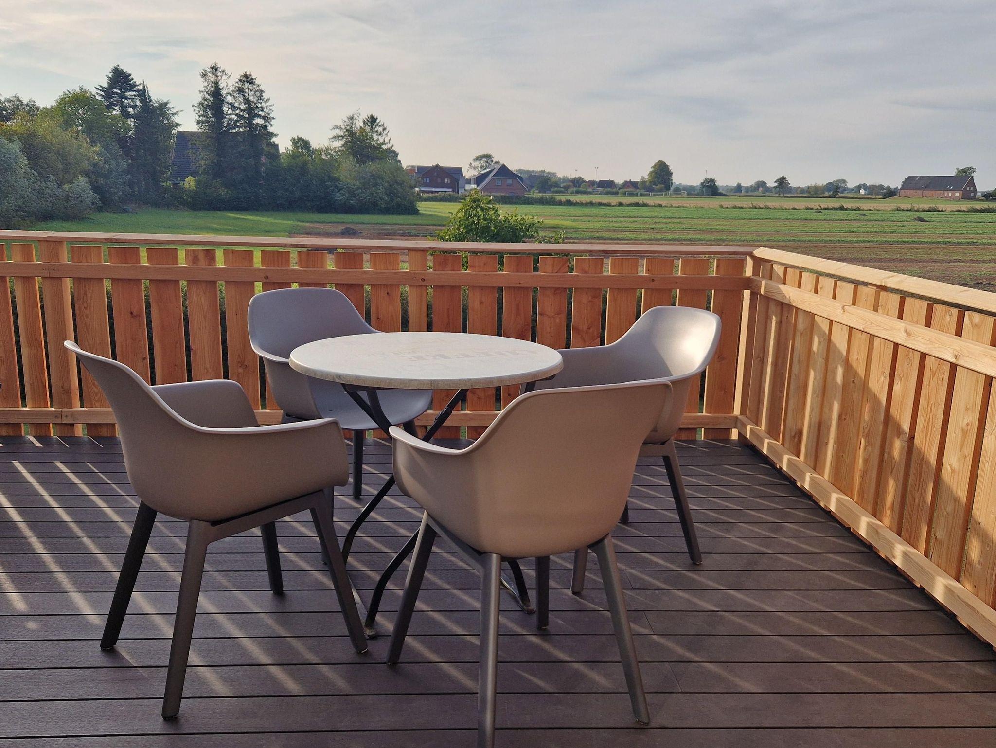 Balkon mit Aussicht über Deich und Felder. Hier könnt ihr die tolles Sonnenuntergänge geniessen.