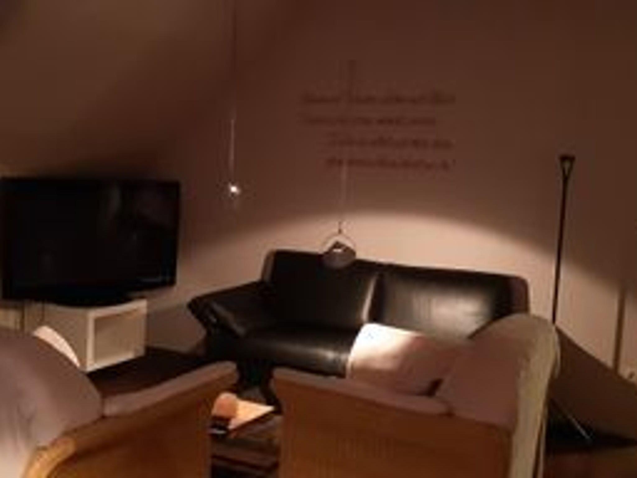 Ledercouch, neuer Esstisch mit Holzstühlen, Couchtisch (Einzelanfertigung), großer Fernseher, etc.