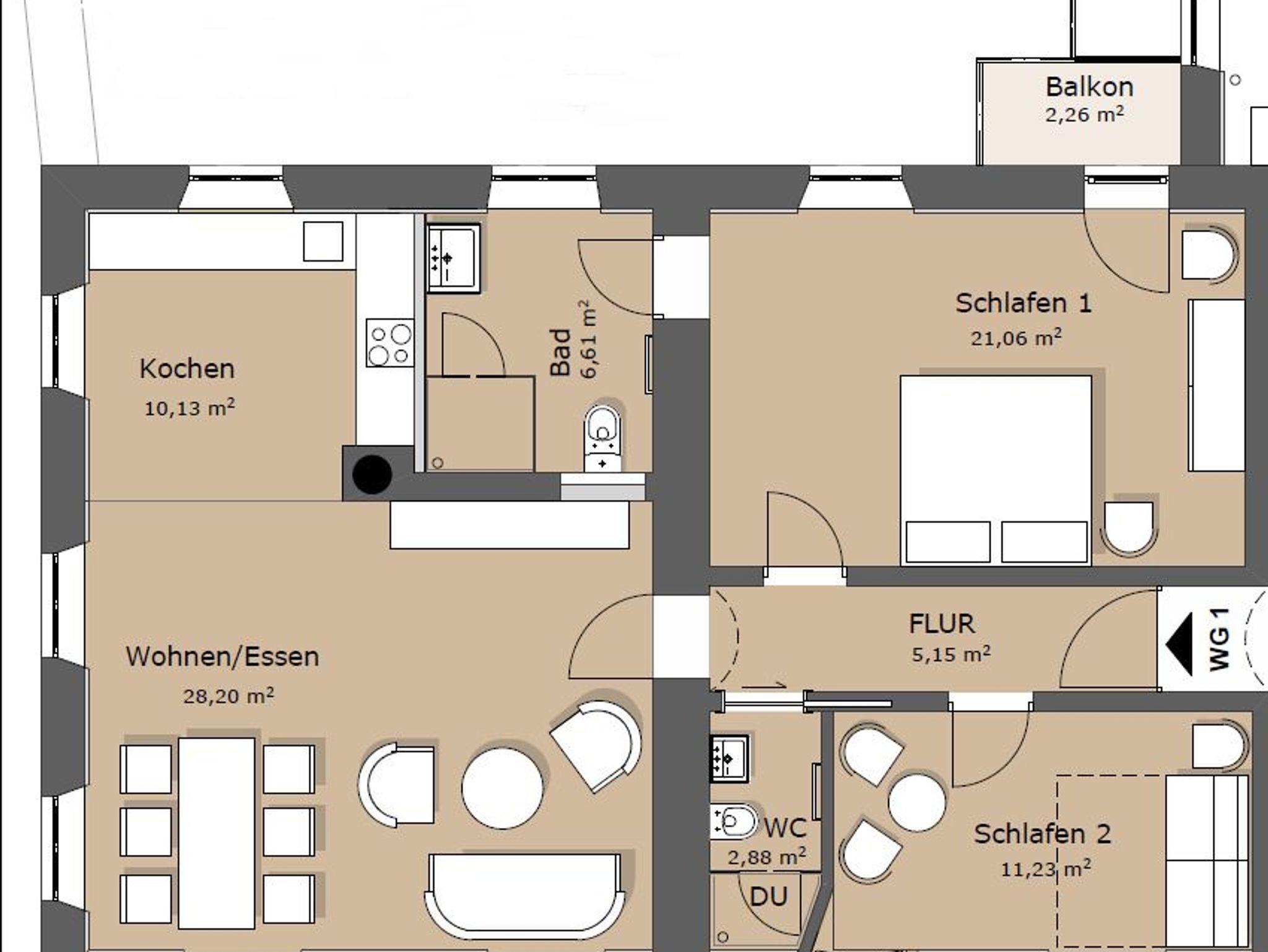 Die Ferienwohnung Burgunder befindet sich im Herrenhaus, EG West und verfügt über einen großzügigen Wohn-Ess-Kochbereich mit Einbauküche inkl. Kühl- und Gefrierschrank, Wasch- und Geschirrspülmaschine, Schlafzimmer mit Tageslichtbad ein suite inkl. ebenerdiger Dusche, zweites Schlafzimmer mit ebenerdigem Gartenzugang.