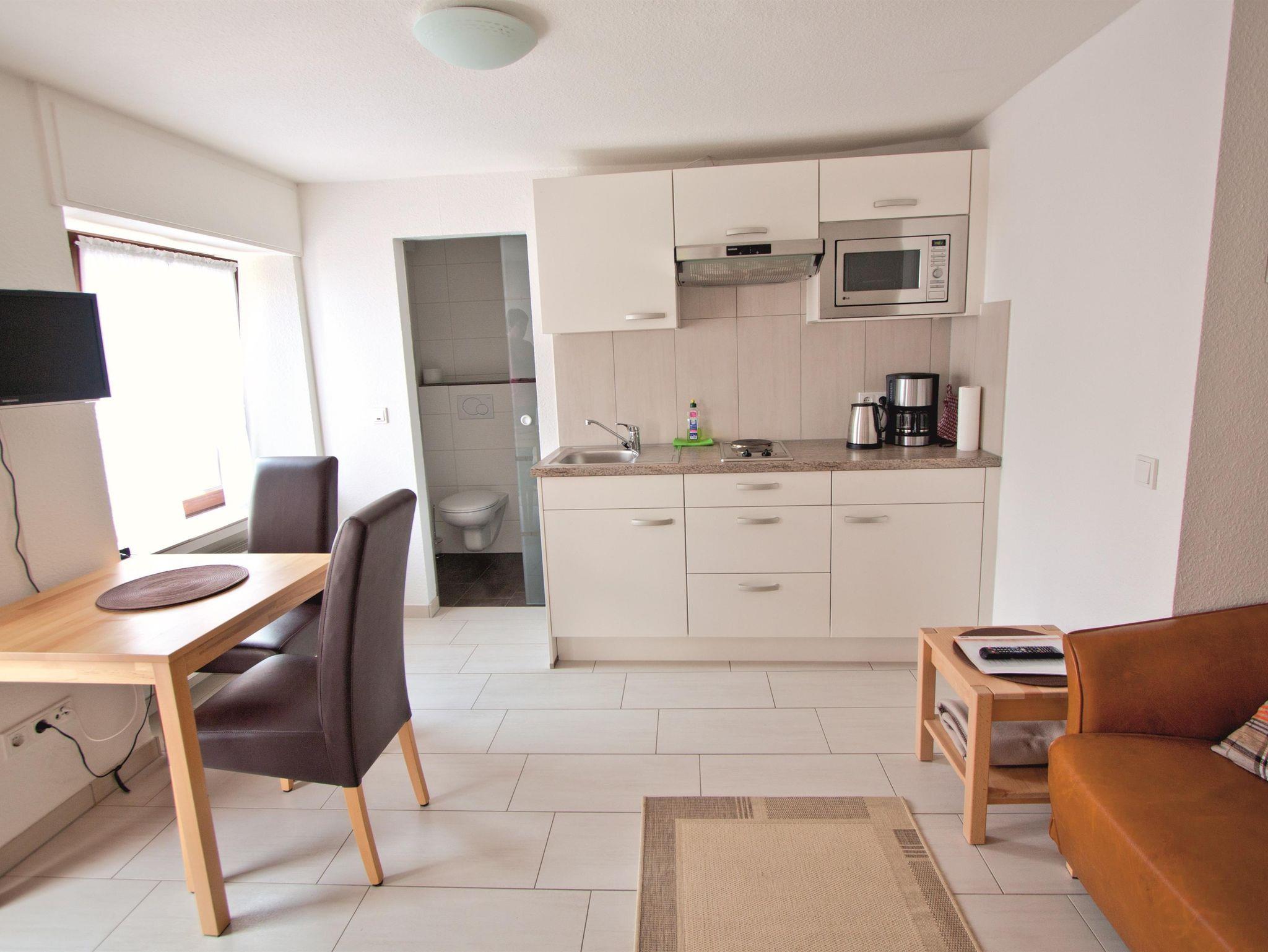 Sep. Schlafzimmer mit Doppelbett, Wohnraum mit Küche und Sitzecke, Du/WC, SAT-TV und ein Balkon. Küche mit Zweiplattenherd und Mikrowelle mit Grillfunktion, ca. 30 qm. WLAN ist kostenlos vorhanden.