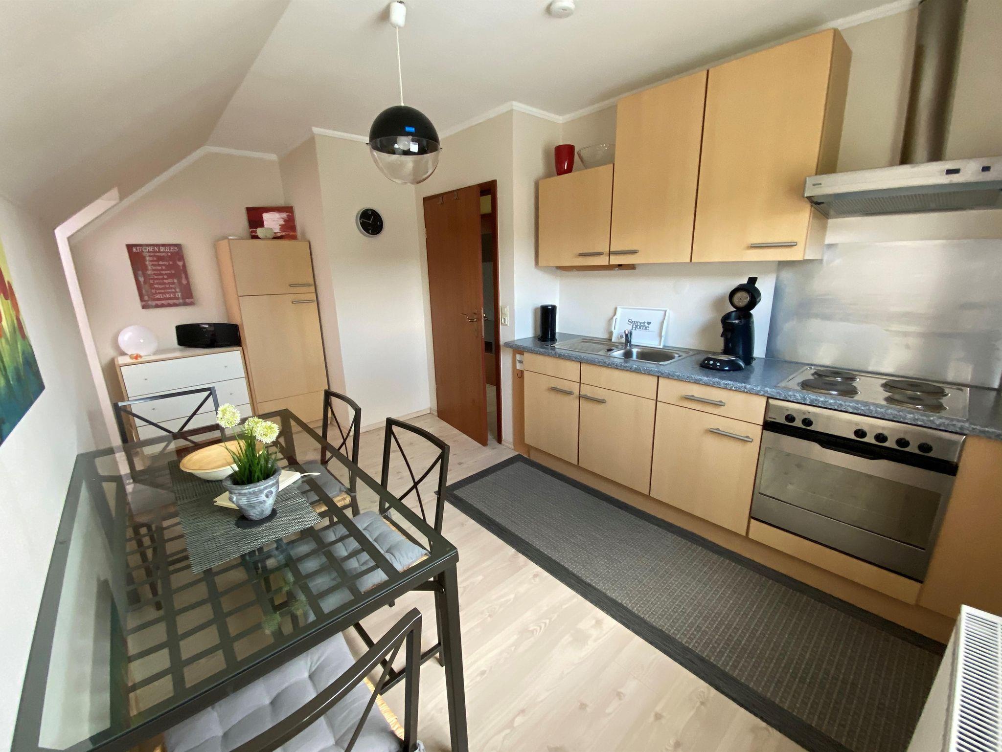 Die Ferienwohnung verfügt über einen großen Südbalkon, ein neues Badezimmer sowie eine zweckmäßig eingerichtete Küche mit Mikrowelle, Kaffeemaschine, Kühlschrank, Herd und Backofen, Musikanlage.