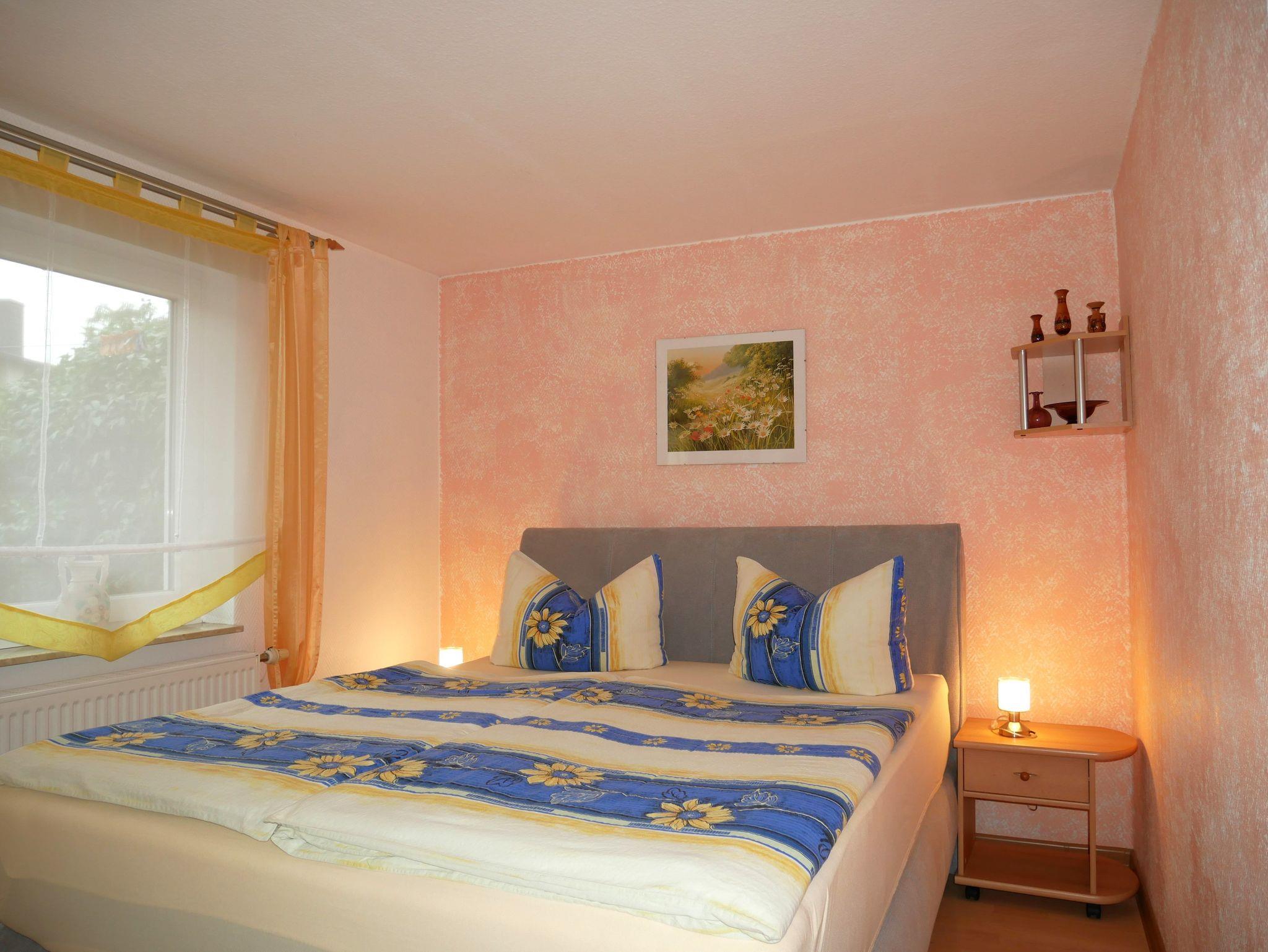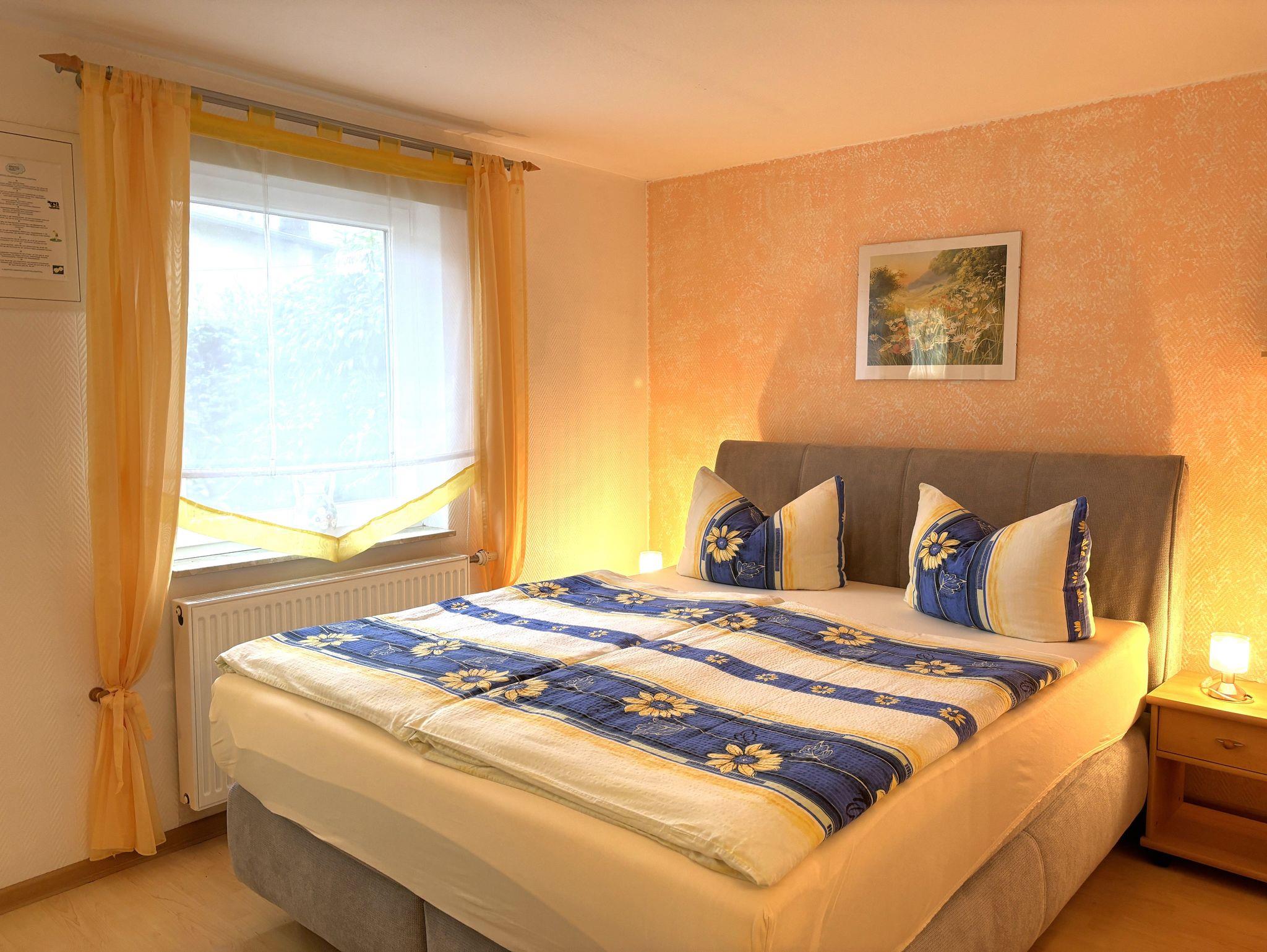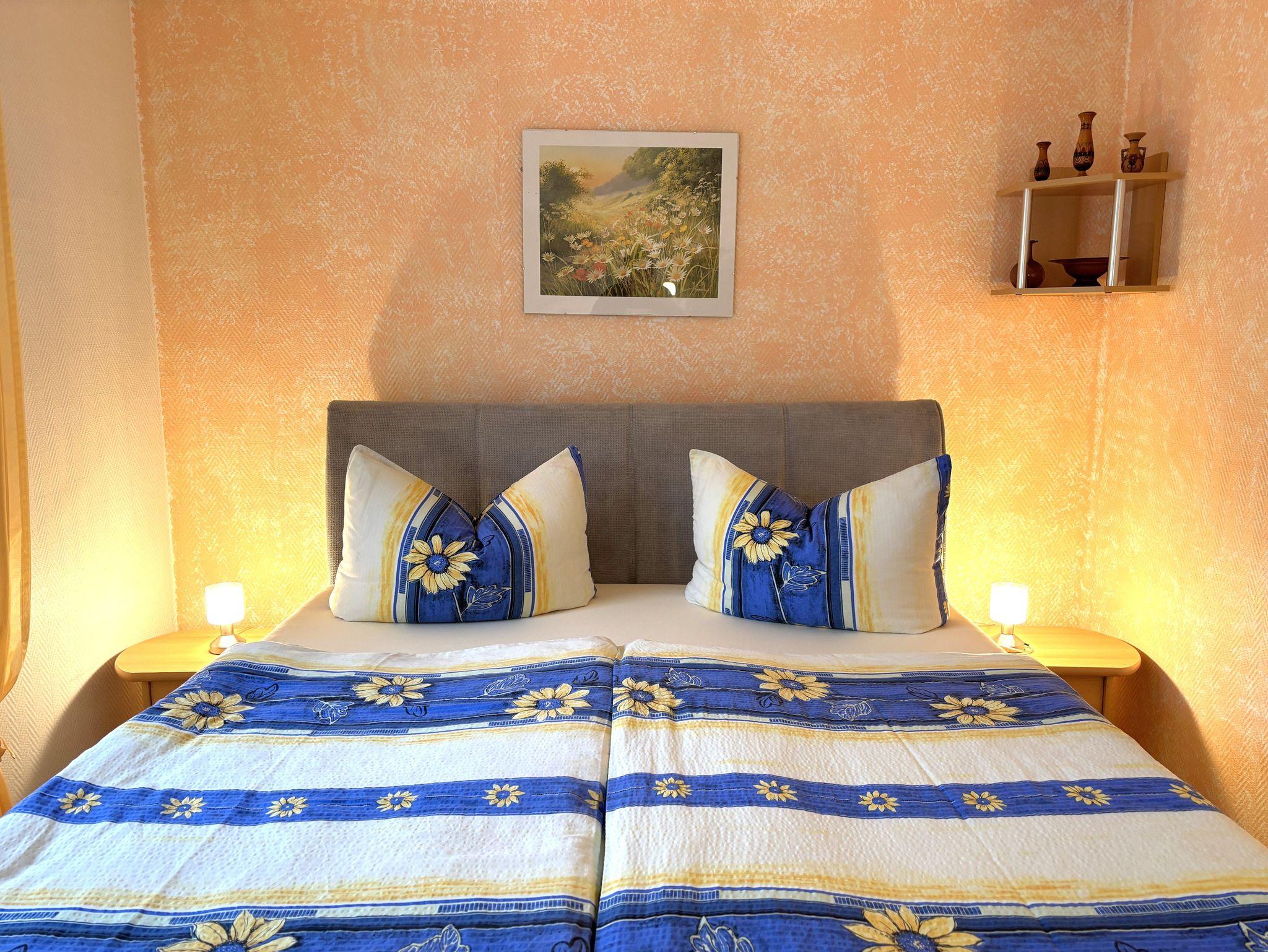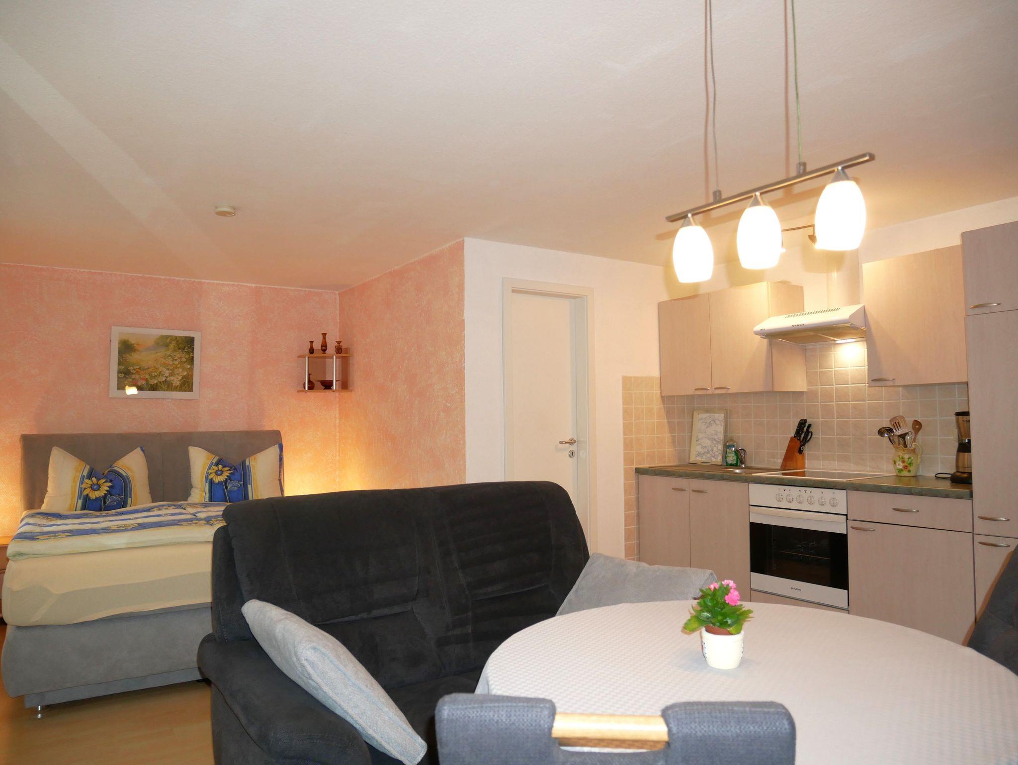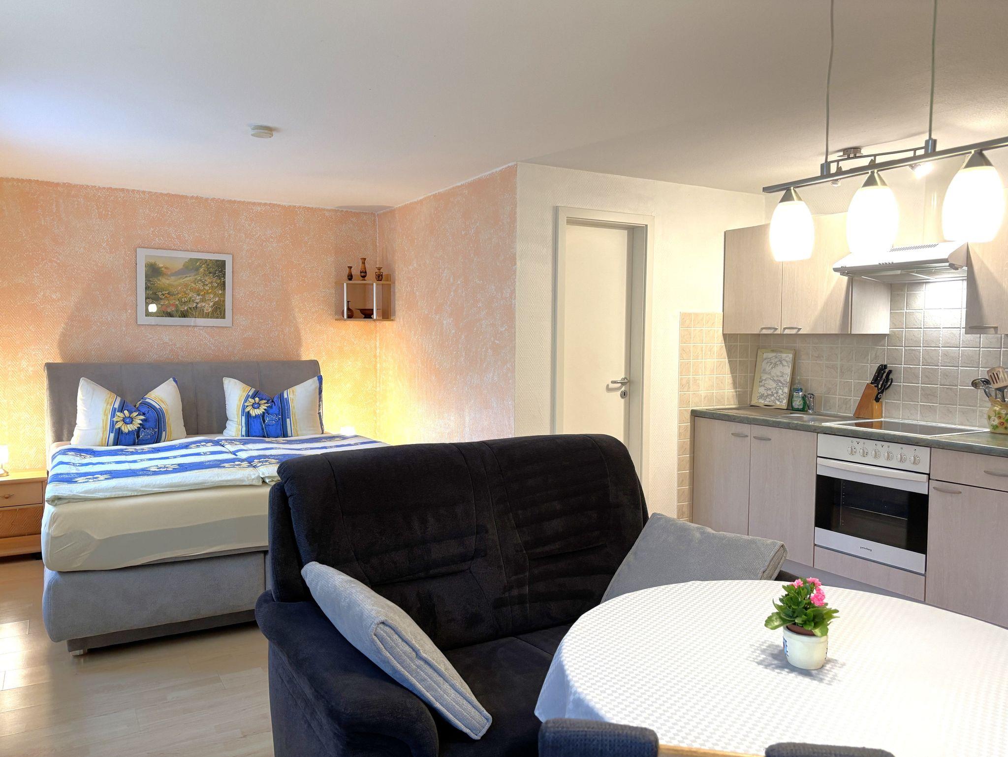 Das gemütlich eingerichtete Nichtraucher-1-Raum-Appartement ist ca. 38qm groß und für 2 Personen geeignet. Es verfügt über ein Wohnschlafzimmer mit Doppelbett und einem geräumigen Kleiderschrank. Ebenso gibt es eine gemütliche Couchsitzecke mit Tisch, TV, Radio mit CD-Player. In den Wohnraum fügt sich eine sehr gut ausgestattete Küchenzeile mit 4-Platten-Ceranherd, Backofen, Kühlschrank, Kaffeemaschine, Toaster und Wasserkocher ein. Das Badezimmer verfügt über Dusche/WC. Vor dem Appartement gibt es eine sonnige möbelierte Terrasse auf der auch gegrillt werden darf. Im Garten befindet sich eine Schaukel für die kleinen Gäste. Ein Pkw-Stellplatz, Bettwäsche, Endreinigung sind im Preis inklusive. Ein Kinderreisebett und Hochstuhl sind auf Anfrage kostenfrei verfügbar. Handtücher sind mitzubringen.