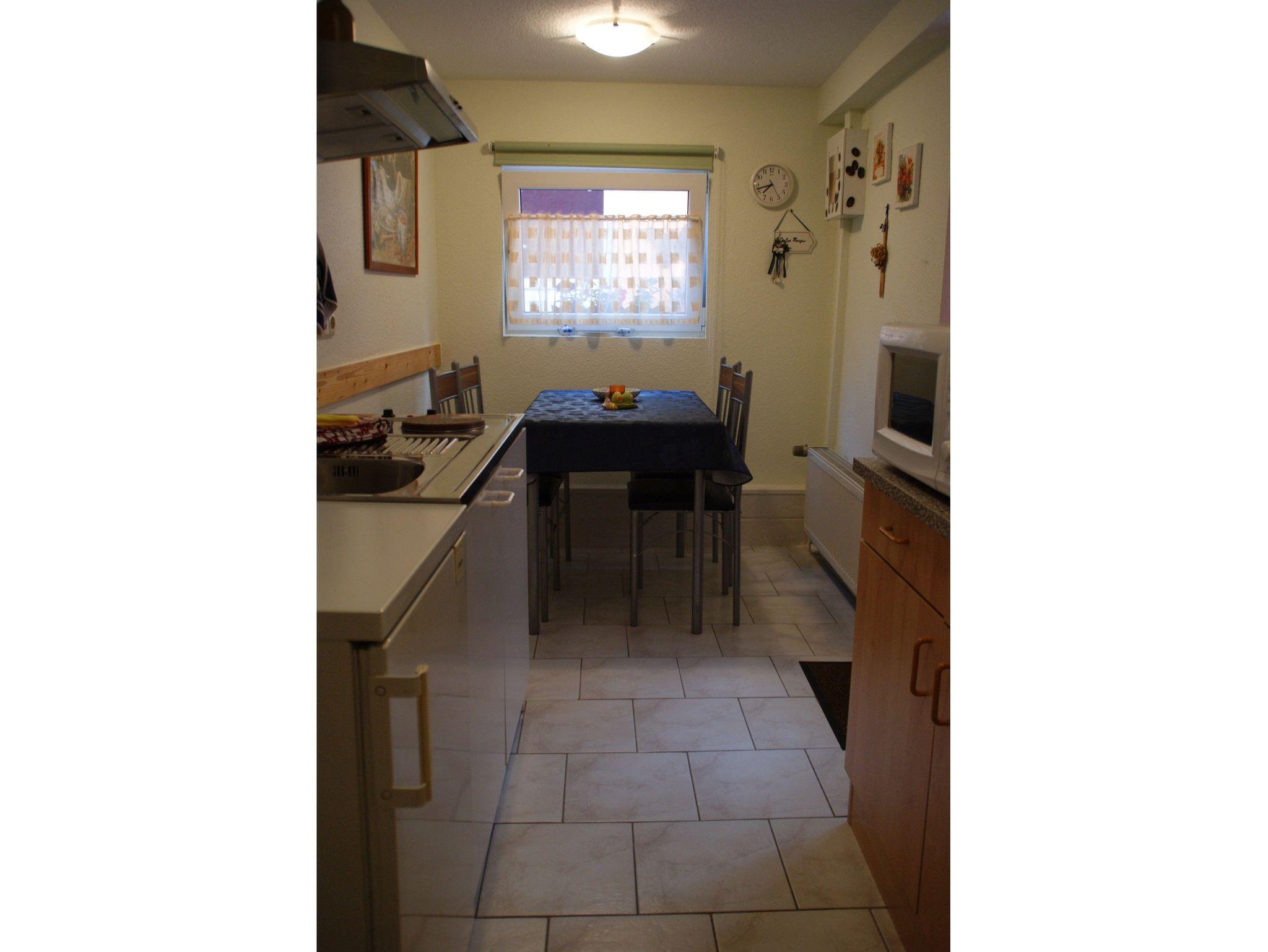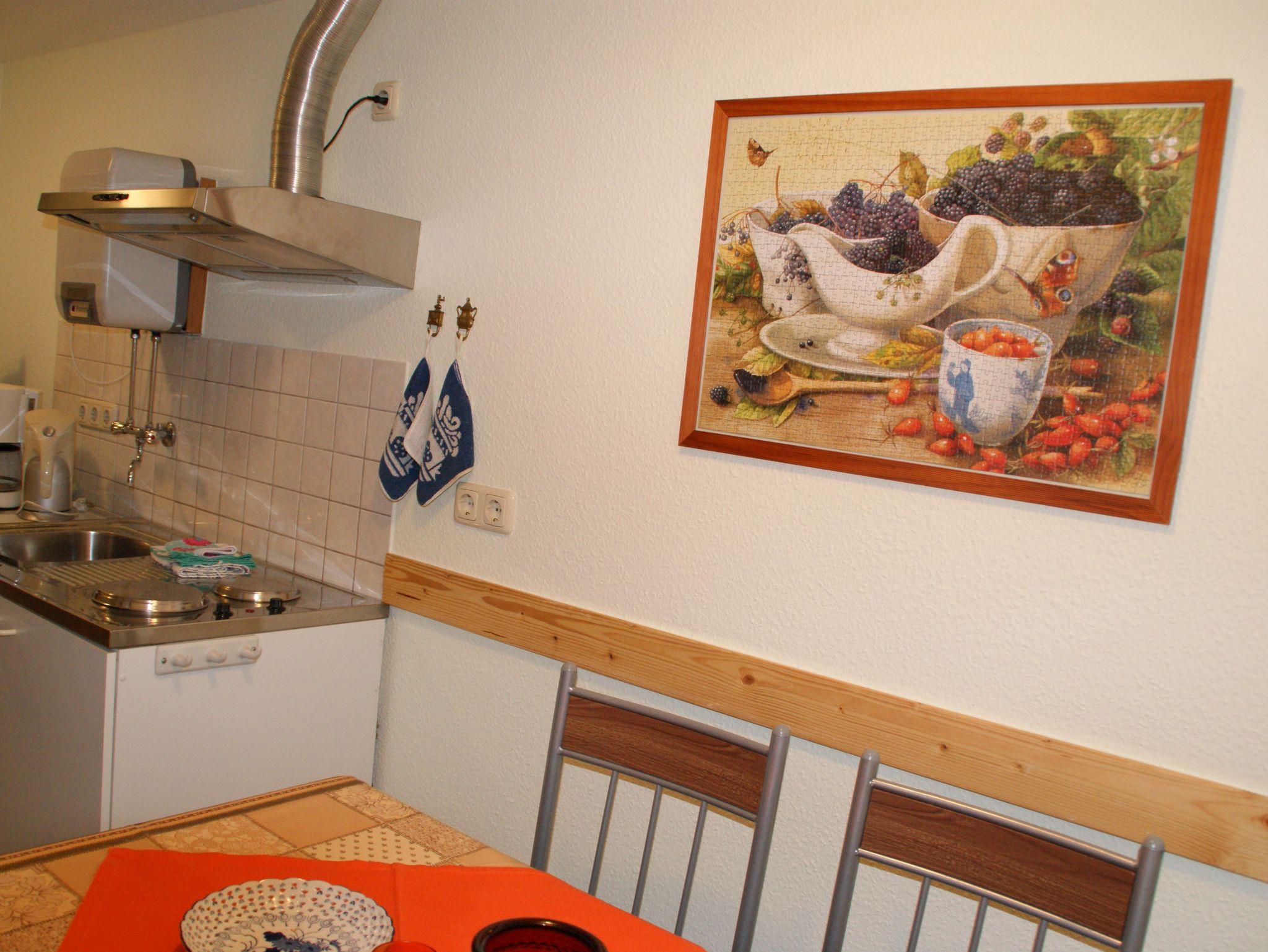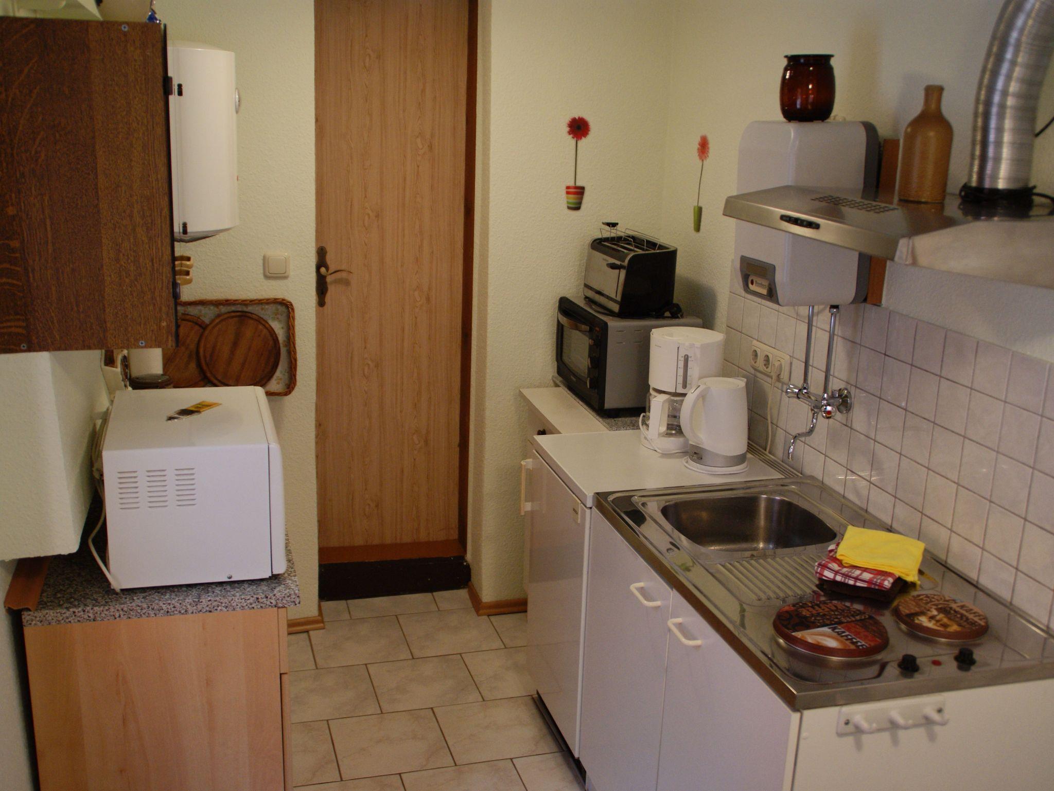 Die Ferienwohnung 2 ist ca. 43m² groß und verfügt über ein Wohnzimmer mit einem Sofa, Flat-TV und Radio. Die separate Küche ist ausgestattet mit einem Mini-Backofen, 2-Platten-Herd, Kühlschrank mit Gefrierfach, Kaffeemaschine, Toaster, Wasserkocher und mit einem Essplatz. Das große Schlafzimmer verfügt über ein Doppelbett und über einen Kleiderschrank. Im kleineren Schlafzimmer befindet sich ein kleines französisches Bett. Das Badezimmer ist mit einer Dusche ausgestattet. Vor der Wohnung befindet sich eine möblierte Terrasse. Zusätzlich finden Sie auf dem Grundstück eine überdachte Laube, die zum Grillen oder gemütlichen Beisammensein geeignet ist.