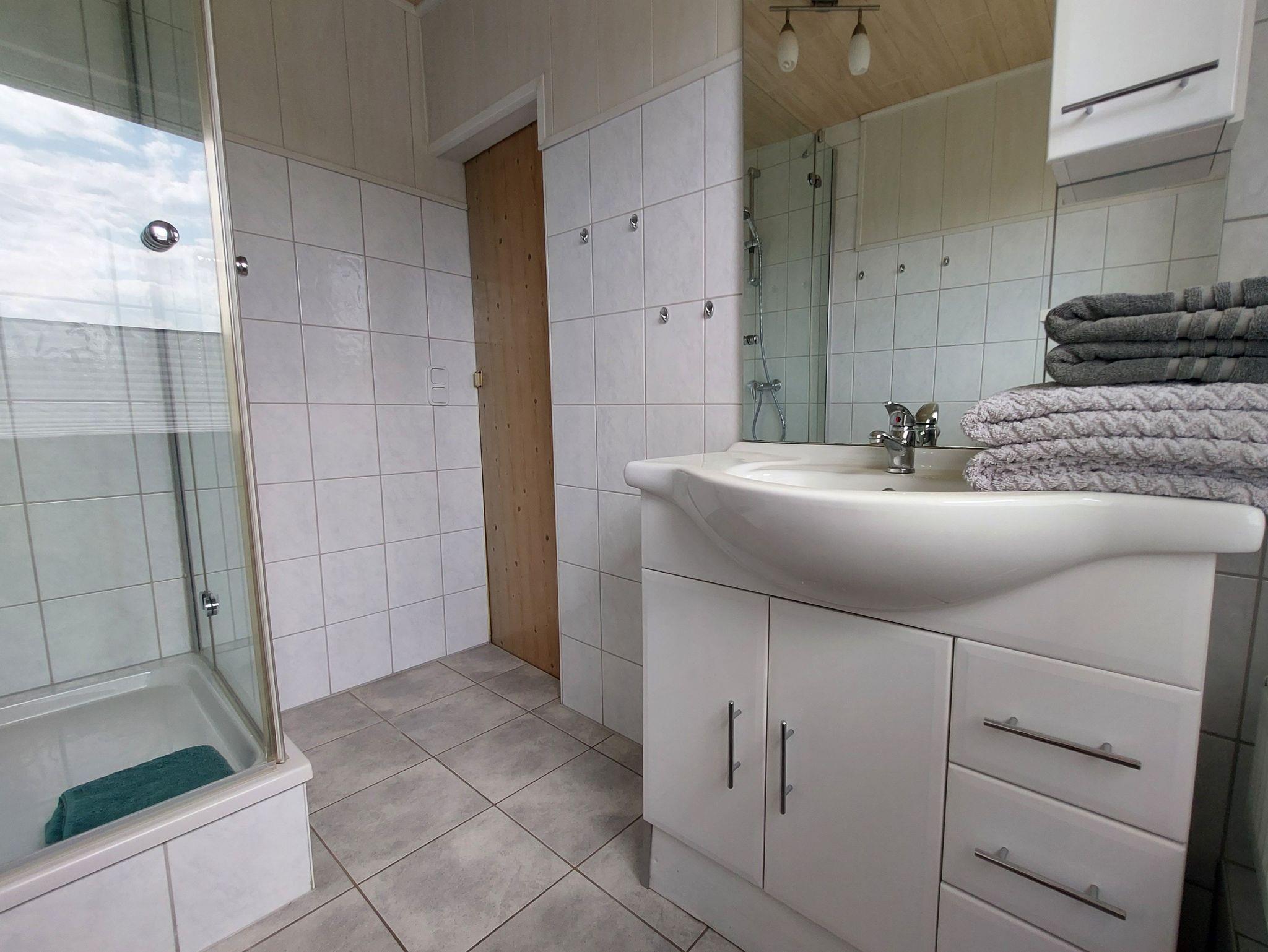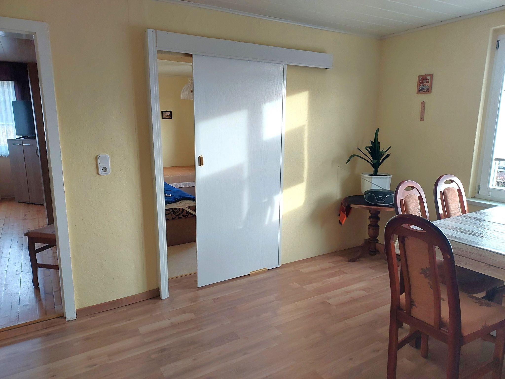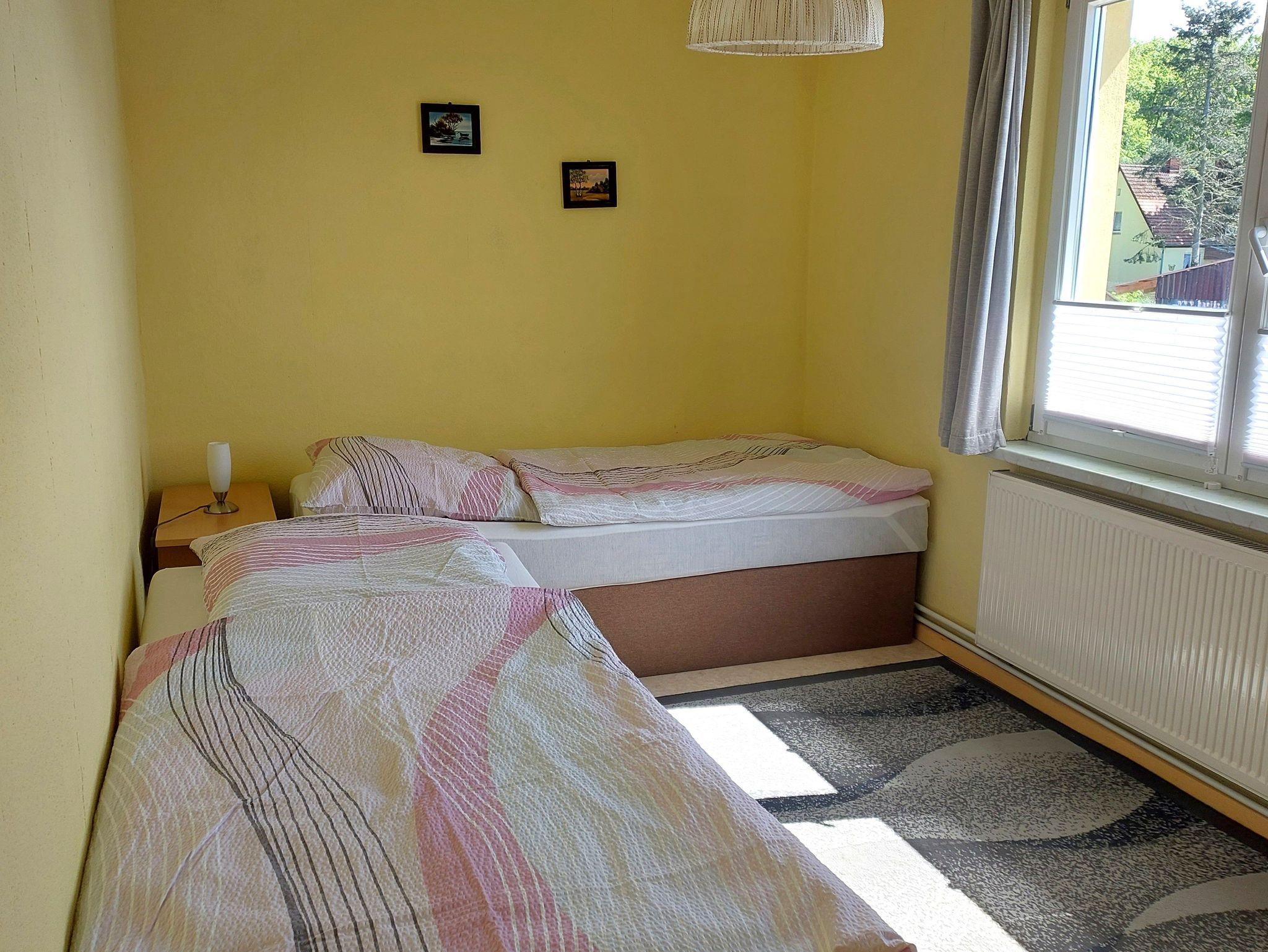 Die Ferienwohnung befindet sich im Dachgeschoss unseres Einfamilienhauses, ist ca. 60m² groß und verfügt über ein gemütliches Wohn-/Schlafzimmer mit einer Couch, einem Boxspringdoppelbett, Einzelbett, Aufbettungsmöglichkeit und einem Flachbildfernseher. Die separate Küche ist ausgestattet mit einer Miniküche, Kühlschrank, Kaffeemaschine, Wasserkocher, Toaster, Microwelle und einem großen Essplatz. Insgesamt verfügt die Ferienwohnung über zwei Räume, Küche und Bad (Dusche/WC). Die möblierte Terrasse mit Grillmöglichkeit, sowie der große Garten laden zum Entspannen und Erholen ein. Kinderspielmöglichkeiten stehen im Garten bereit. Ganz in der Nähe befindet sich auch der kommunale Spielplatz mit Fußballplatz und Basketballfeld. PKW-Stellplätze sind auf dem Grundstück vorhanden, ebenso eine abschließbarer Fahrradschuppen.