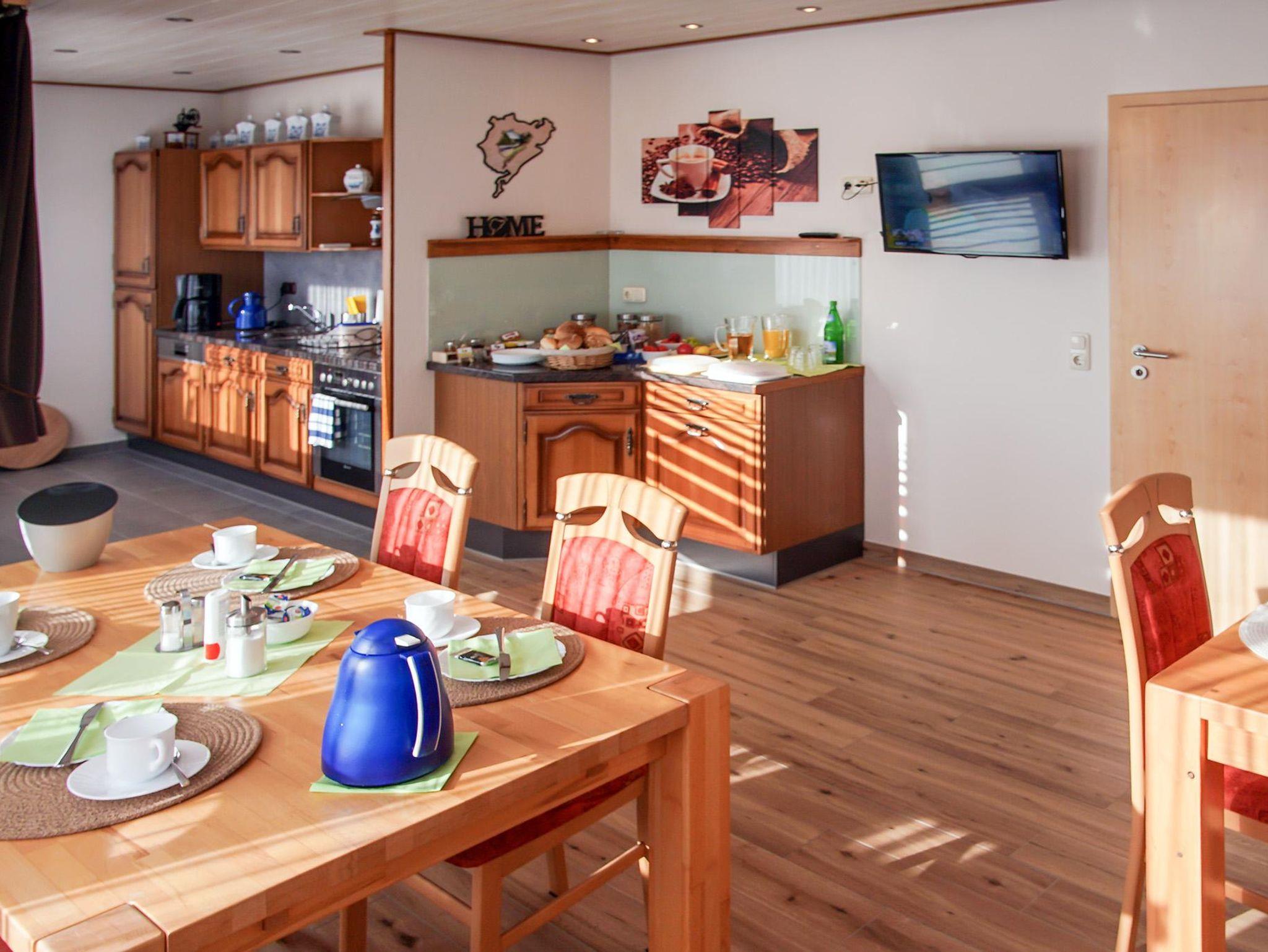 Gemütlich eingerichtete Ferienwohnung bestehend aus Schlafzimmer, Bad, Küche, Essbereich, Wohnbereich mit Schlafcouch und Sat-TV. Die Wohnung liegt im Dachgeschoss und bietet Ihnen neben entspannender Ruhe einen herrlichen Ausblick auf die schöne Eifellandschaft. Ein Parkplatz ist direkt vor dem Haus, eine Liegewiese lädt zum Entspannen ein, der Grillplatz mit Sitzgruppe und herrlicher Aussicht steht unseren Gästen gerne zur Verfügung. Wanderfreunde werden von der noch ursprünglichen Eifel-Landschaft begeistert sein.