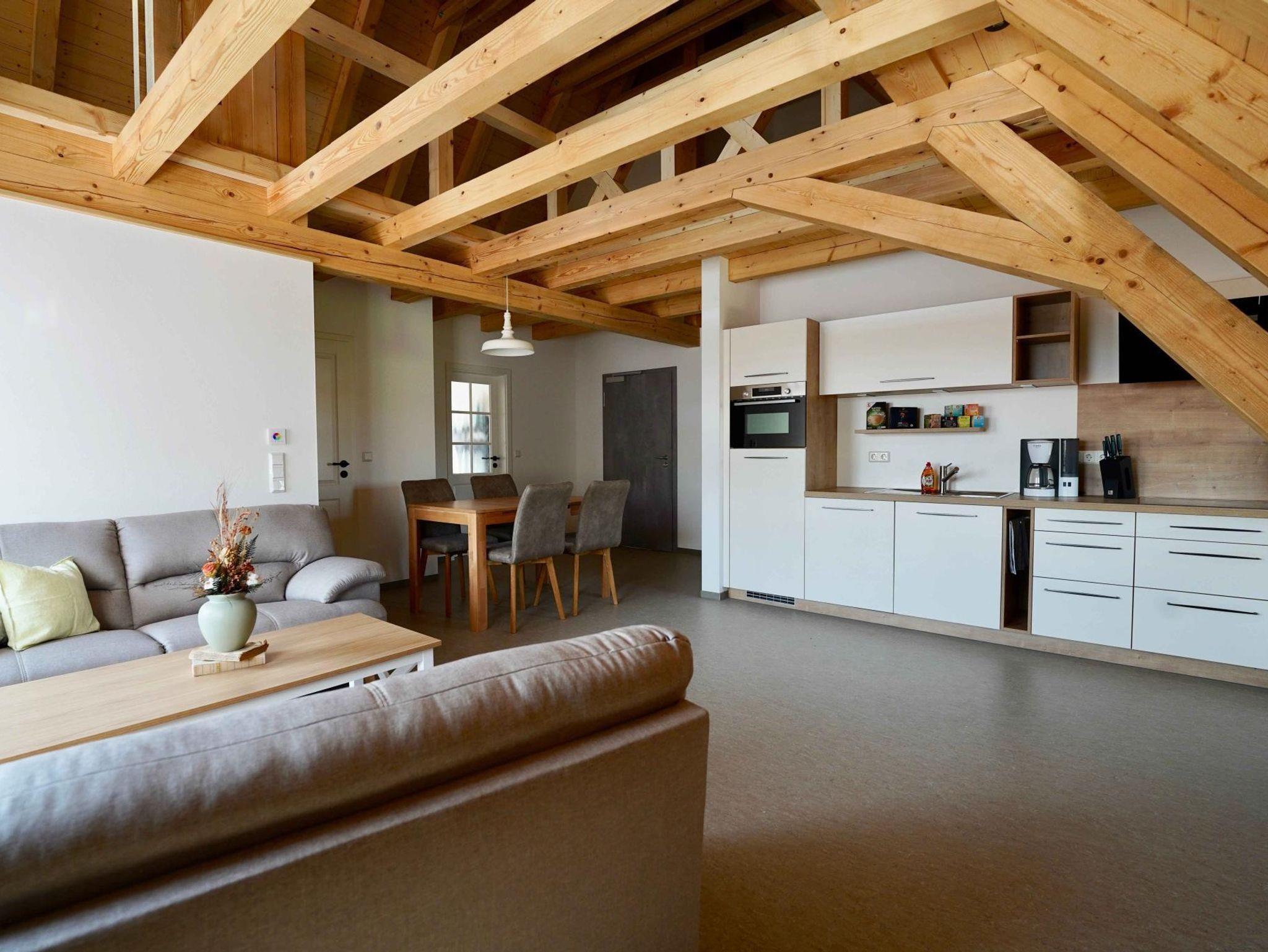 Diese Familienwohnung mit Blick auf den Berg Kottmar besitzt eine geräumige vollausgestattete Wohnküche mit einer Essecke, 2 Schlafzimmer mit jeweils 1 Doppelbett und 1 Etagenbett. Im Badezimmer erwartet euch eine große ebenerdige Dusche sowie ein WC, Waschtischschrank und einen großen beleuchteten Spiegel. Der Wohnbereich ist großzügig bemessen und die Besonderheit dieser Ferienwohnung ist eine zum Dach hin offene Bauweise mit einer aufwendigen Holzkonstruktion. Weiterhin besteht die Möglichkeit, bei Bedarf eine weitere Ferienwohnung mit 5 Betten mitzubenutzen. In der Ferienwohnung sind außerdem der Bettwäsche- und Handtuchservice sowie der Kaffee und eine kleine Tee-Auswahl in der Küche, als Service inbegriffen. Eine Flasche Mineralwasser als Begrüßungsgetränk und die Endreinigung nach dem Check Out gehören ebenfalls standardmäßig zu unserem Service.
