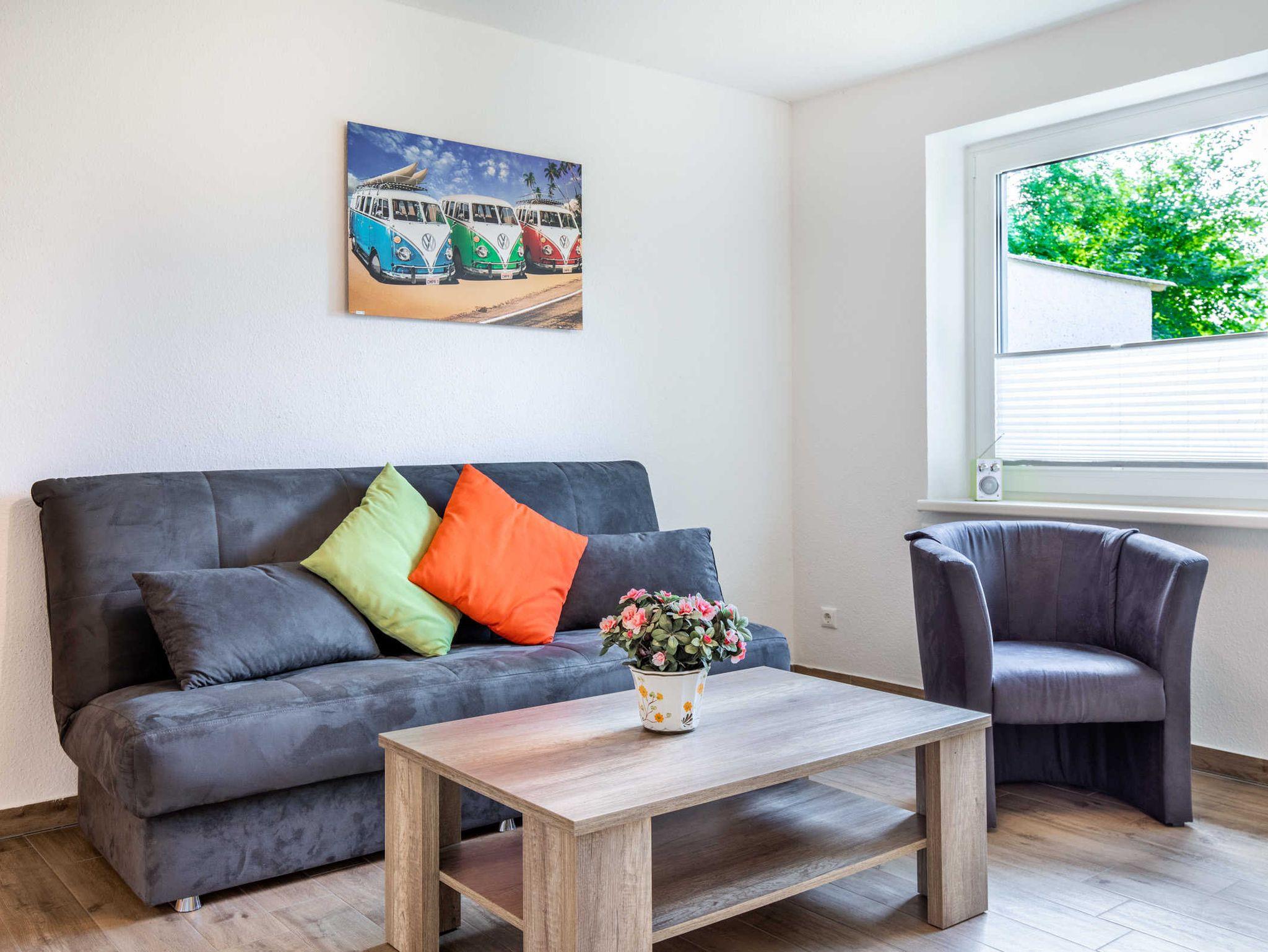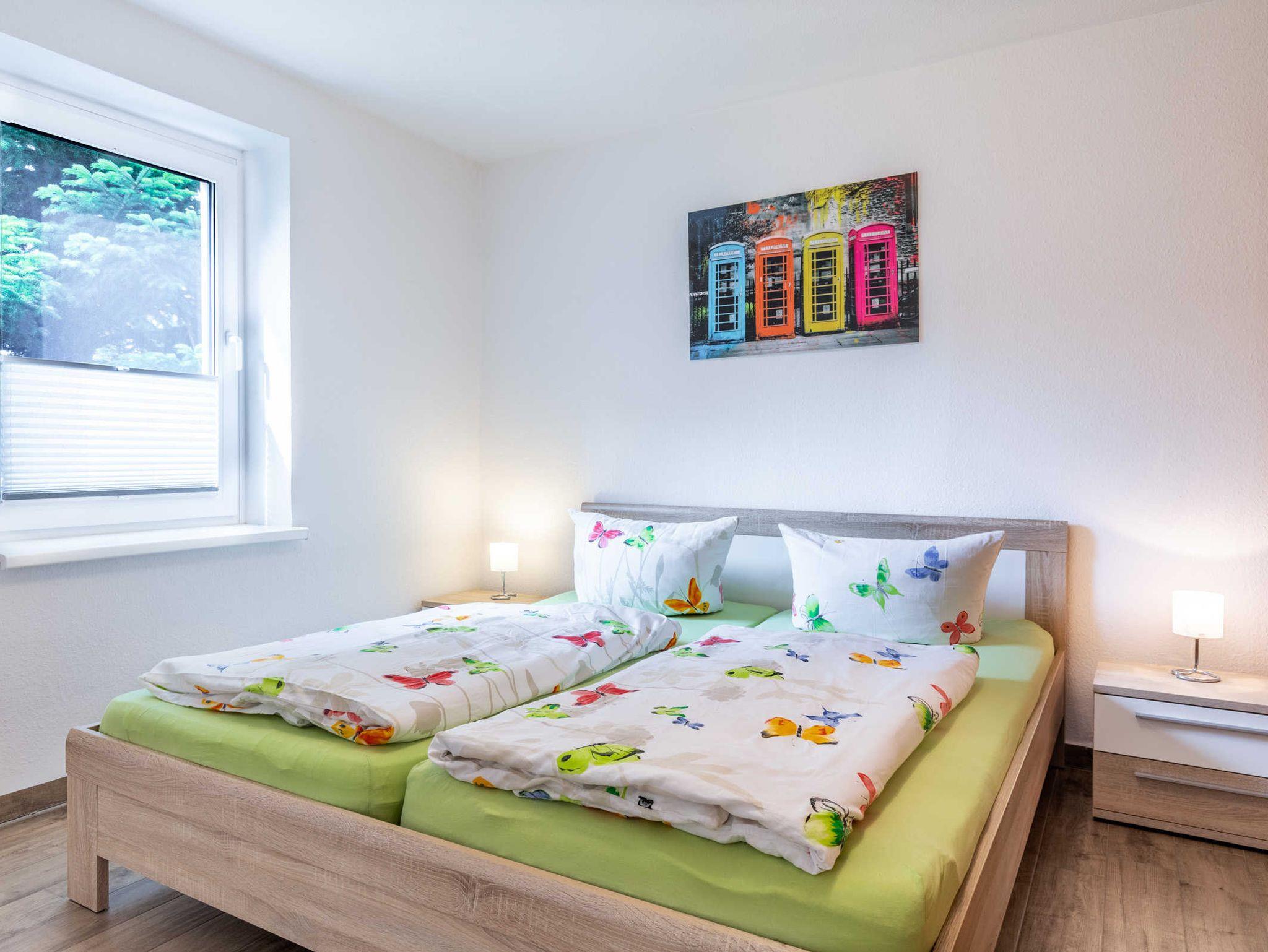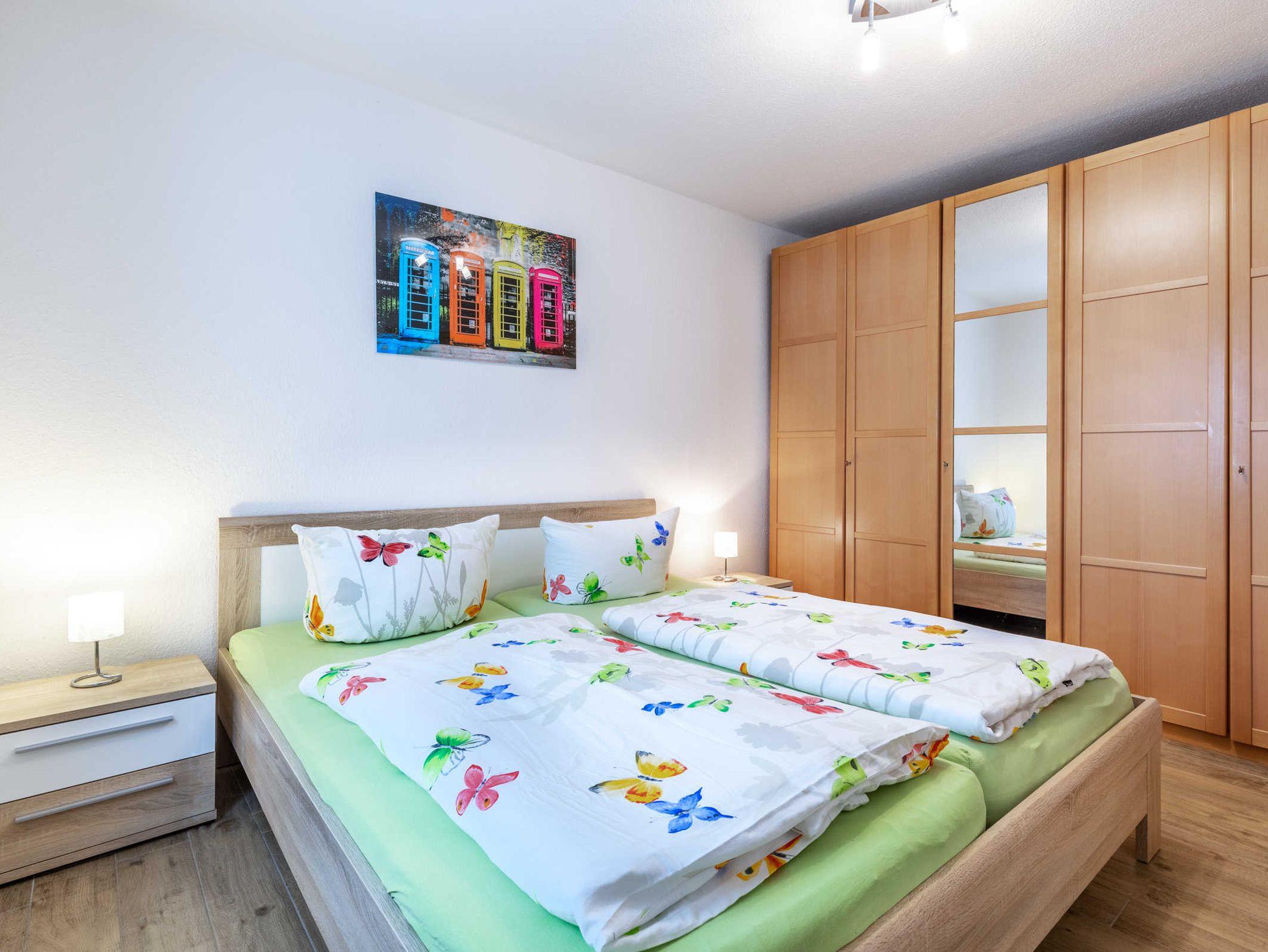Schlafzimmer mit Doppelbett (1,80 x 2m) und großem Kleiderschrank. Wohnzimmer mit gemütlicher Sitzecke (als Schlafsofa umfunktionierbar, 1,40 x 2 m ) und TV. Das Schlafsofa ist nur für Kinder bis 12 Jahren geeignet.