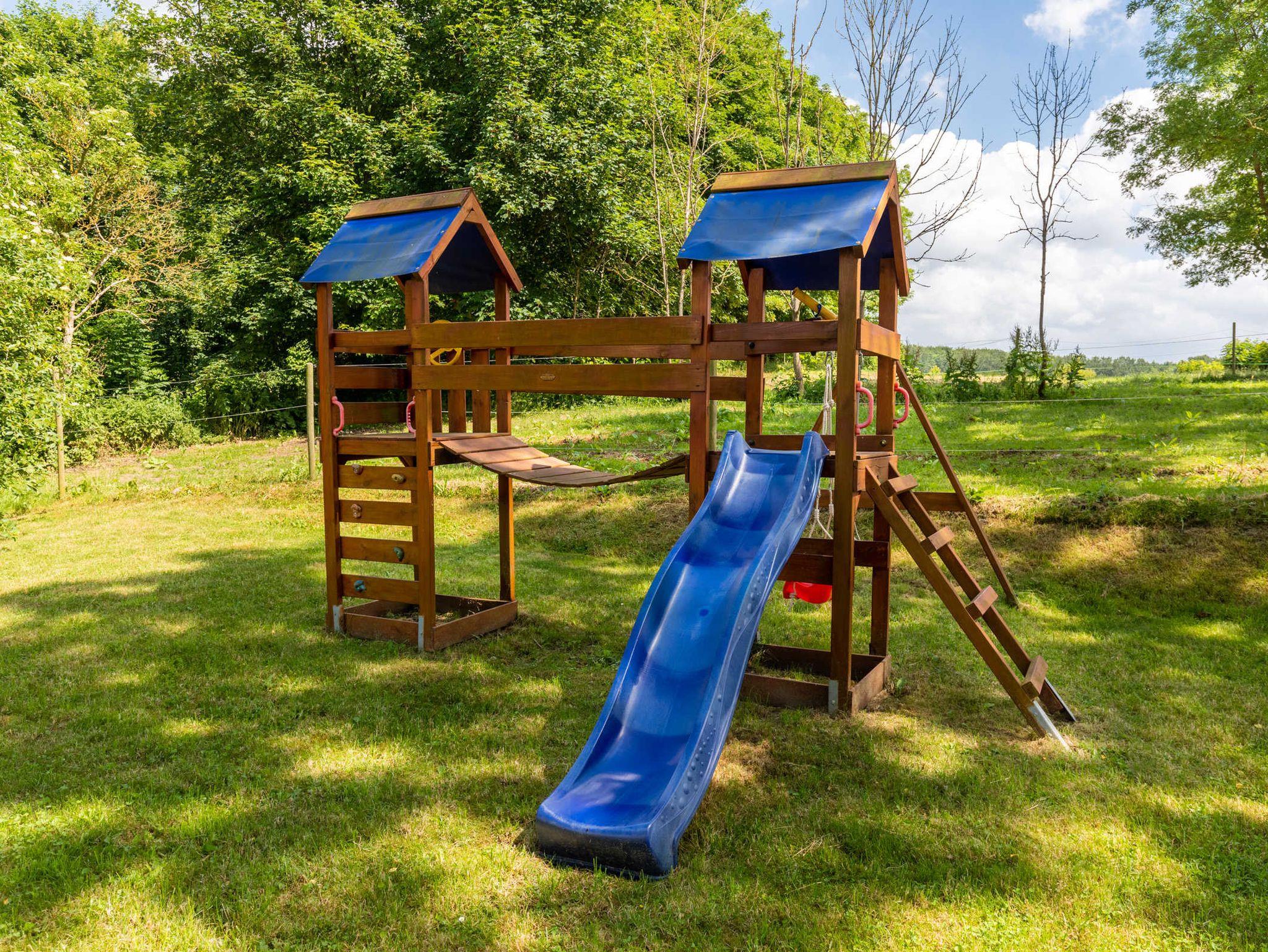 Spiel-und Bolzplatz im Ort, Kinderbett, Hochstuhl, Kinderwagen (zum Buggy umbaubar), Steckdosenschutz, Treppenschutzgitter, Spielgerät zum Klettern, Rutschen und Schaukeln im Garten. Die Pferde auf der angrenzenden Koppel dürfen gern gestreichelt und unter Anleitung geputzt werden. Nach Absprache können die Kinder auf dem Pferd geführt werden oder Reiten lernen. Dies auf dem nahegelegenen privaten Pferde- und Reiterhof. Auf Wunsch kann ein Babysitter Service kann organisiert werden.
