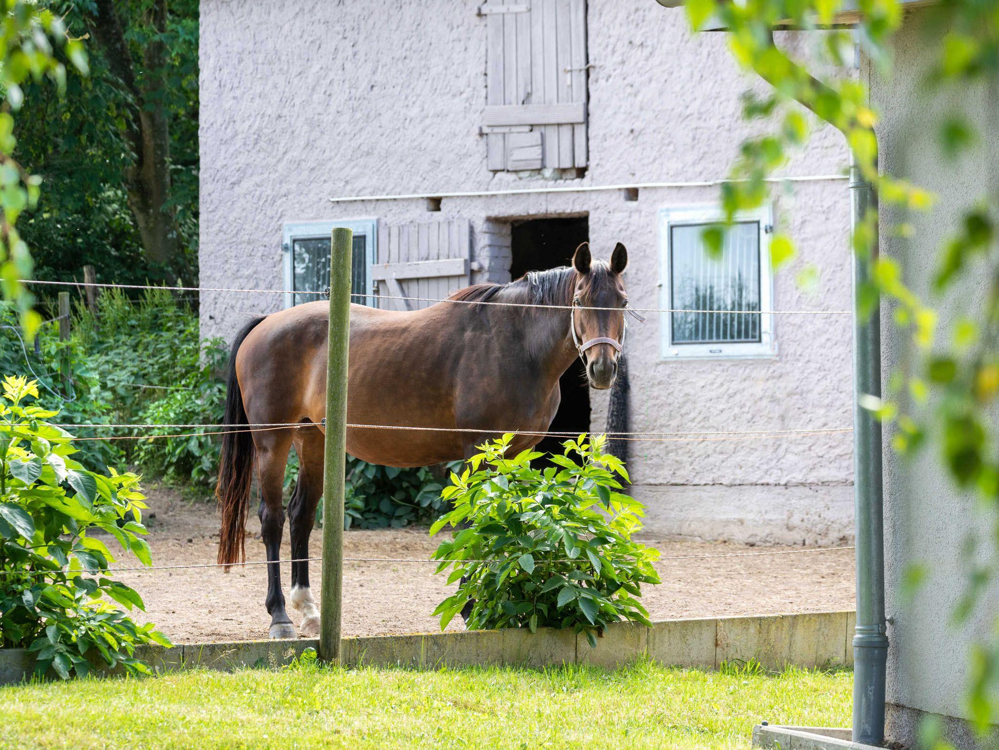 Am Haus: weitläufiger Garten mit Bäumen, Sträuchern, Spielplatz und Pferdekoppel. Parkplatz direkt am Haus. Abschließbarer Unterstellschuppen für Fahrräder oder Wassersportgeräte in Gemeinschaftsnutzung.