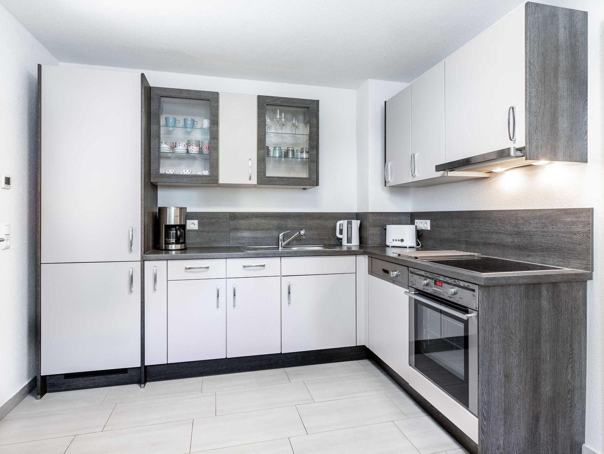 Im sonnigen Eingangsbereich der Haushälfte befindet sich der Esstisch. Die separate Küche ist umfangreich ausgestattet und verfügt über einen Geschirrspüler, 4- Platten Ceranherd, Backofen, Kühlschrank mit Gefrierfach, Mikrowelle, Kaffeemaschine und Wasserkocher. Das Bad ist mit Dusche, WC und Waschmaschine ausgestattet. Das Ferienhaus ist gefliest und wird über eine Fußbodenheizung beheizt.