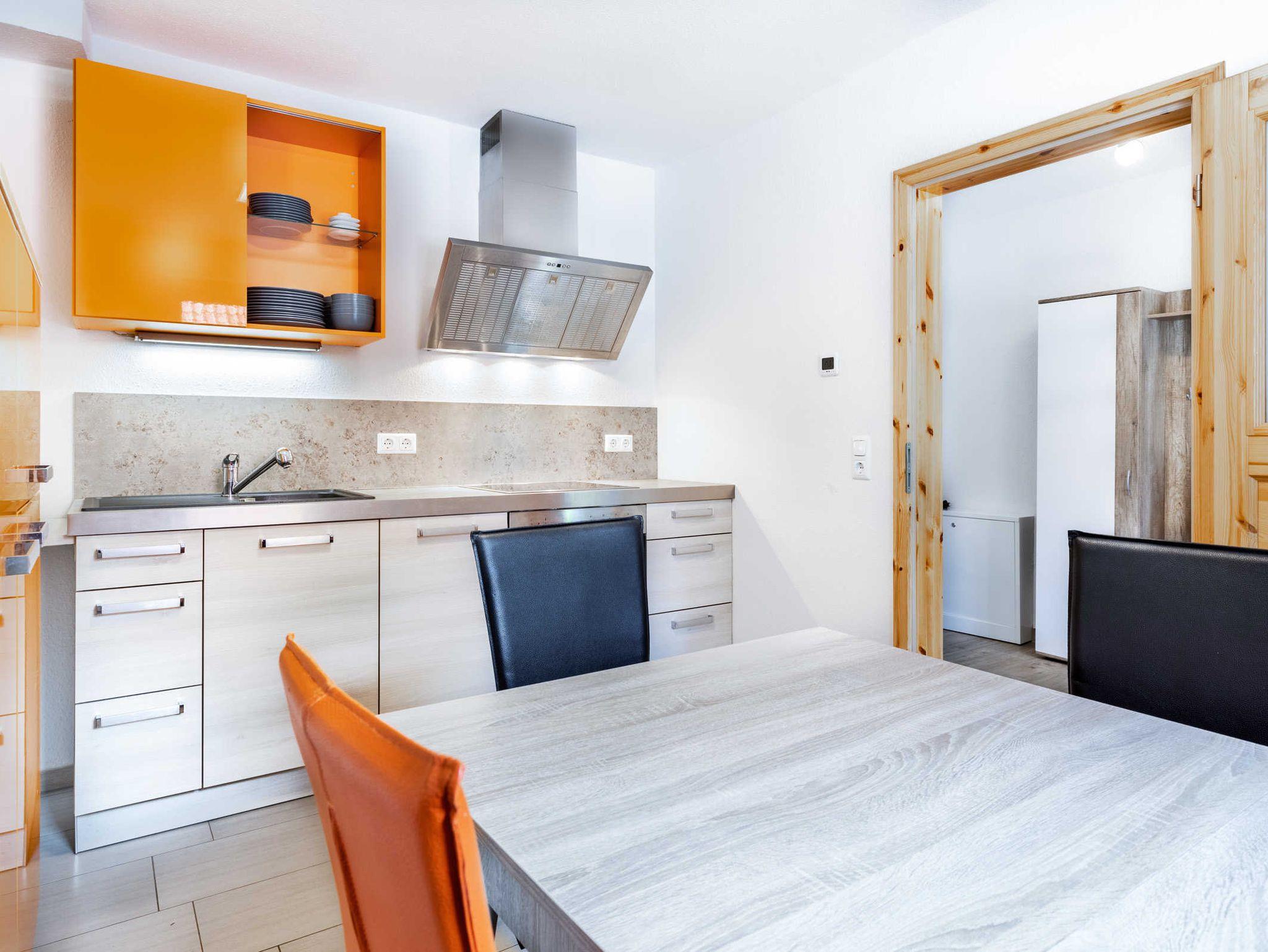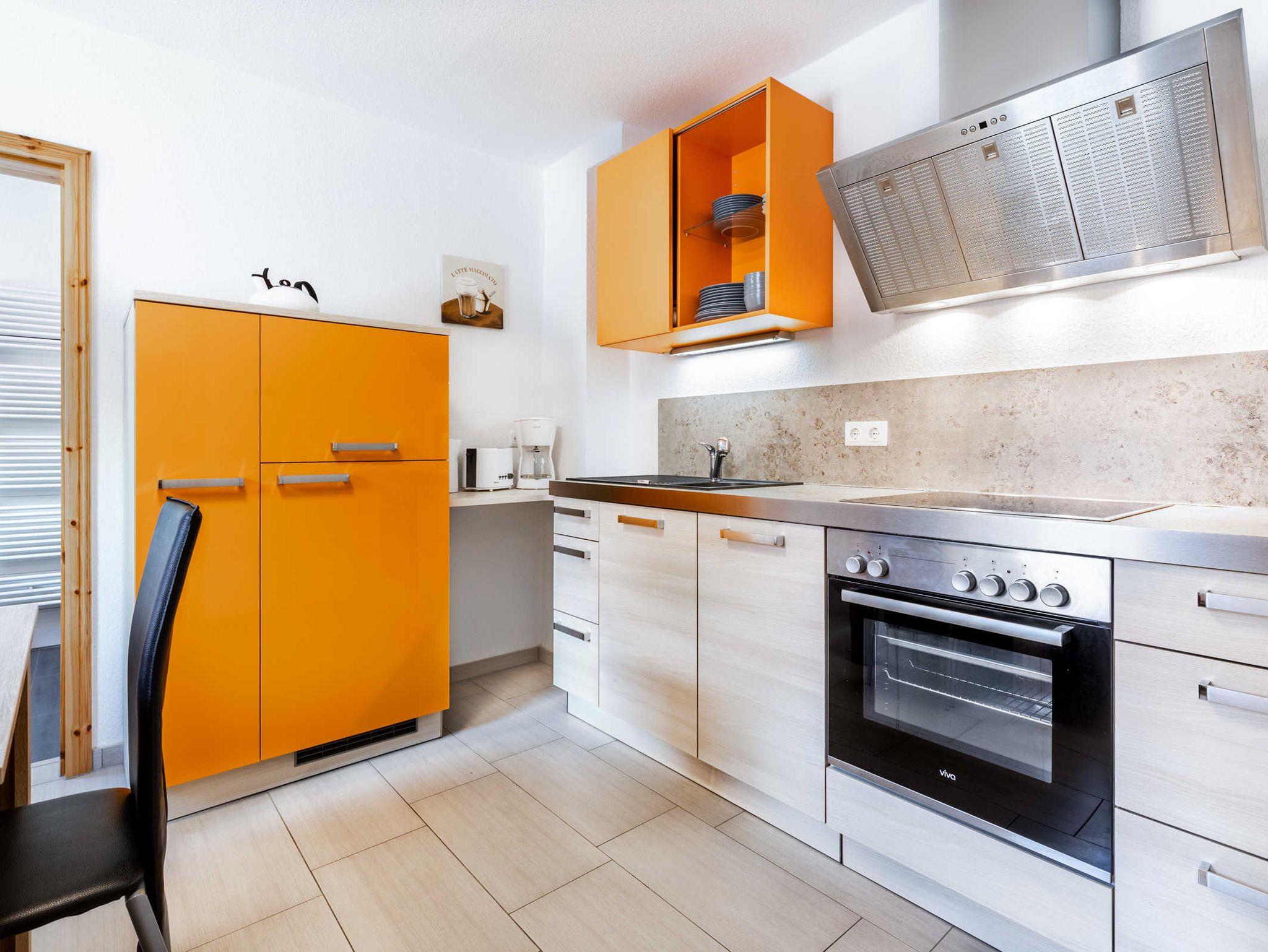 Die separate Küche ist umfangreich ausgestattet und verfügt über einen Geschirrspüler, 4- Platten Ceranherd, Backofen, Kühlschrank mit Gefrierfach, Mikrowelle, Kaffeemaschine und Wasserkocher sowie Esstisch. Das Bad ist mit Badewanne, WC und Waschmaschine ausgestattet.