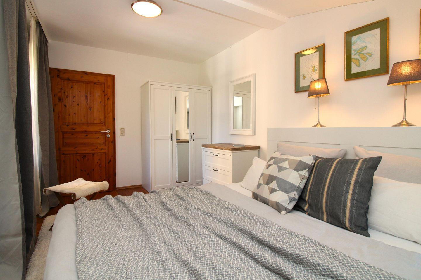 Das freundliche und geräumige 1. Schlafzimmer ist mit einem bequemen Doppelbett (Boxspringbett), einem Kleiderschrank sowie einer Kommode eingerichtet.