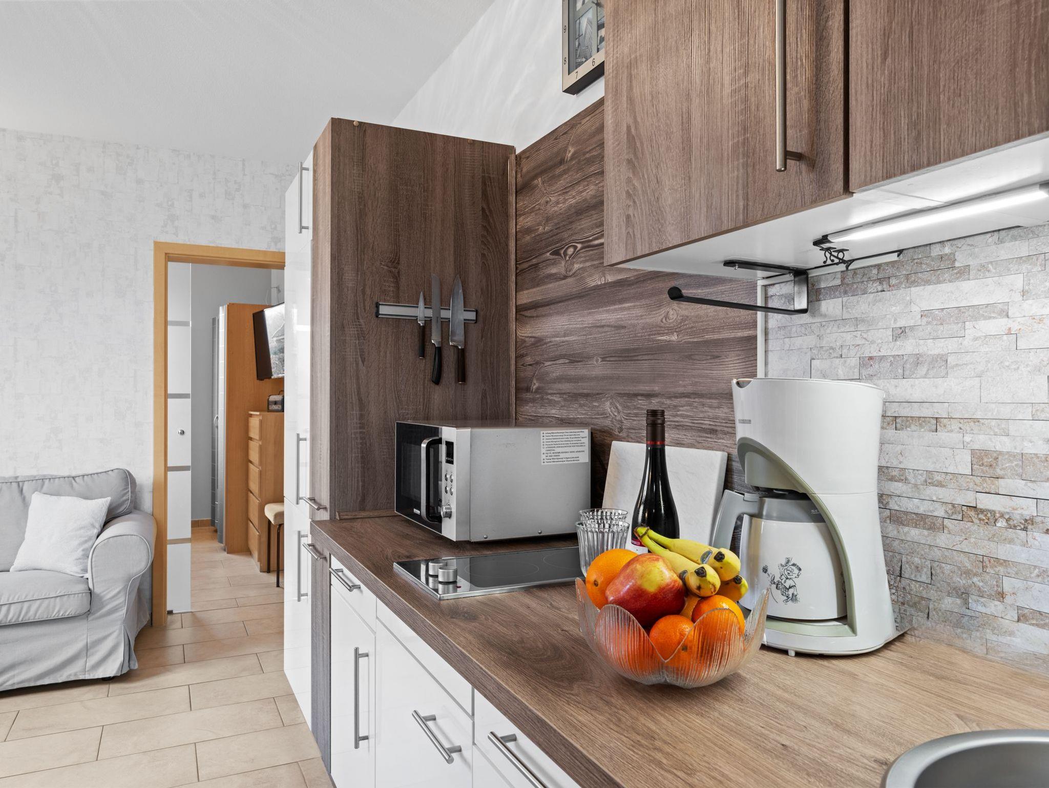 Die offene Küche ist das Herzstück unserer Wohnung. Sie finden hier einen Herd mit 2 Platten, einen Kühlschrank mit Gefriemöglichkeit, eine Mikrowelle, Wasserkocher, Eierkocher, Kaffemaschine sowie alle notwendigen Utensilien, um Ihre Lieblingsgerichte zuzubereiten. Die gesamte Wohnung ist mit einer Fussbodenheizung ausgestattet.
