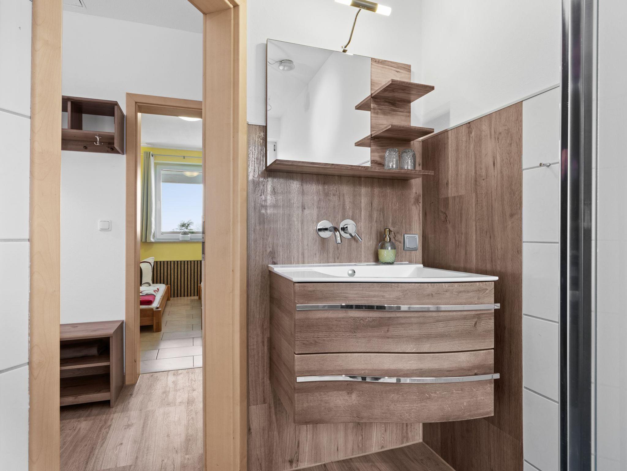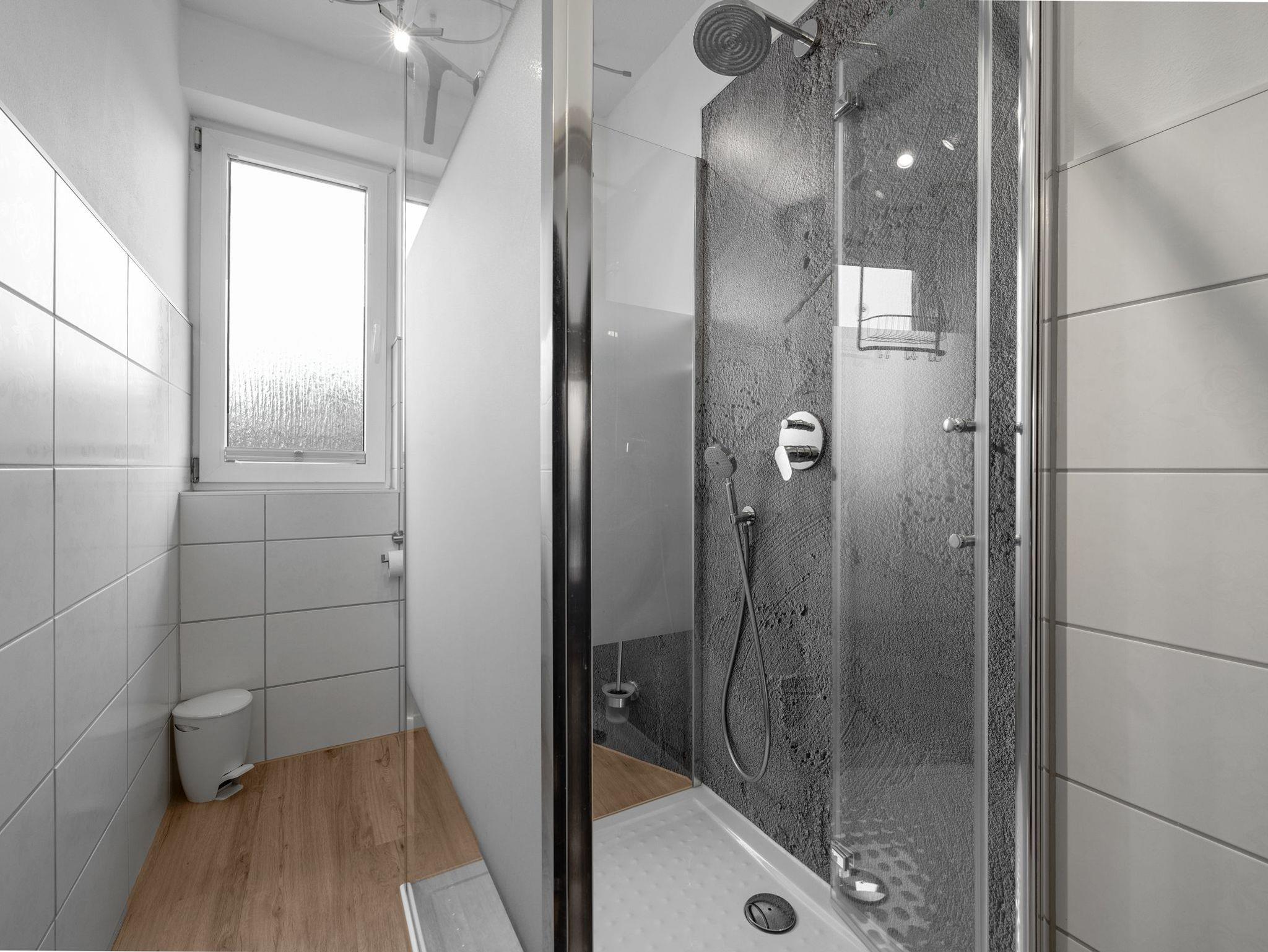 Das Badezimmer mit Fenster ist modern gestaltet und verfügt über eine ebenerdige Dusche, die Ihnen nach einem langen Tag Erholung bietet.