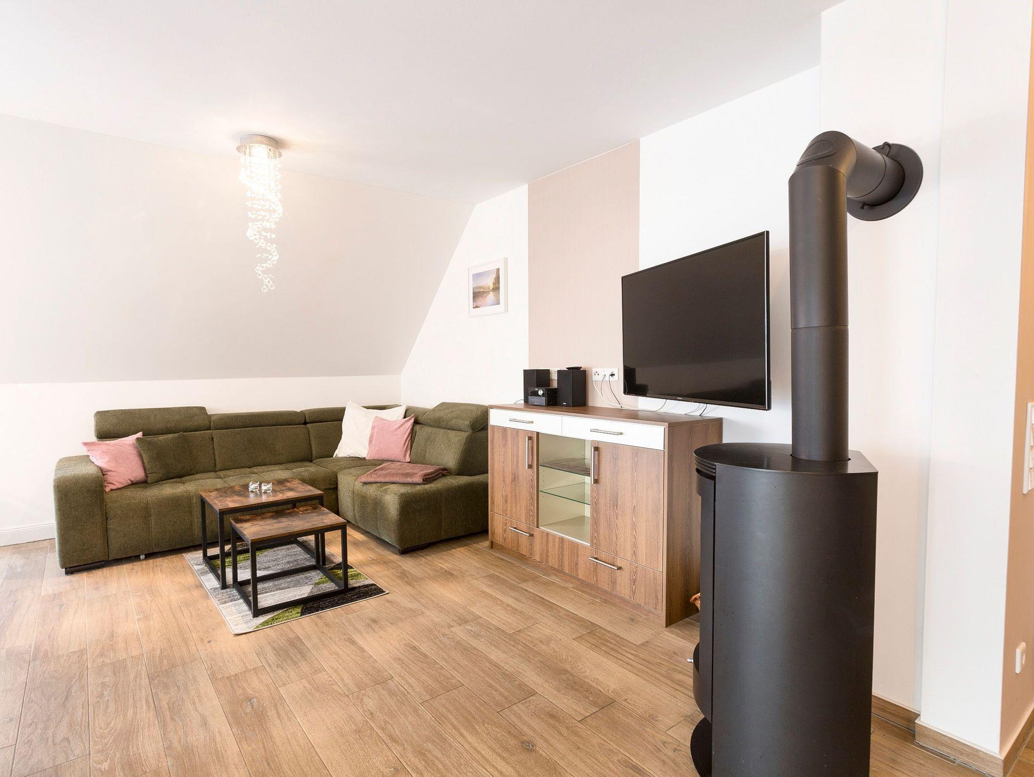 Die zwei Ferienwohnungen im Obergeschoss verfügen jeweils über einen Wohnraum mit integriertem Küchen- und Essbereich und Kaminofen, vier separaten Schlafzimmern mit Balkonen und drei Bädern. Die Ferienwohnung Usedom hat einen 40m² großen Saunabereich mit Dusche, Ruheliegen und Balkon.