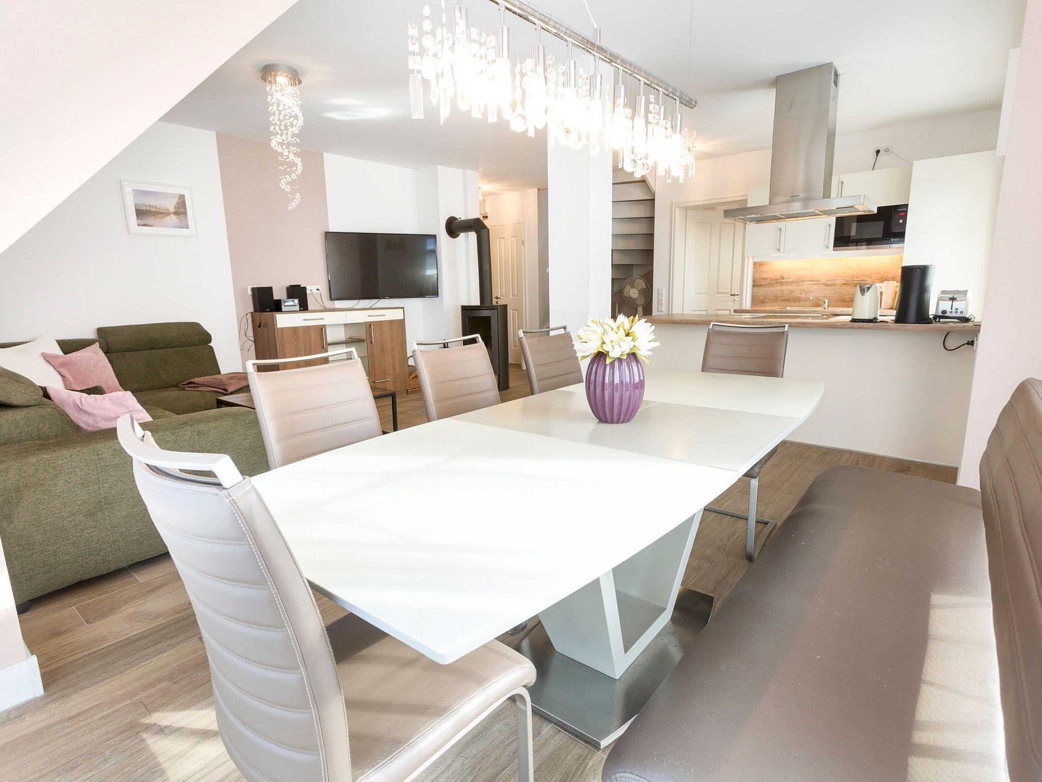 Im großzügigen Wohnbereich erwarten Sie eine gemütliche Wohnlandschaft, Kamin, Smart-TV, eine offen gestaltete Küche sowie ein großer Esstisch. Die Küche ist umfangreich ausgestattet mit Kühlschrank, Gefrierschrank, Ceran-Kochfeld, Backofen, Spülmaschine, Mikrowelle, Kaffeemaschine, Wasserkocher, Toaster und alle den kleinen Dingen des täglichen Bedarfs. Weiterhin befindet sich an den Küchenbereich angeschlossen ein kleiner Balkon.