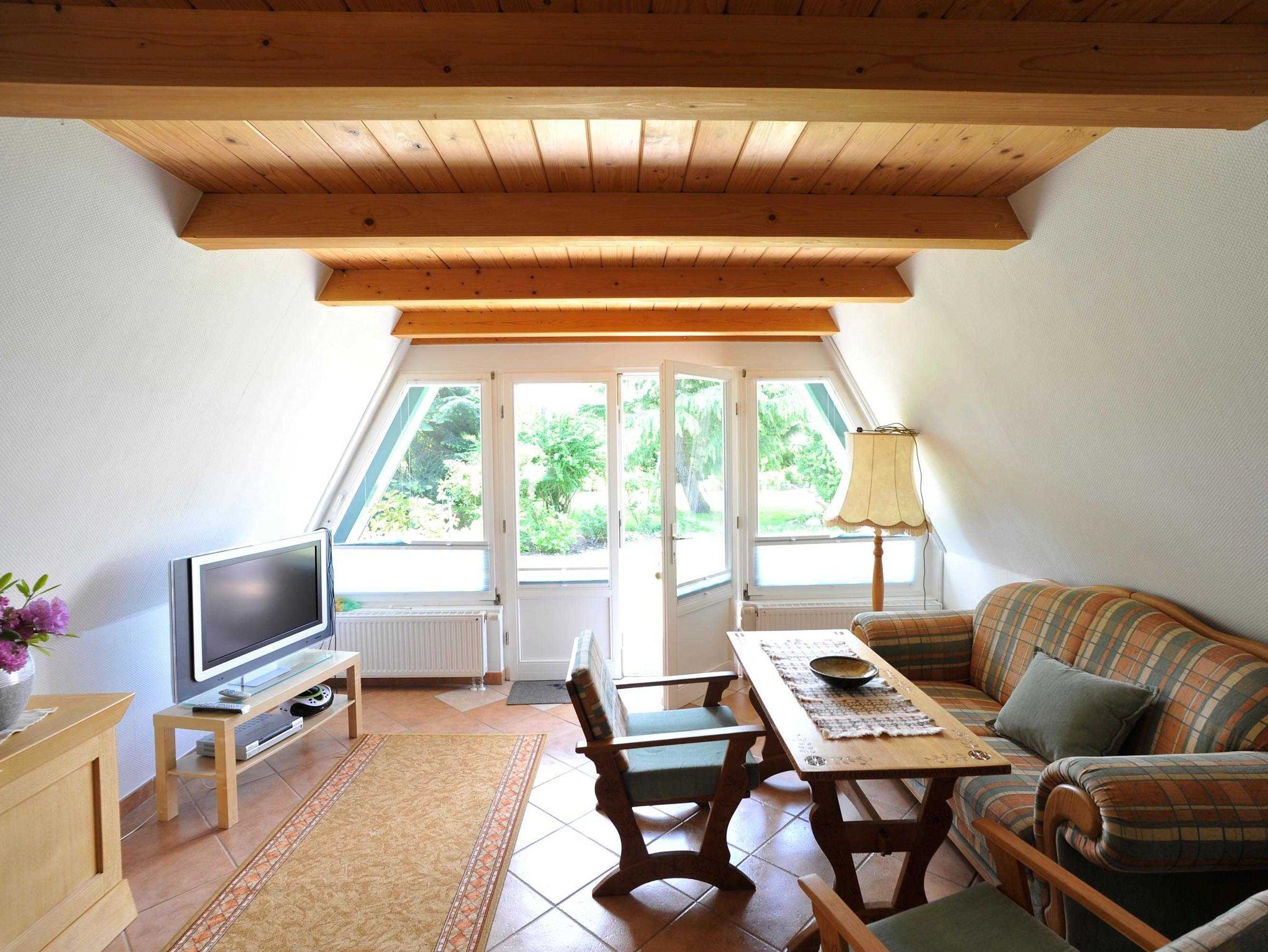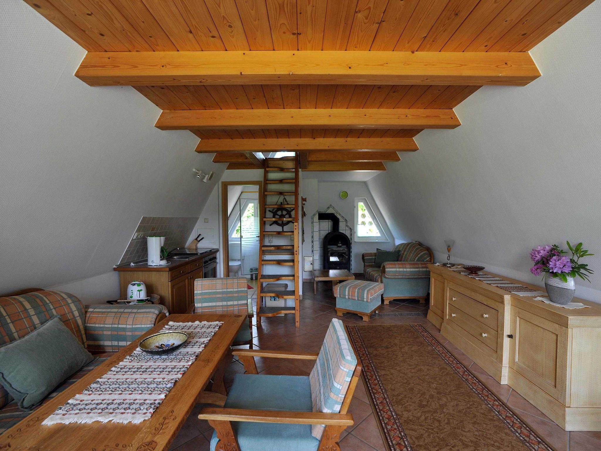 Im oberen Bereich, erreichbar über eine schmale Holztreppe befindet sich ein offener Schlafboden mit 4 Einzelbetten (90x210), welche sich gegenüber stehen. Bei Bedarf können zwei Betten zusammengeschoben werden.