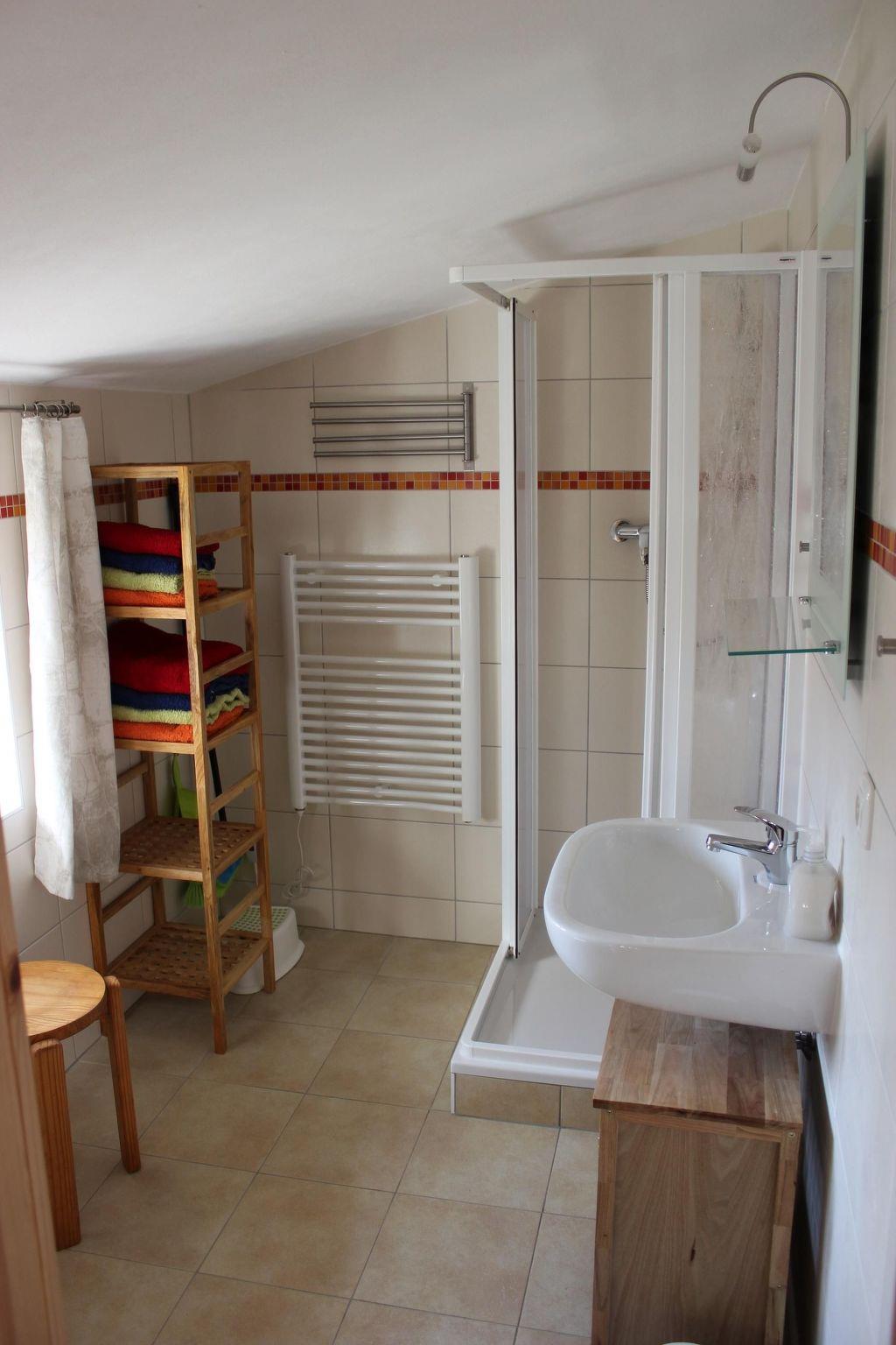It is located on the upper floor in the renovated outbuilding of our farm and offers space for two adults and two children.