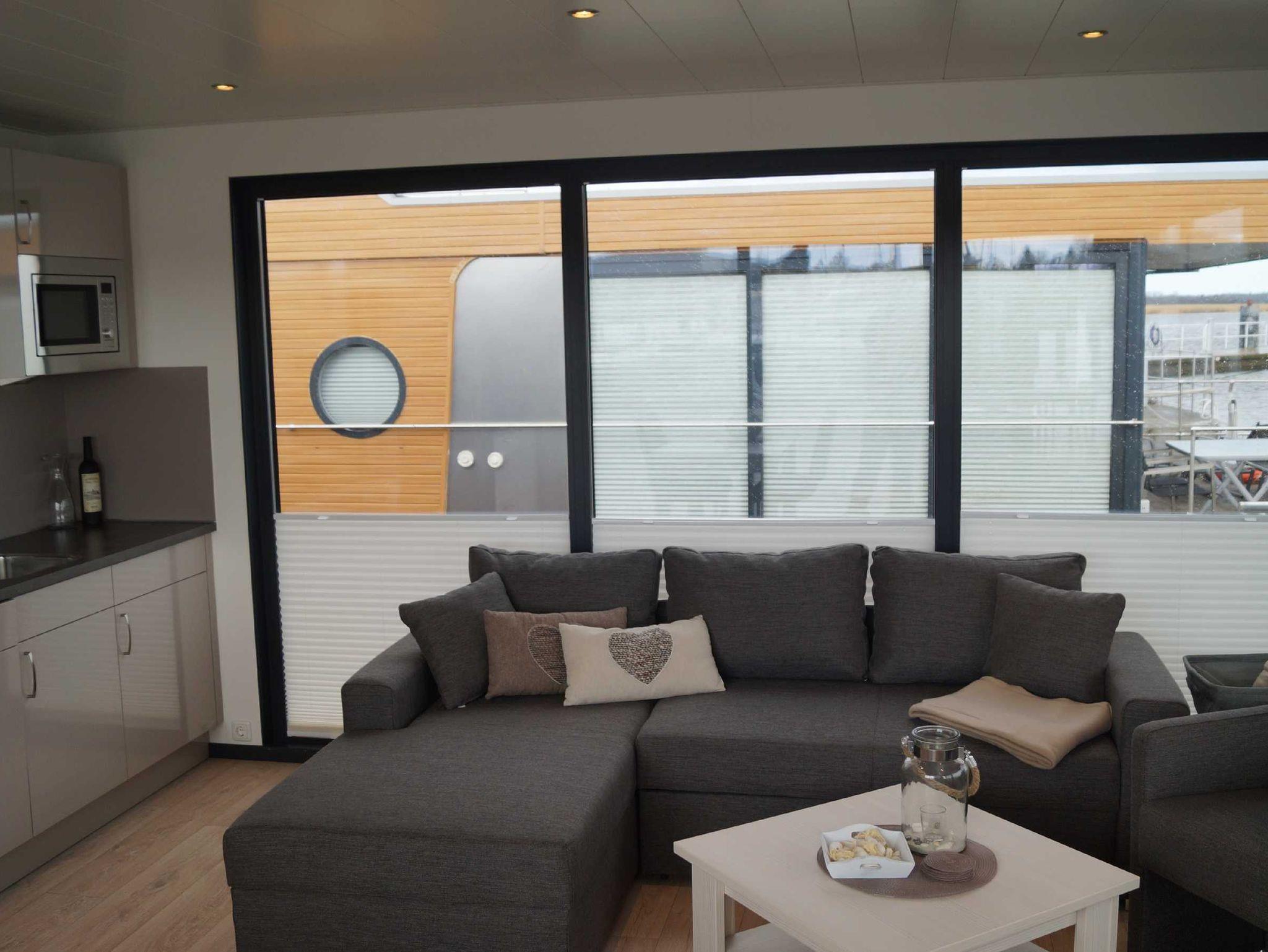 Auf einer Grundfläche von insgesamt etwa 50 m² befinden sich der Wohnraum mit offener Wohnküche, die Terrasse und weitere Lauffläche im Außenbereich des Hausbootes, 2 Schlafzimmer, ein Bad mit Dusche und ein WC mit Waschtisch. Auf der oberen Etage befindet sich die zusätzliche Sonnenterrasse. In der Küche finden Sie Kühlschrank mit Gefrierfach, Spülmaschine, Mikrowelle, Kaffeemaschine. Im Wohnzimmer sorgt neben dem Fernsehr auch CD und DVD Player für Unterhaltung.