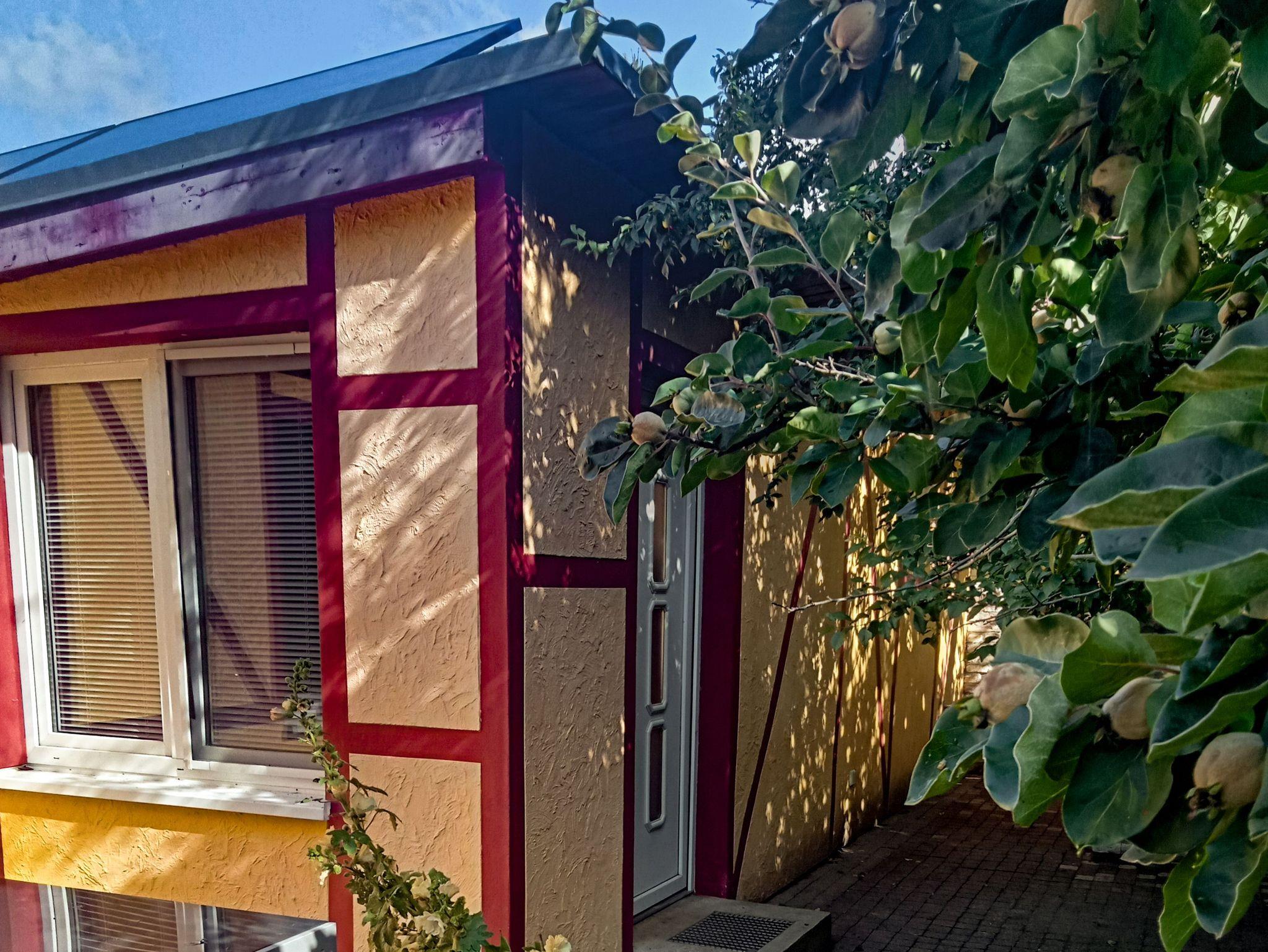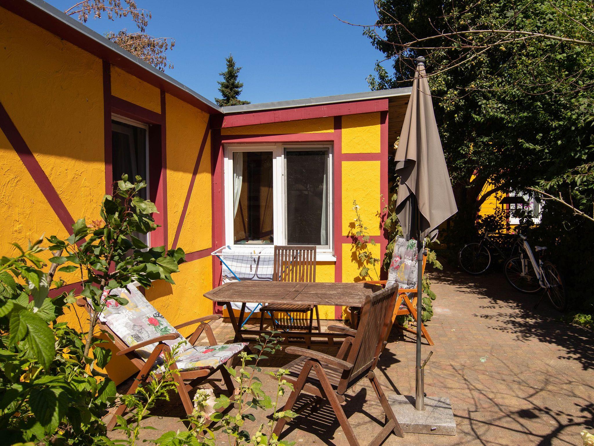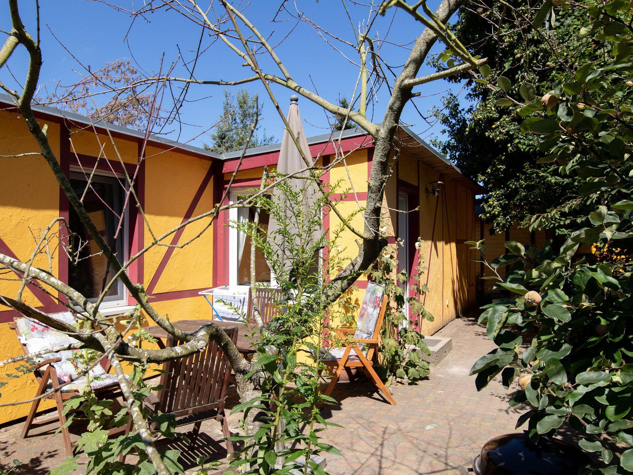Die eigene Terrasse mit Gartenmöbeln und Sonnenschirm lädt bei schönem Wetter zum Frühstück im Freien oder einem entspannten Abend ein. Gäste können das kostenfreie WLAN nutzen und bei Bedarf lässt sich im Schlafzimmer ein mitgebrachtes Kinderreisebett aufstellen. Der Hund der Vermieter lebt auf dem Grundstück und bewegt sich frei im Garten.
