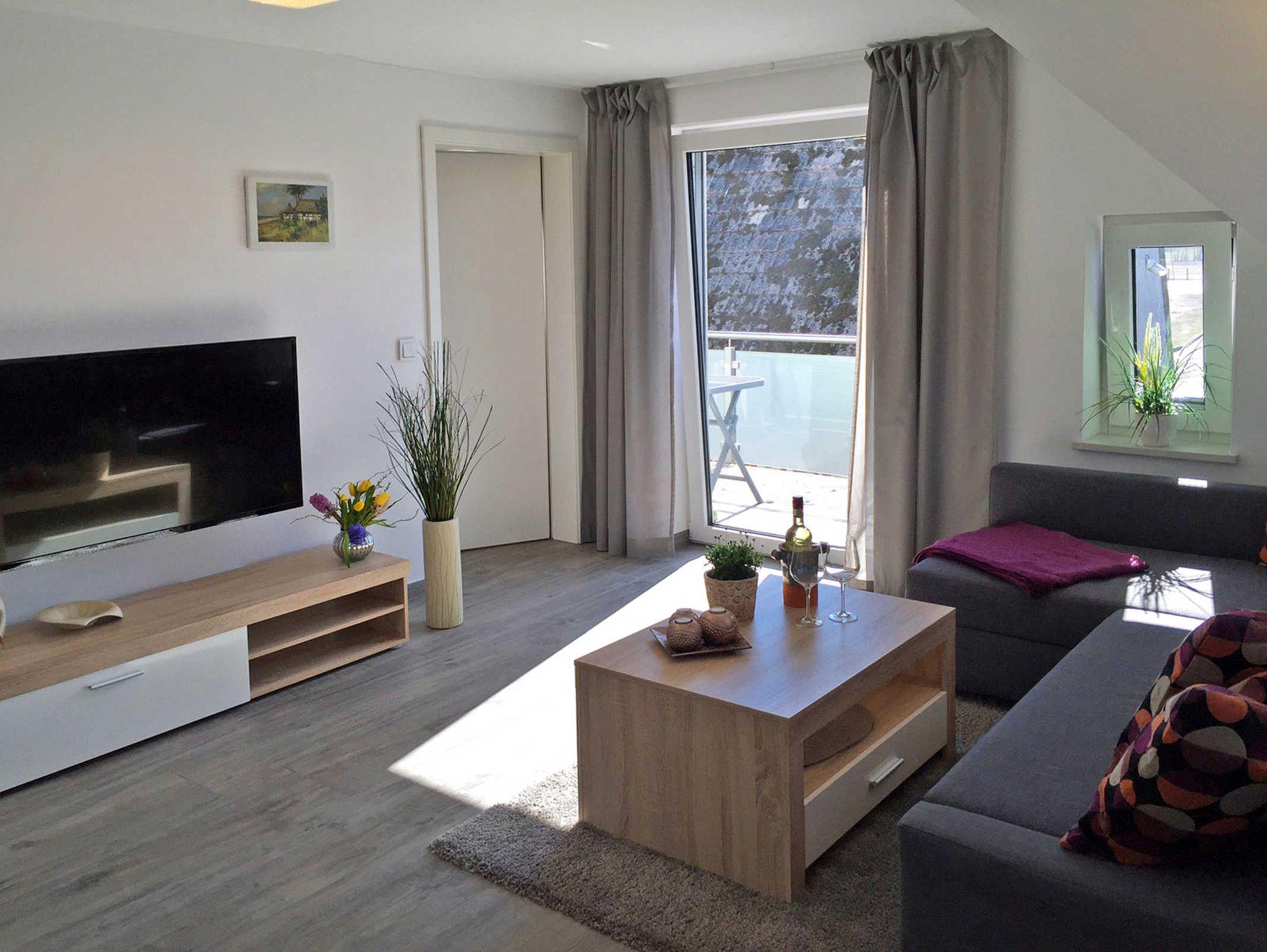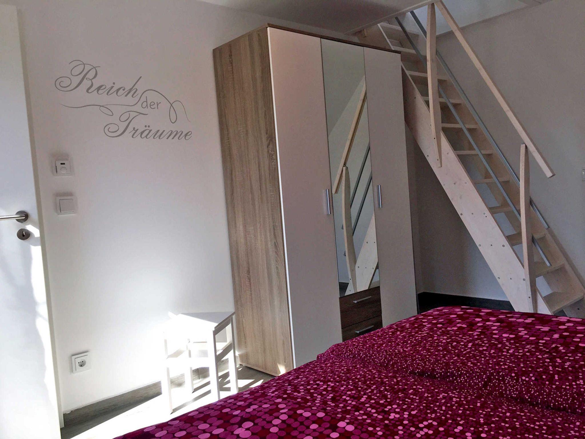 Die 57m² Ferienwohnung befindet sich in der oberen Etage eines Geschäftshauses (in der unteren Etage ist ein Kosmetikstudio). Die Ferienwohnung verfügt über ein Wohnzimmer mit Zugang zum Balkon, Schlafcouch (140x190), TV und eine offene Küche mit Essbereich. Die offene Küche ist mit Kühlschrank/Gefrierfach, Geschirrspüler, Backofen, Herd, Toaster, Kaffeemaschine etc. ausgestattet. Im Schlafzimmer befindet sich neben einem weiteren Zugang zum Balkon, dem großen Doppelbett (180x200; getrennte Matratzen) und dem Kleiderschrank eine Treppe, die in das Dachgeschoss führt. Hier wurde eine zweite Schlafebene mit zwei Einzelbetten (90x200) eingerichtet, welche ideal für Kinder wäre (Deckenhöhe 1,65m!). Internet-WLAN ist kostenlos vorhanden.