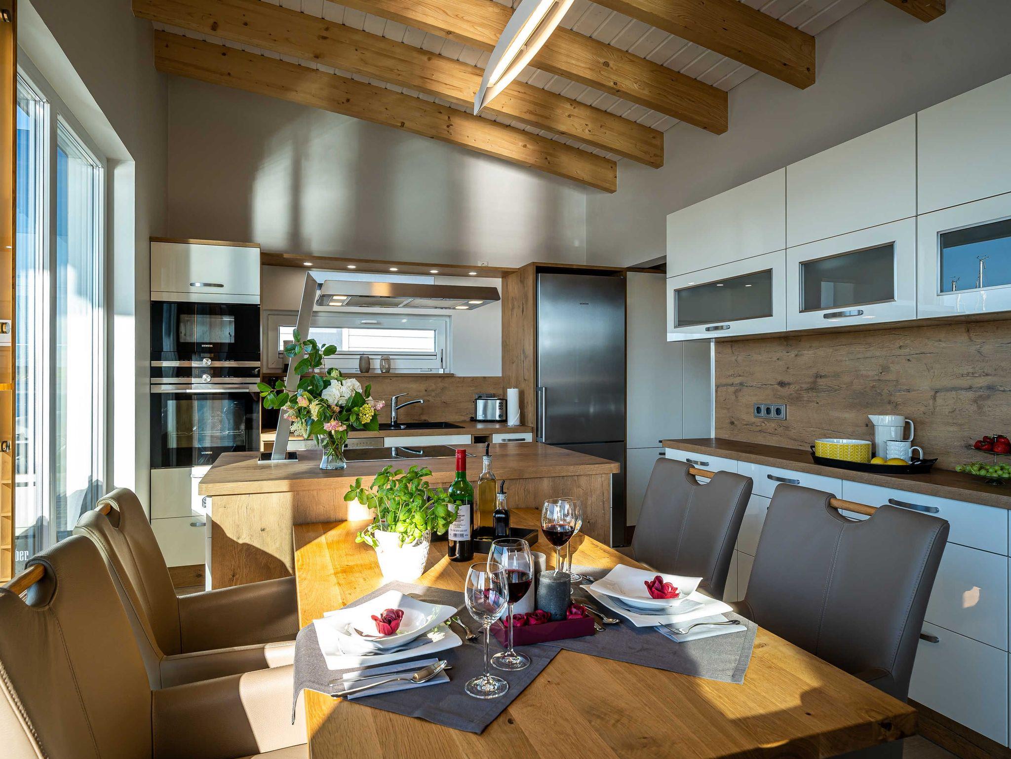 Die Küche verfügt über jeglichen Komfort: Backofen, Herd, Mikrowelle, Spülmaschine, Kühlschrank mit Gefrierfach, Kaffeemaschine, Wasserkocher und Toaster gehören zu unserer Standardausstattung. Im Wohnzimmer erwartet Sie ein fast 180 Grad Panoramafenster, ein Flachbildschirm mit DVD Recorder, eine Musikanlage und ein kostenloser W-LAN Zugang.