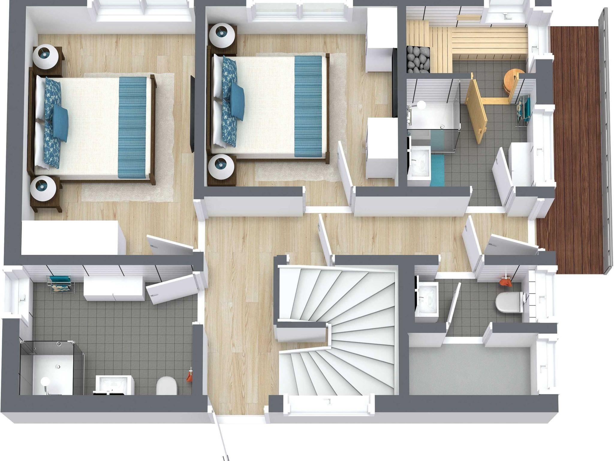In der unteren Etage befinden sich 2 Schlafzimmer mit Boxspringbett. Jedes Schlafzimmer verfügt über ein Bad en Suite.