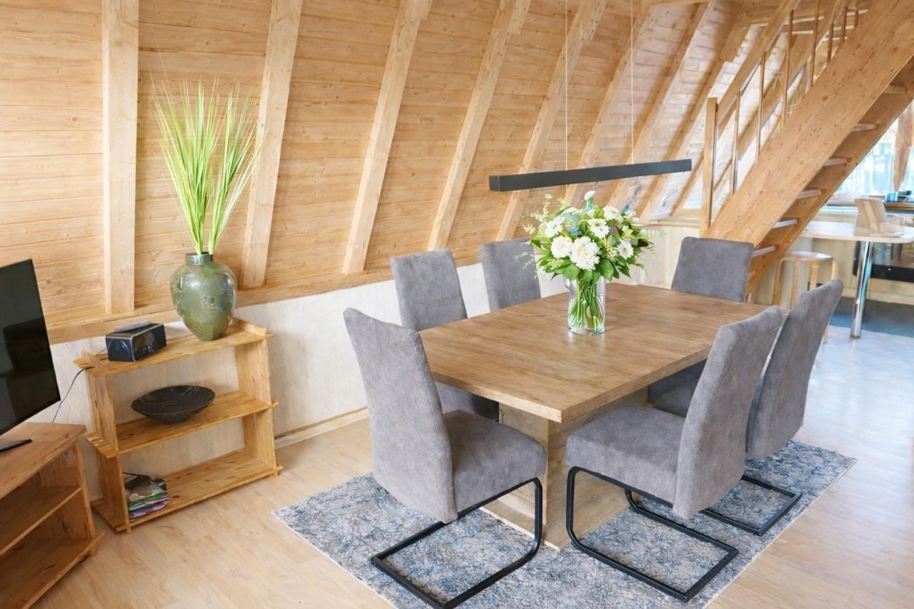 Das Ferienhaus ist ein Holzhaus, mit einem Schrägdach Auf zwei Etagen, mit Sonnenterrasse und Balkon. Das Besondere an diesem Haus ist die Bauform und die wunderbare Ausstattung, die keine Wünsche offen lässt. Das i-Tüpfelchen ist die hauseigene Sauna, die zum entspannen einlädt.