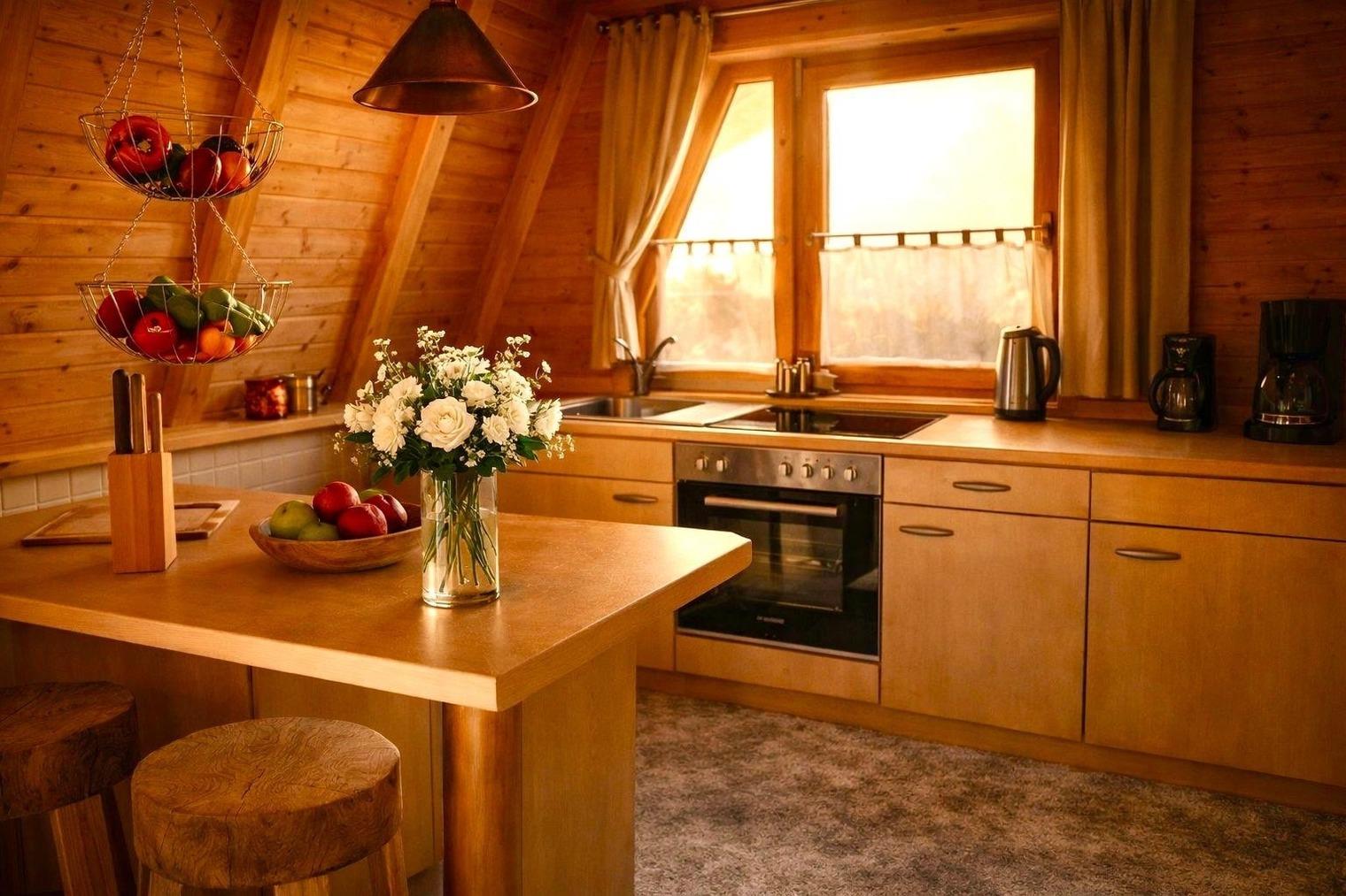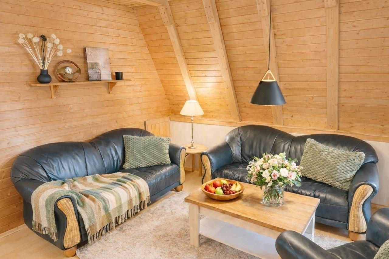 Das komfortabele Finnhütten Ferienhaus (Schrägdachbauweise) hat einen offenen Wohn - und Essbereich, mit einer offenen Küche. Die Küche ist komplett eingerichtet, mit Kühlschrank, Spülmaschine, Waschbecken und einer kleinen Küchenbar. Der Wohnbereich mit Esstisch und sechs Stühlen sowie einer Couch mit Sessel. Die Einrichtung ist sehr gemütlich
