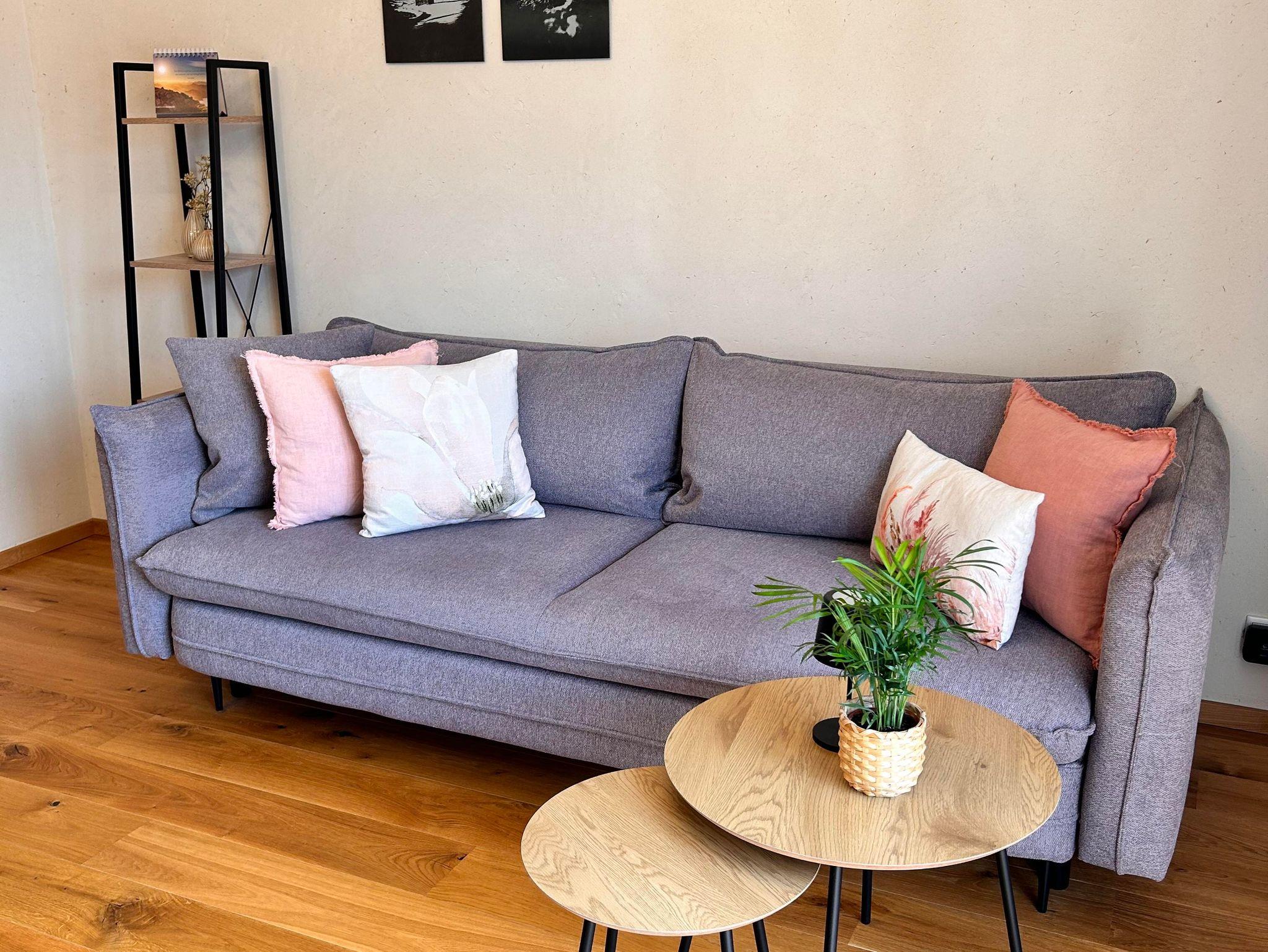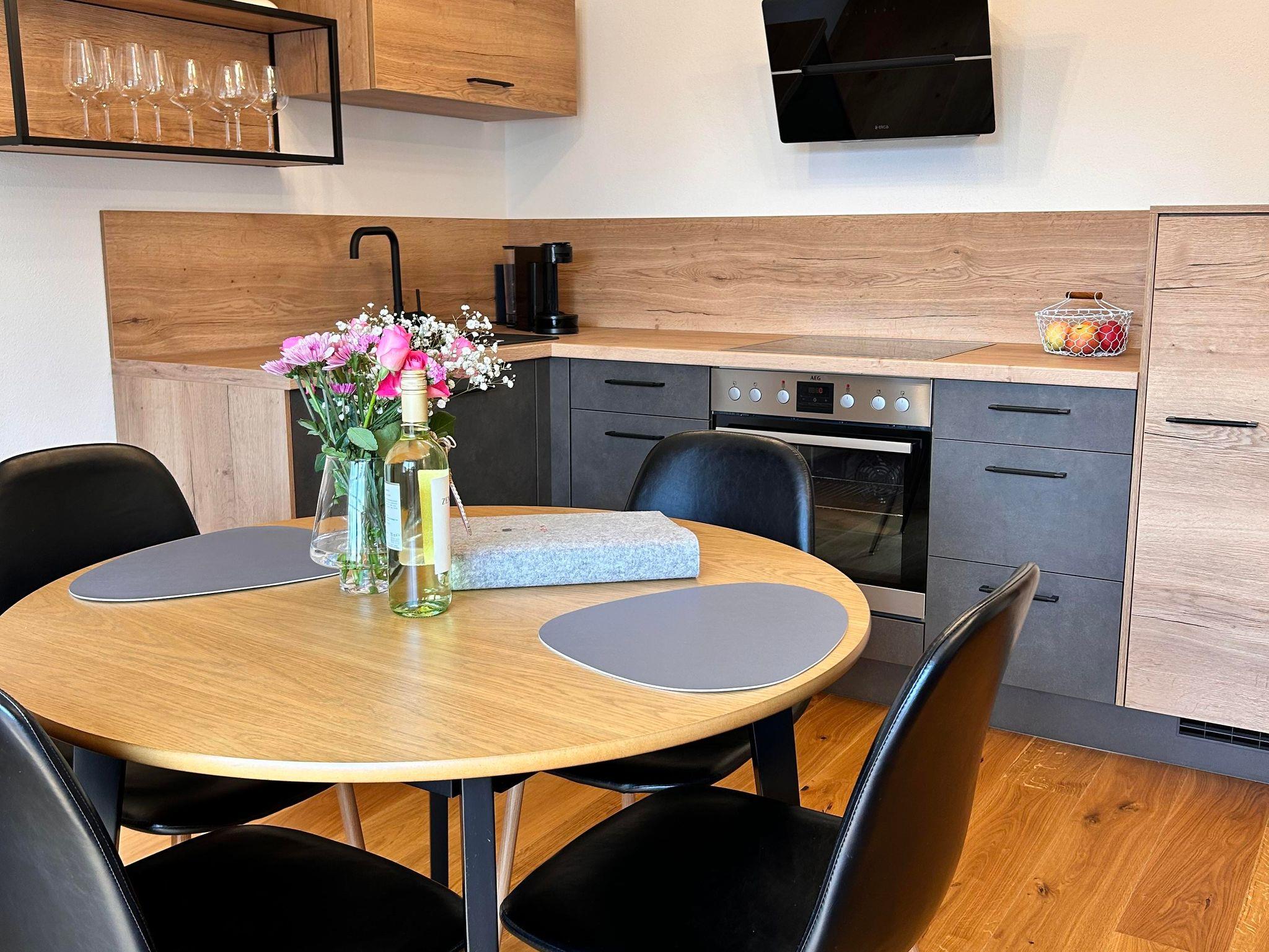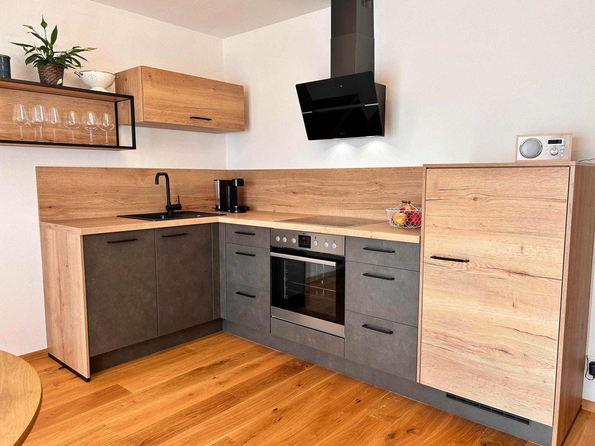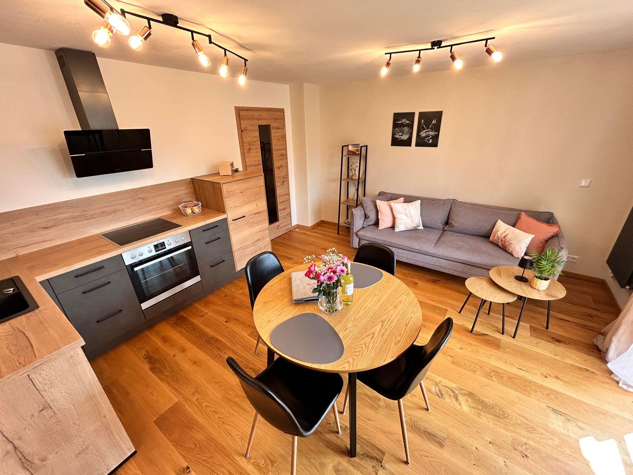 Die gemütlich Wohnküche mit großer Schlafcouch läd zum verweilen ein. Ausgestattet mit 55 Zoll Flat - TV und Internetradio. Die Küche ist komplett ausgestattet und verfügt zudem über einen Backofen und einem Geschirrspüler. Genießen Sie die Abendsonne auf dem Balkon mit wunderschönem Bergblick.