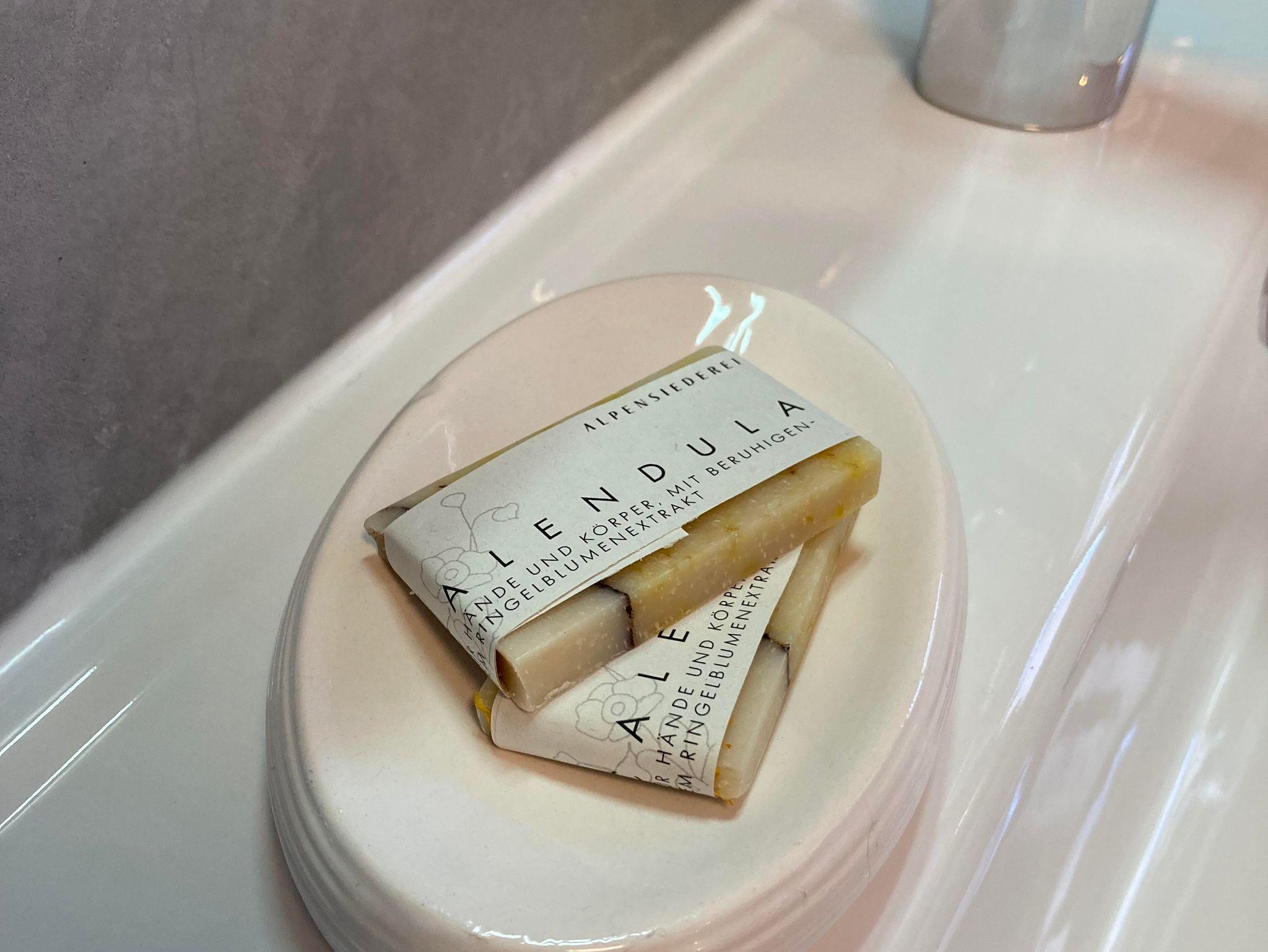 Über das Schlafzimmer, das mit einem großen Boxspringbett ausgestattet ist, gelangt man ins Badezimmer. Ausgesattet mit Handtüchern, Fön und Seife sowie Kosmetikspiegel.