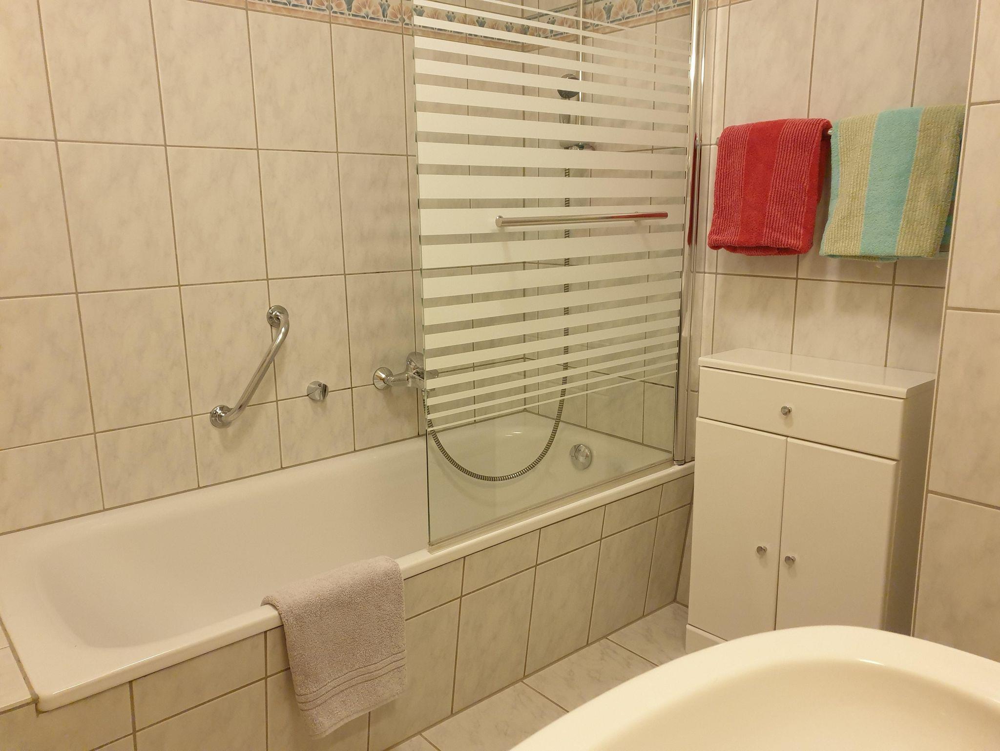 Das Badezimmer ist mit WC, Waschbecken und Badewanne mit Duschvorrichtung ausgestattet.
