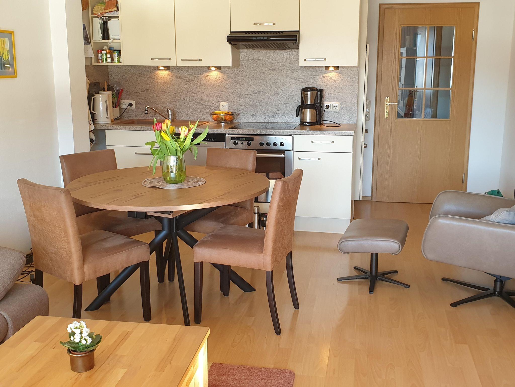 Es gibt eine komplett ausgestattete Küchenzeile und einen großen Esstisch.