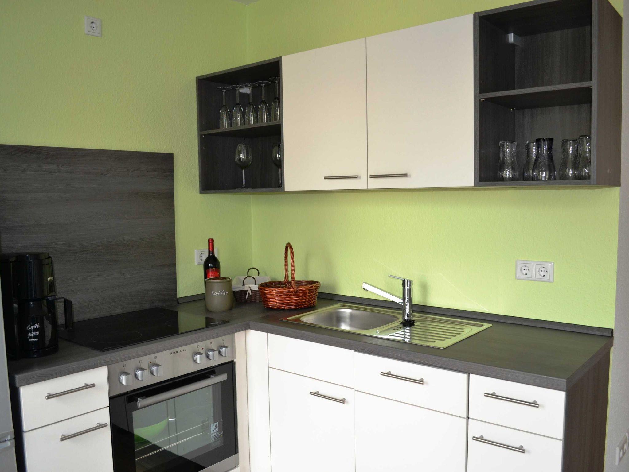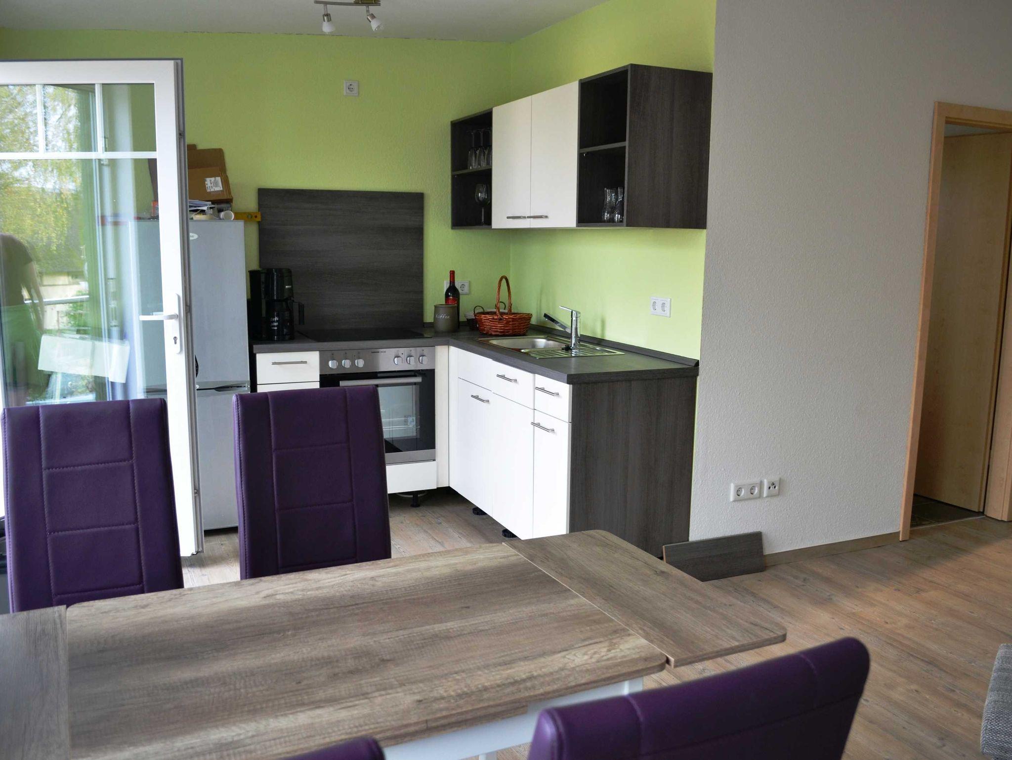 Die Ferienwohnung hat eine offene Küche und ist mit einer neuen Einbauküche ausgestattet. Vom Wohnzimmer mit Essbereich haben Sie einen schönen Blick auf den See. In einem Schlafzimmer befindet sich ein Doppelbett, das zweite Schlaftimmer hat ein Bett zum Ausziehen.