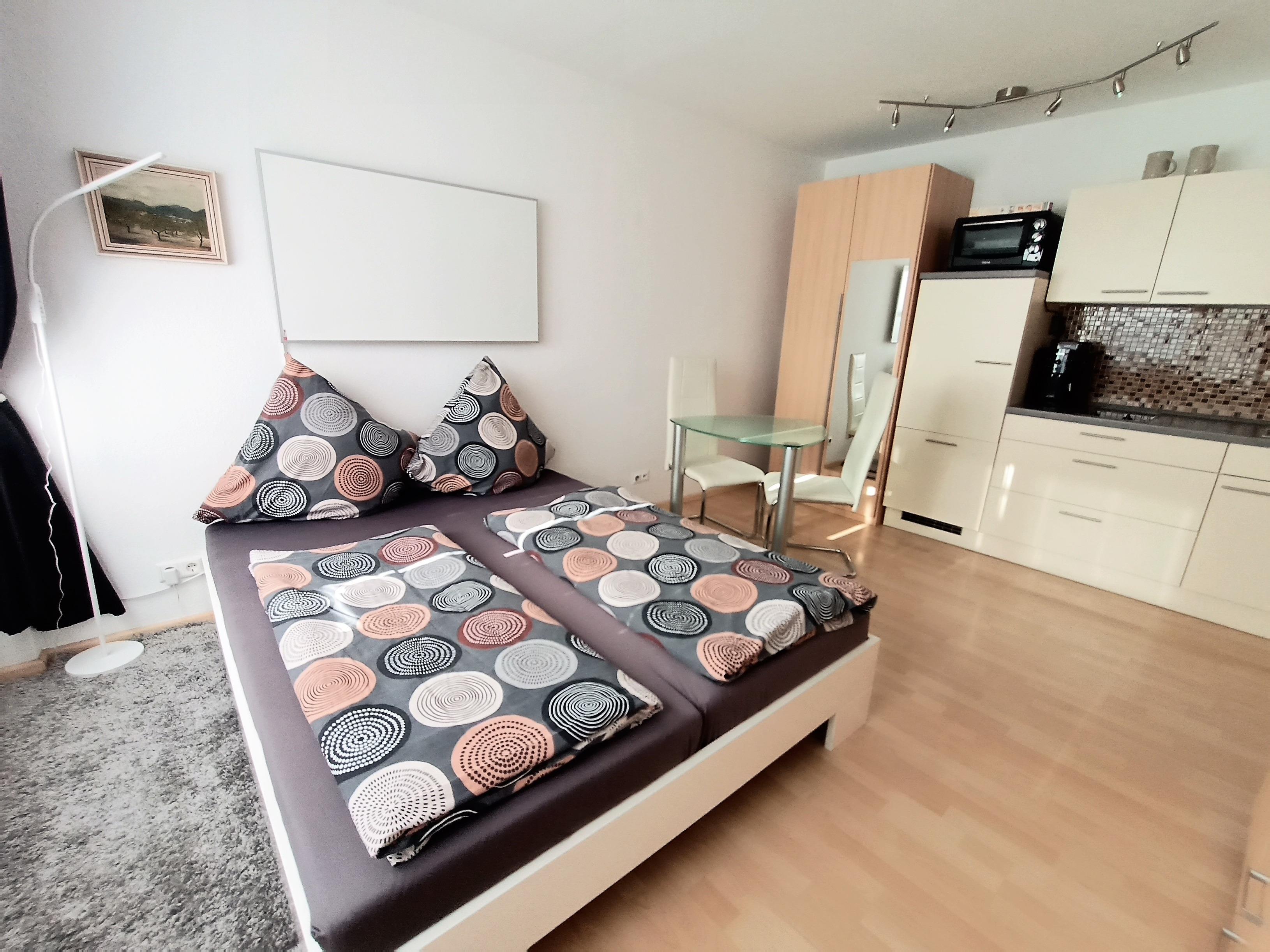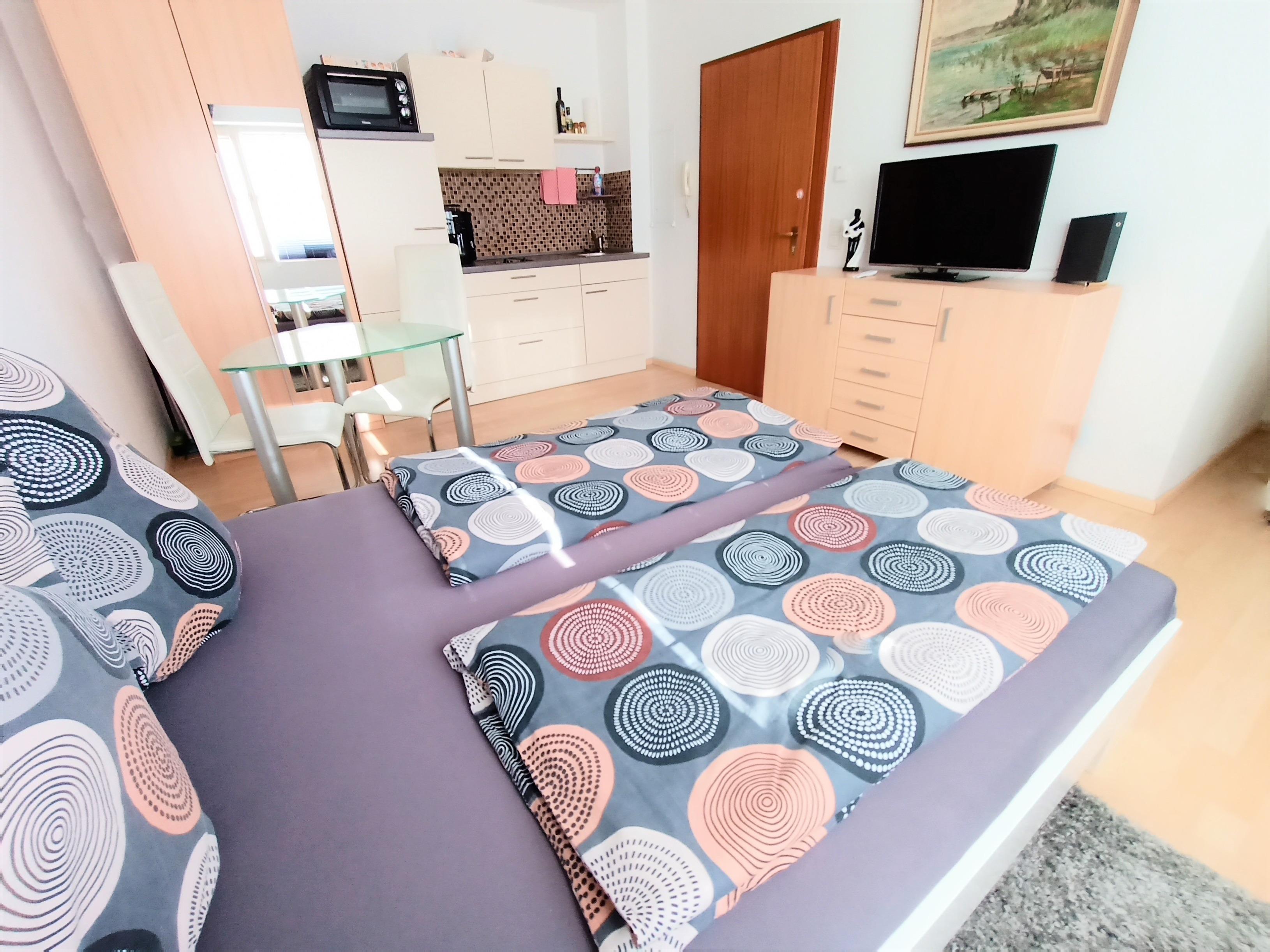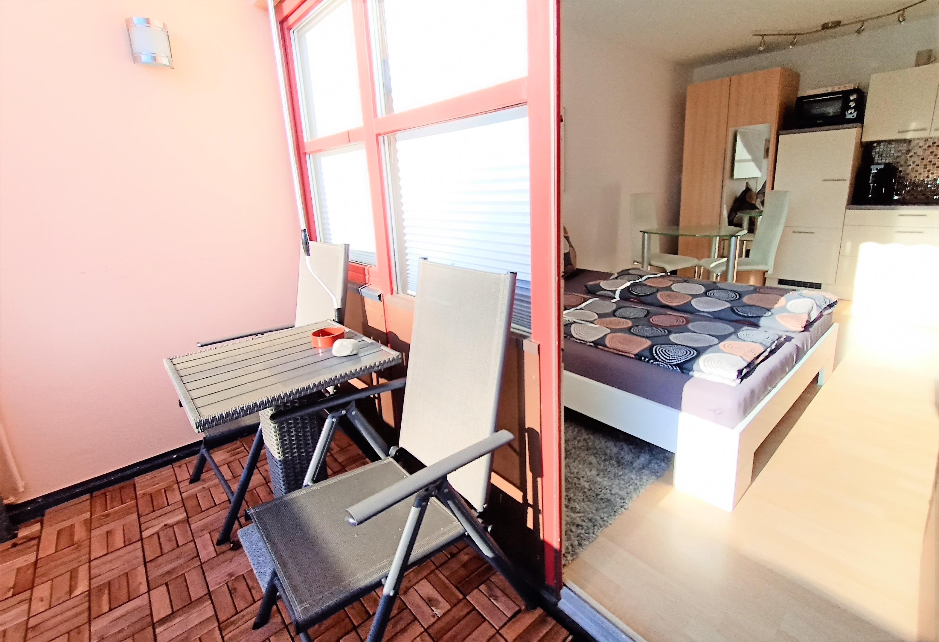 Das Apartment verfügt über einen kombinierten Wohn-Schlafraum mit Doppelbett, Essplatz als Sitzgelegenheit, Küchenzeile und neu renoviertes Badezimmer. Sie halten sich gerne auf dem überdachten Balkon auf und haben dort zusätzliche Sitzmöglichkeit. Das moderne Badezmimmer verfügt über Dusche und WC. Die Küchenzeile ist ausgestattet mit einem 2-Platten-Herd, Kühlschrank, Kaffeevollautomat, Wasserkocher, Toaster und Grillofen.