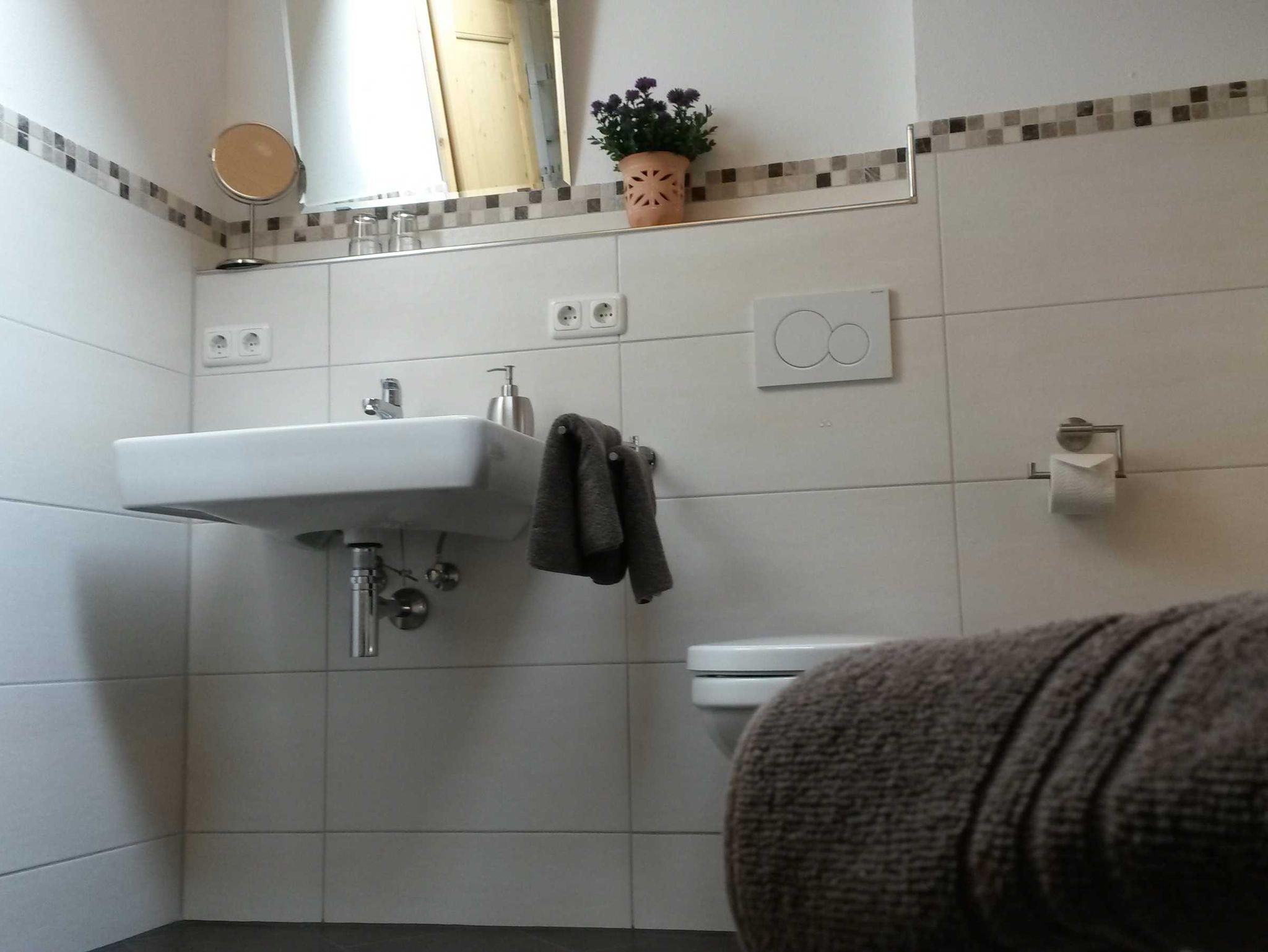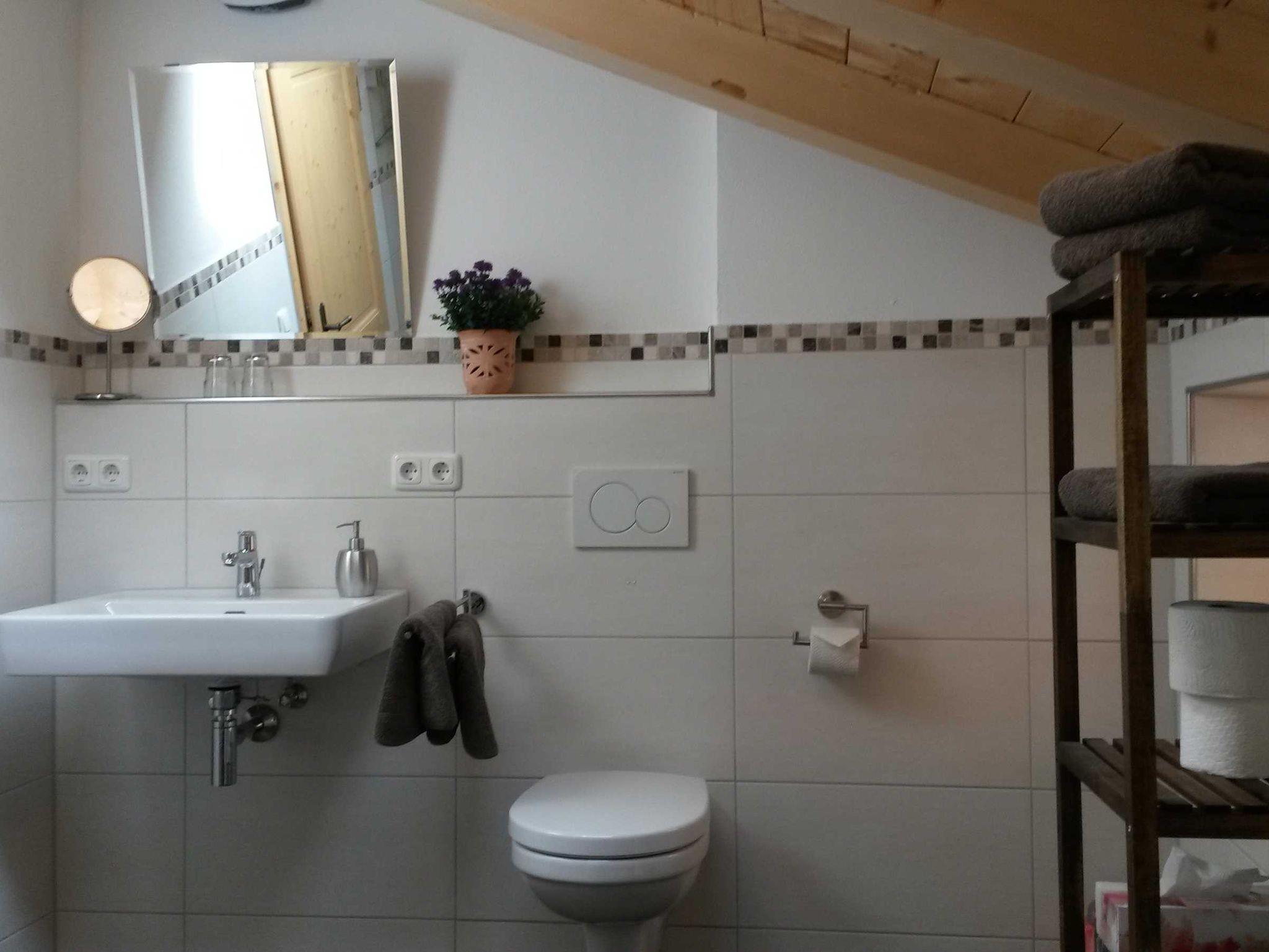 Großzügige, neu gebaute Ferienwohnung im 1. Stock im Nebengebäude. Sie ist durch den sichtbaren Dachstuhl und den echten Holzfußboden im Wohn- und Schlafbereich sehr gemütlich.