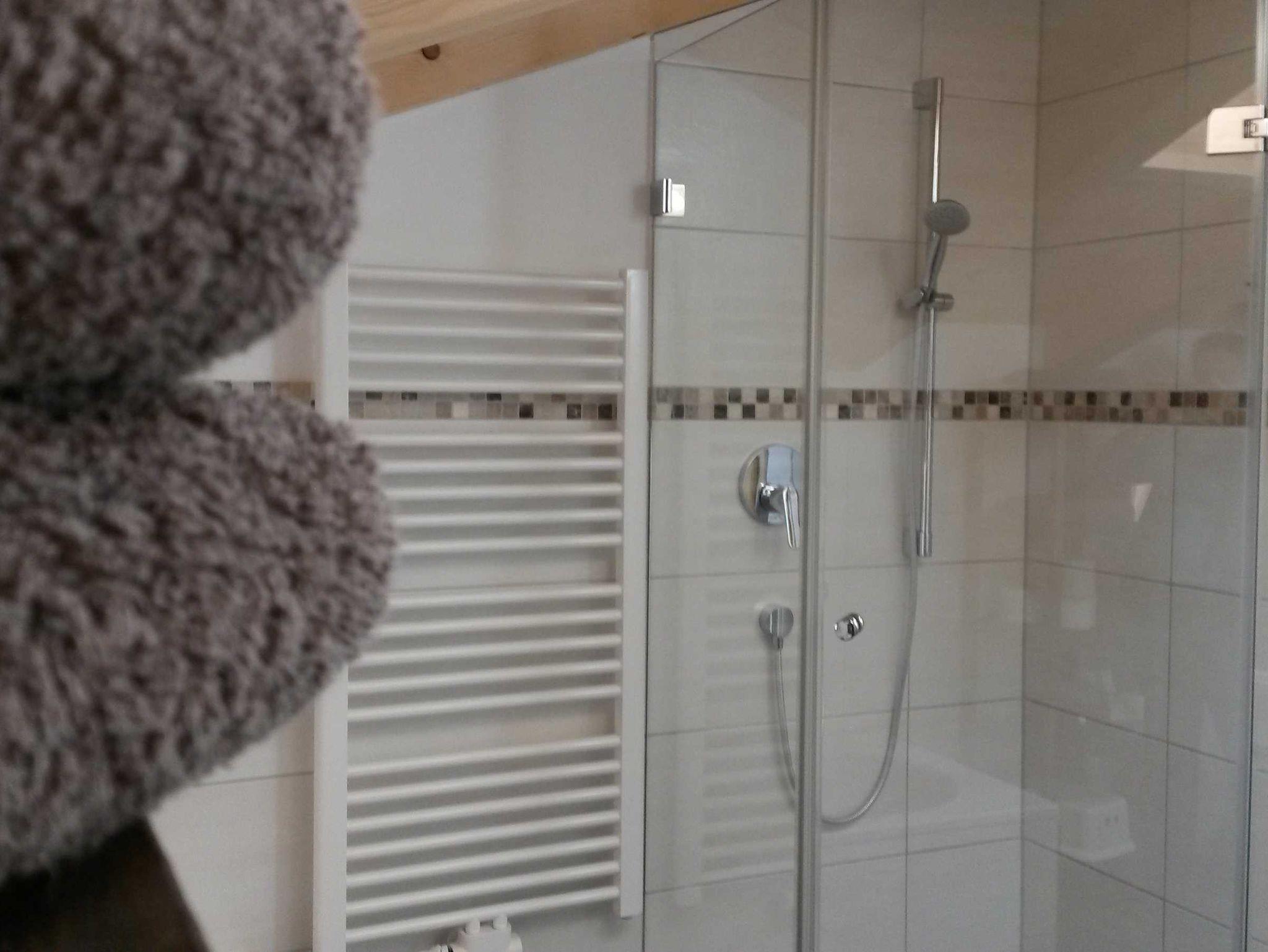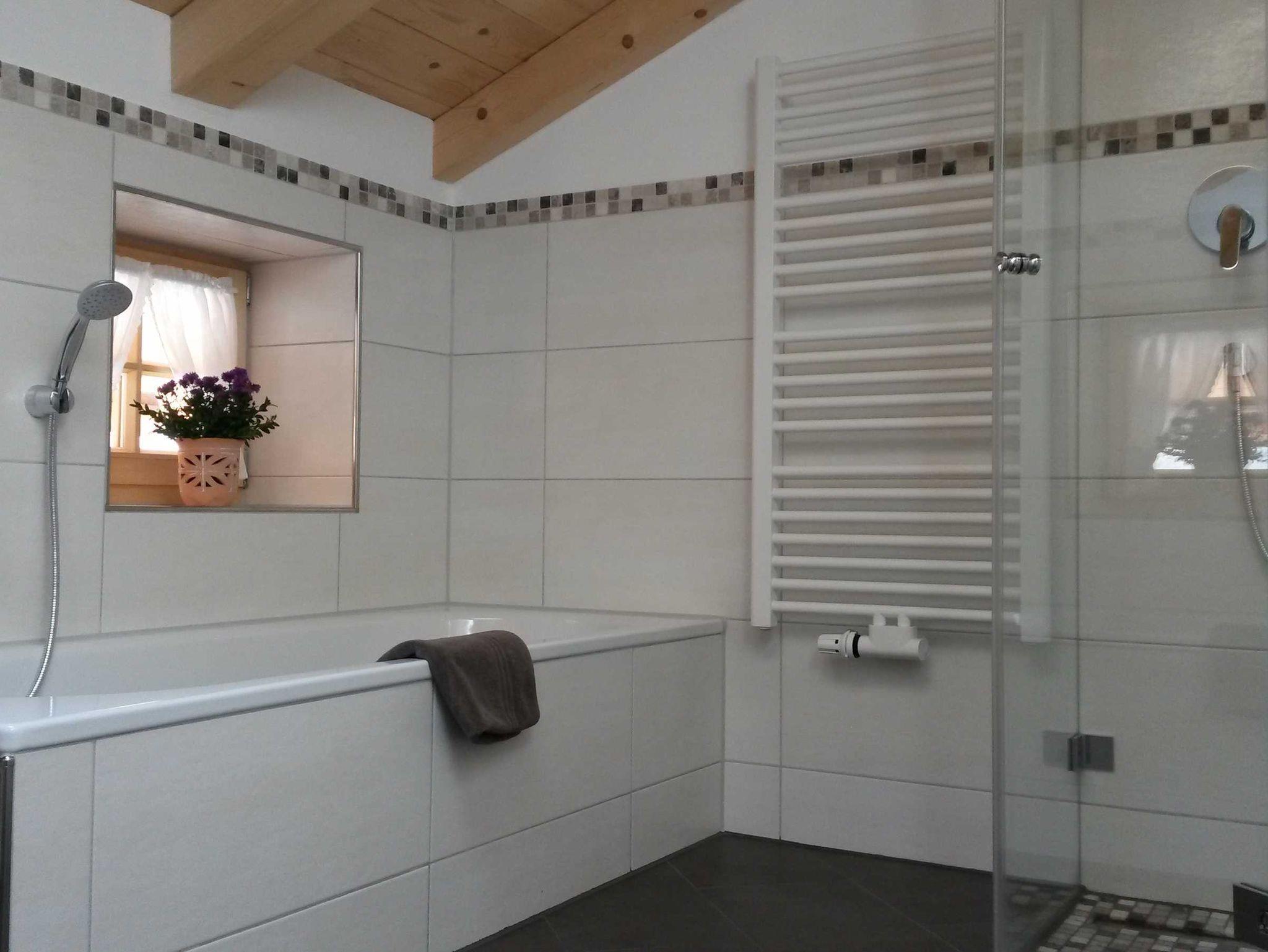 Ein Schlafzimmer und ein großes Bad mit Dusche und Badewanne sorgen für eine erholsame Nacht.