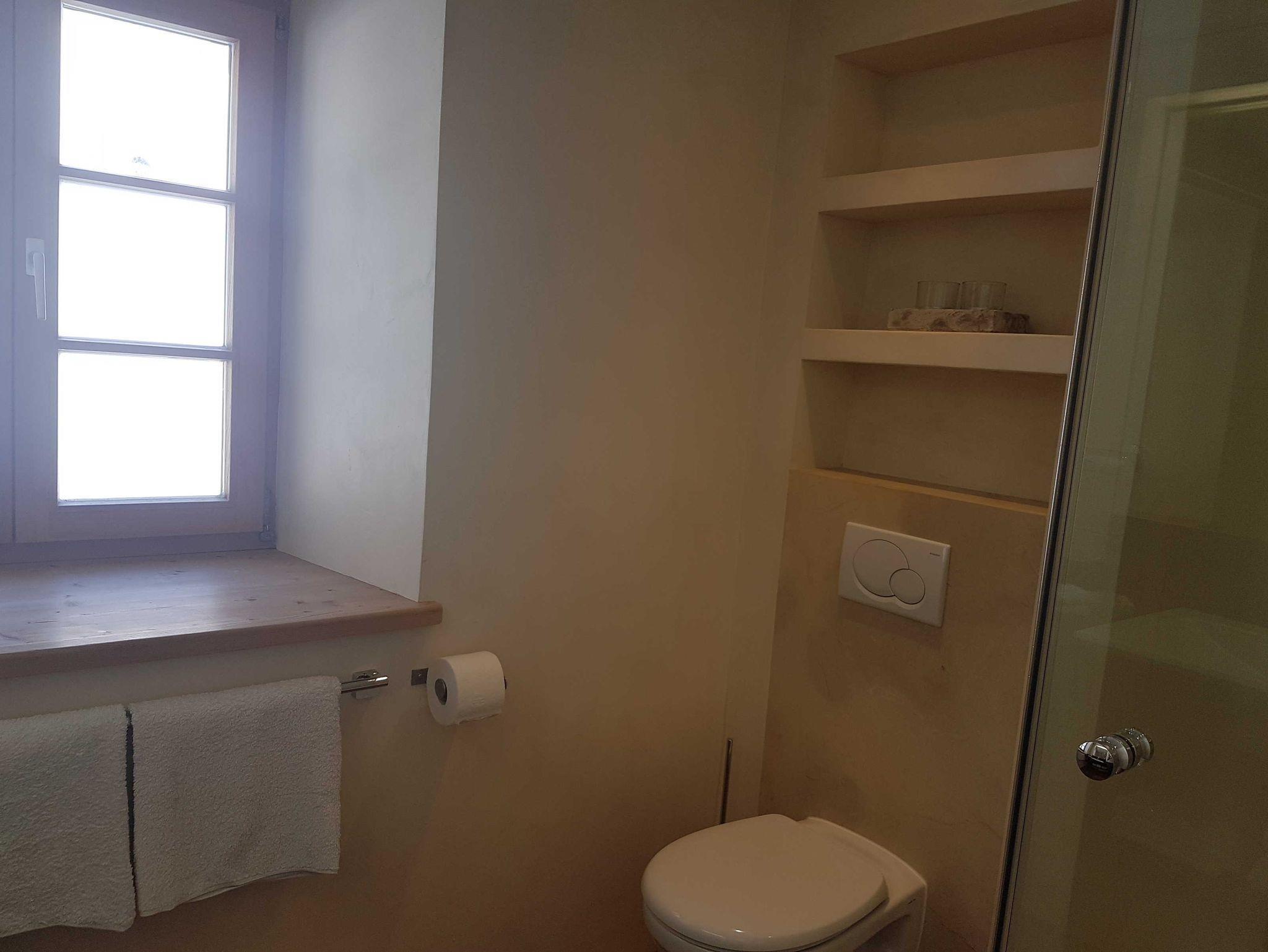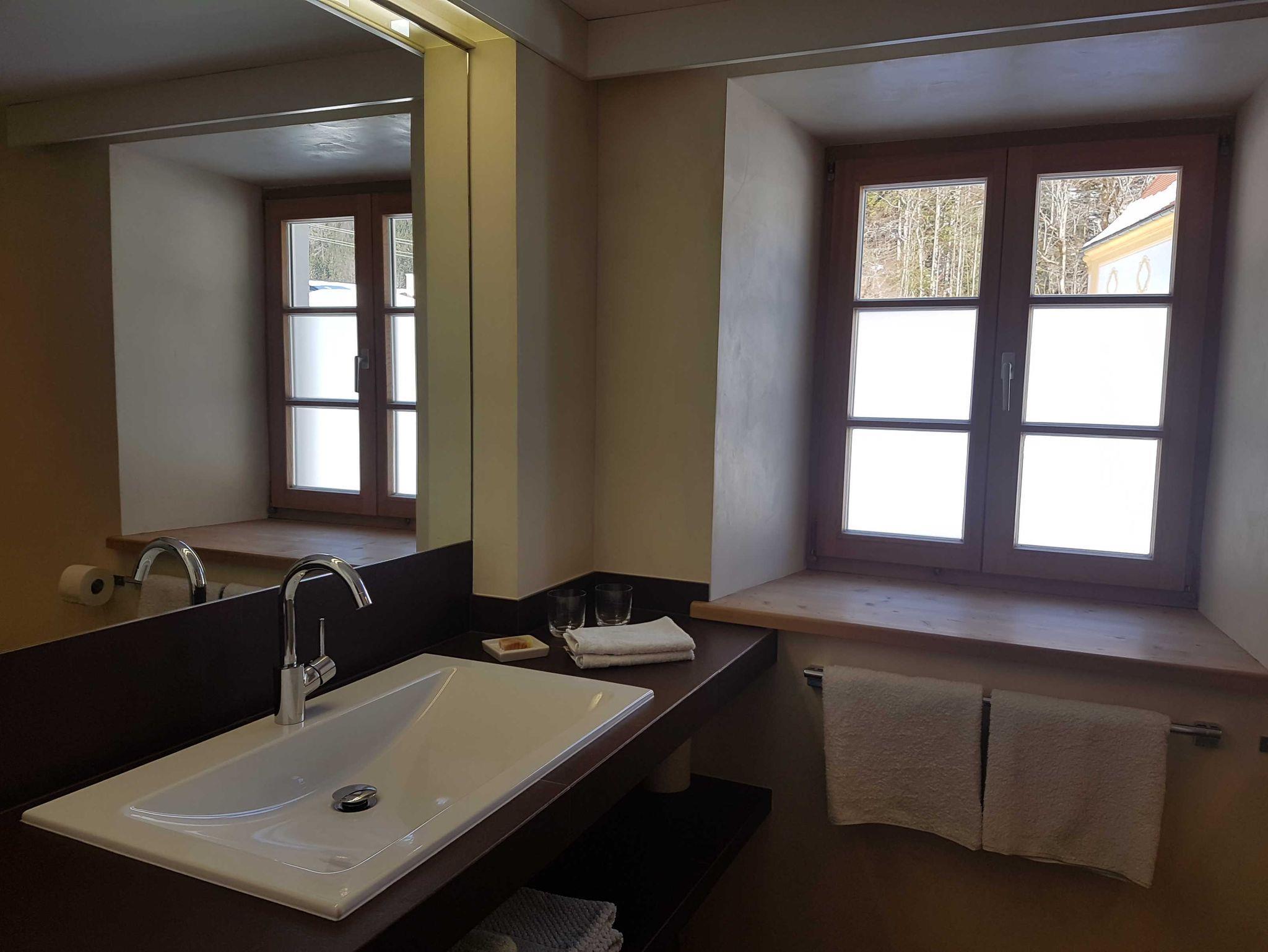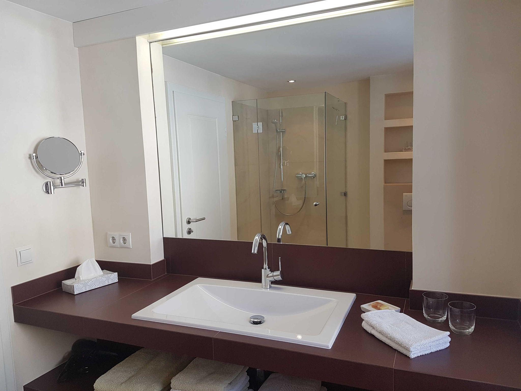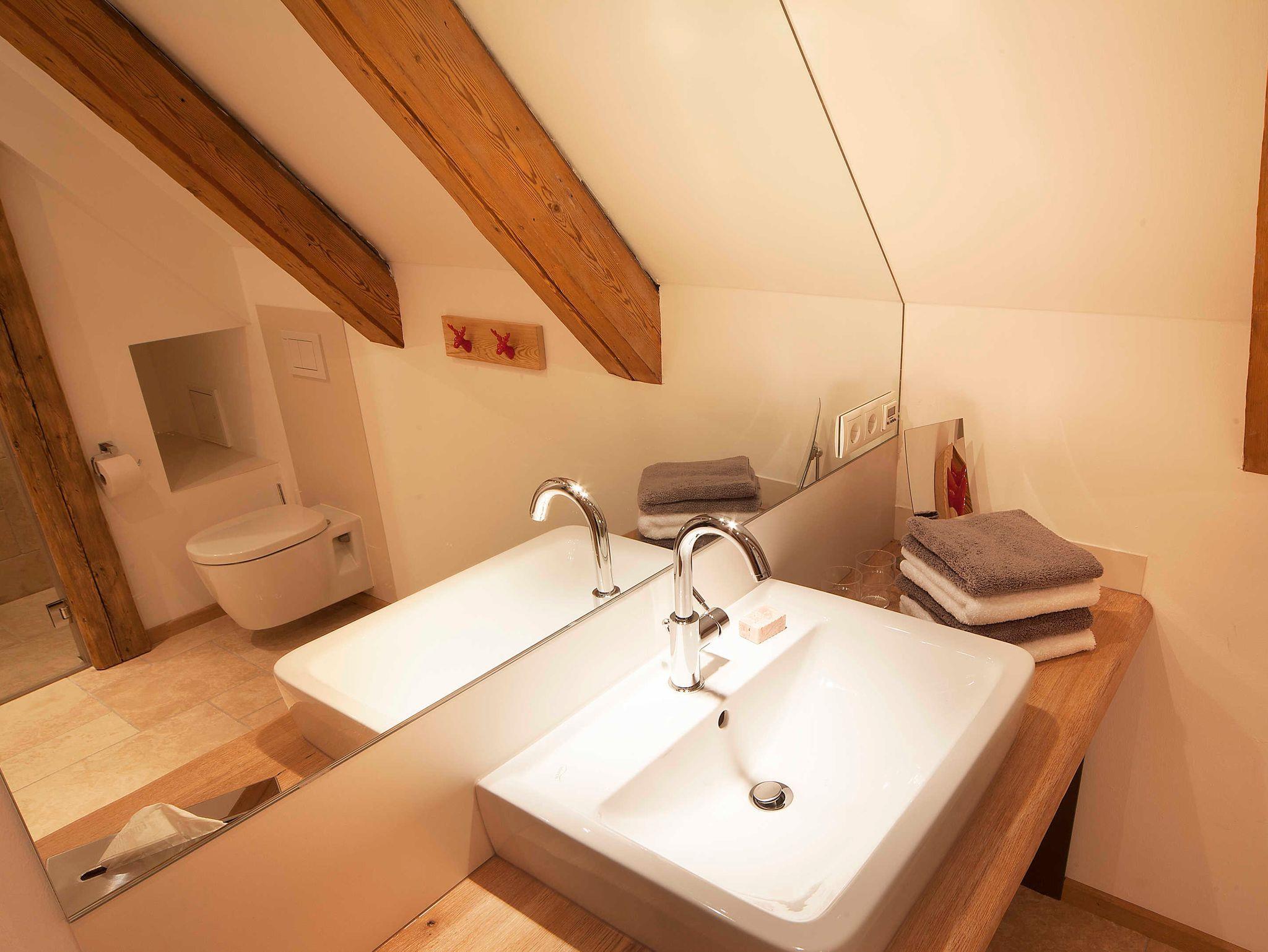 Im Bad ist hochwertiger Naturstein verlegt, ausgestattet mit Dusche/WC und großem Waschtisch. Neben Fön, Schminkspiegel und Seife liegen genügend Handtücher für Sie bereit.