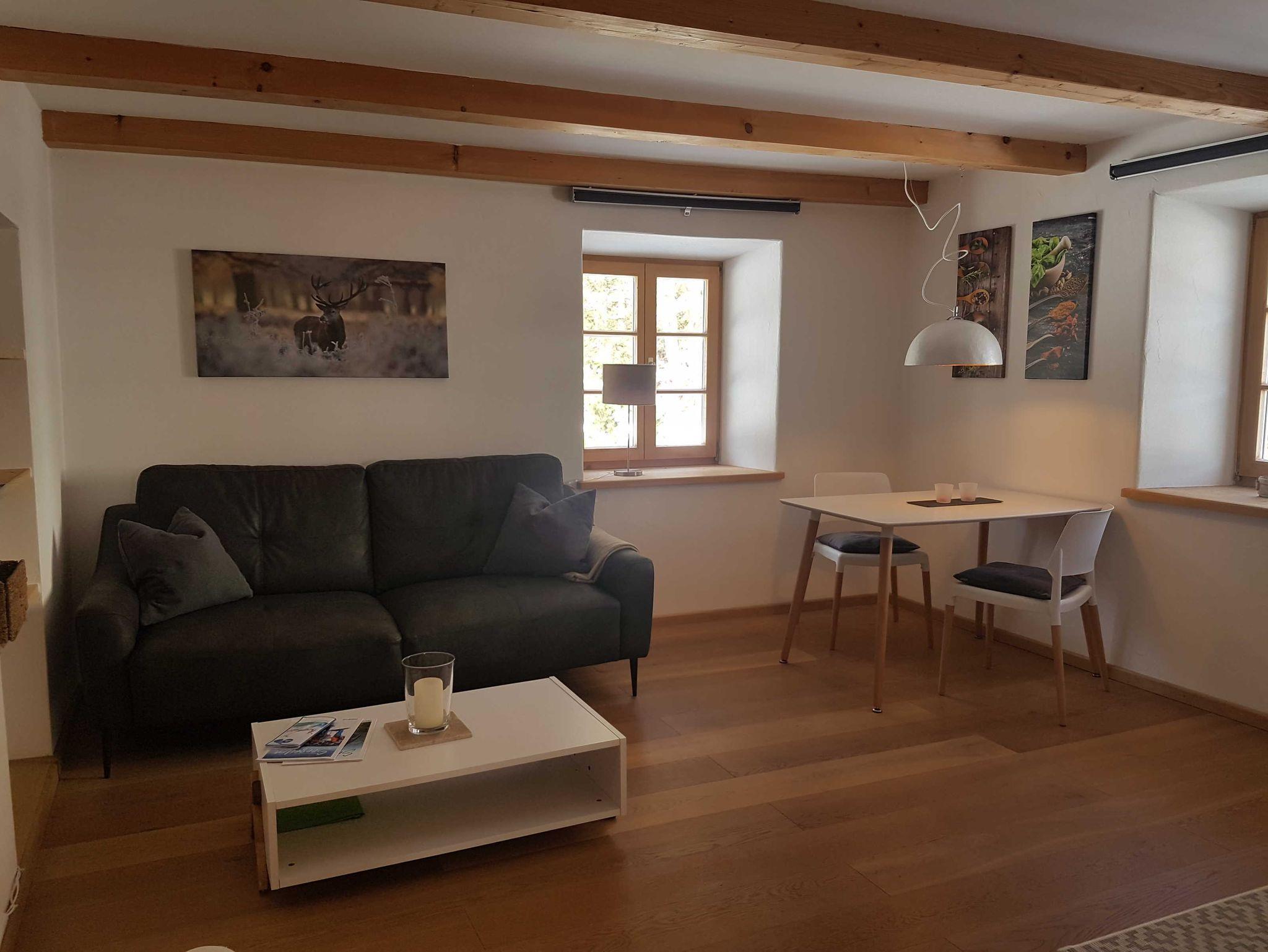 Die helle und gemütliche Zweizimmerwohnung liegt im 1. Stock, ist ländlich modern eingerichtet und mit hochwertigen Eichenholzböden sowie historischem Ziegelboden ausgestattet.