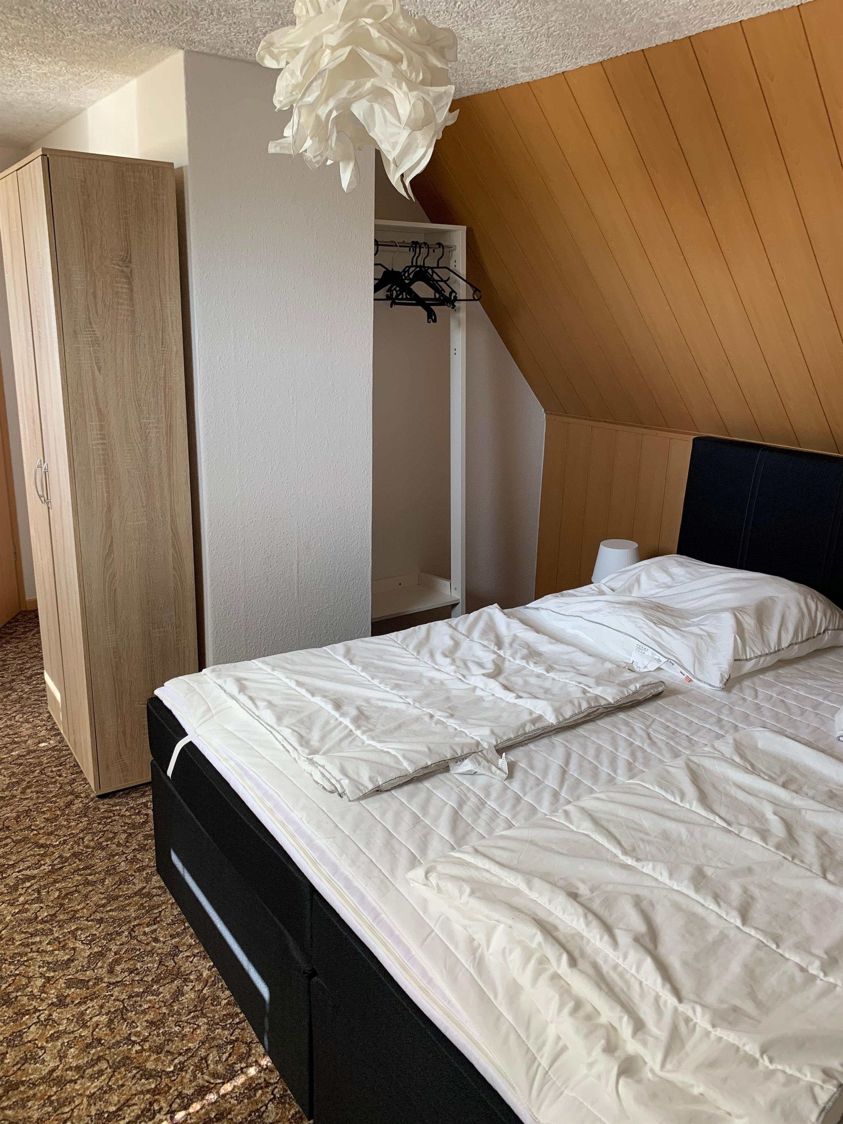 Der Vermieter wohnt in eigenem Haus auf gleichem Grundstück. Sie befindet sich hinter dem Wohnhaus im Nebengebäude unterm Dach. Auf 75m² bei schrägen Wänden befindet sich ein gemütlicher Wohnraum mit Sitzecke und TV, ein großer Esstisch mit 8 Sitzplätze.