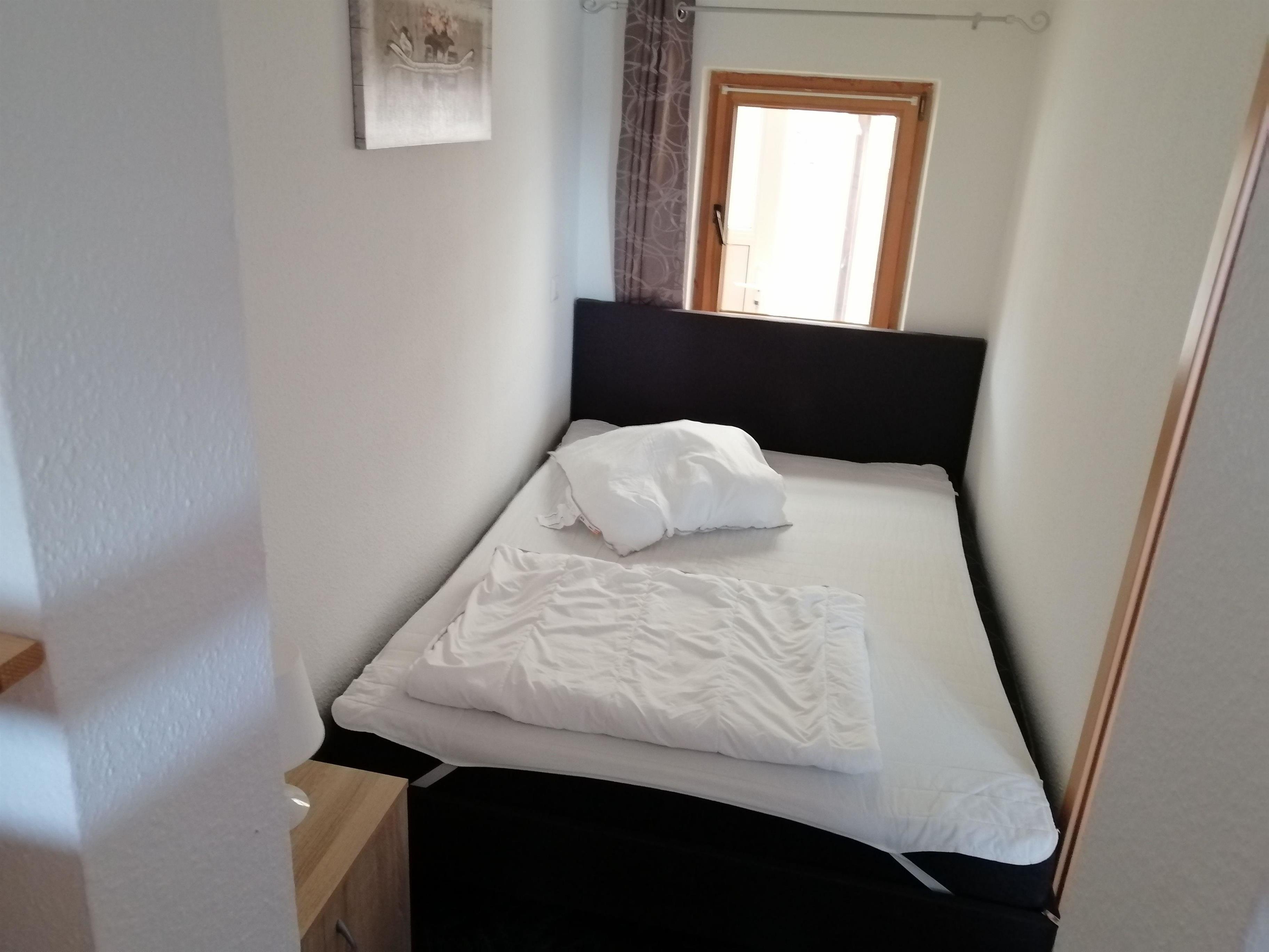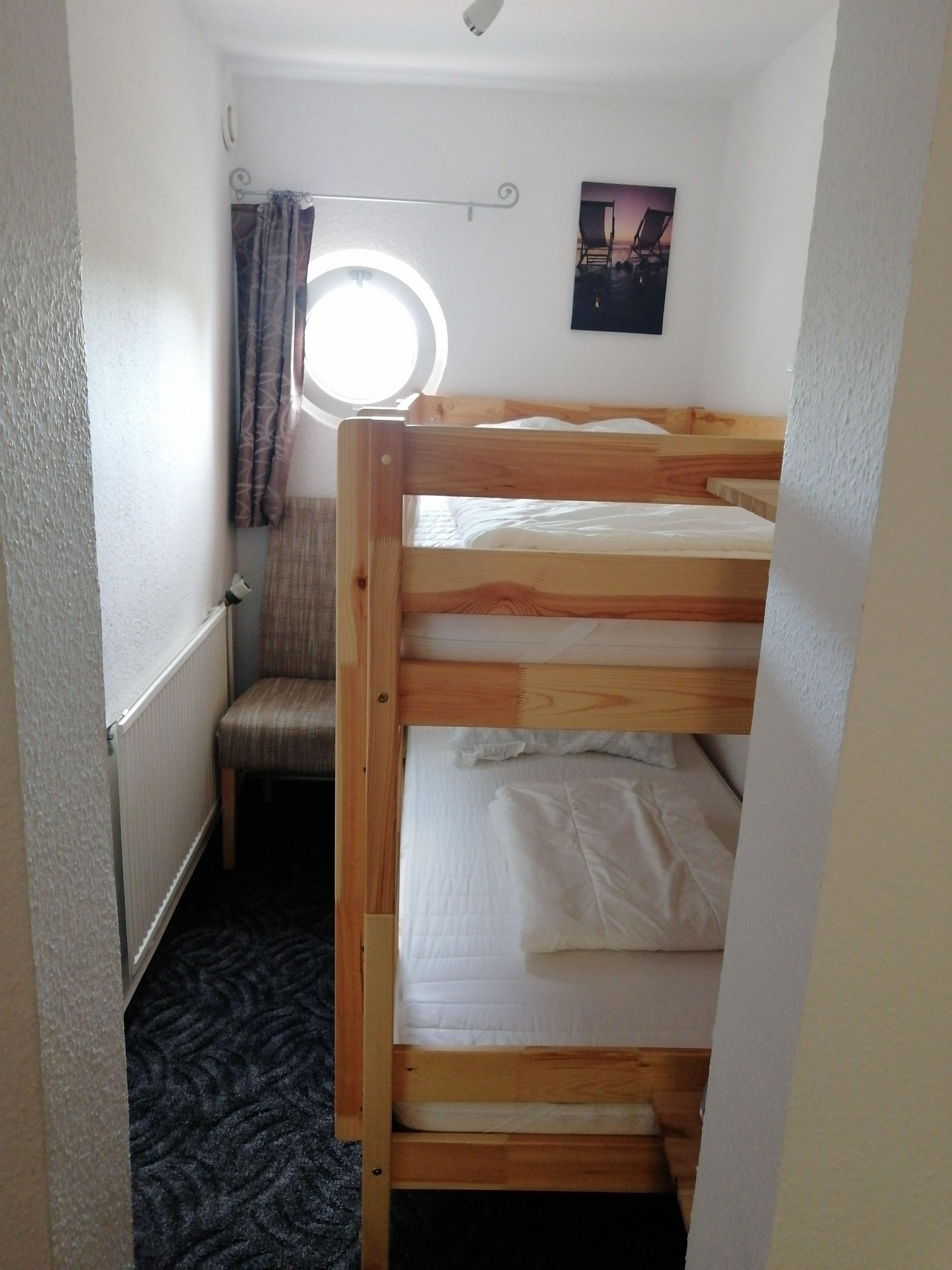 Der Schlafraum mit Doppelbett 1,40 x 2m, sowie ein Doppelstockbett mit 90cm x 2m, ein Kleiderschrank mit Stauraum. Die Küche ist ausgestattet mit Kaffeemaschine, Wasserkocher, Toaster, Kühlschrank, Kochplatten zum Kochen, sowie Töpfe und Pfannen. Zu der Wohnung gehört ein Bad mit Dusche und Waschbecken, WC und Haartrockner.