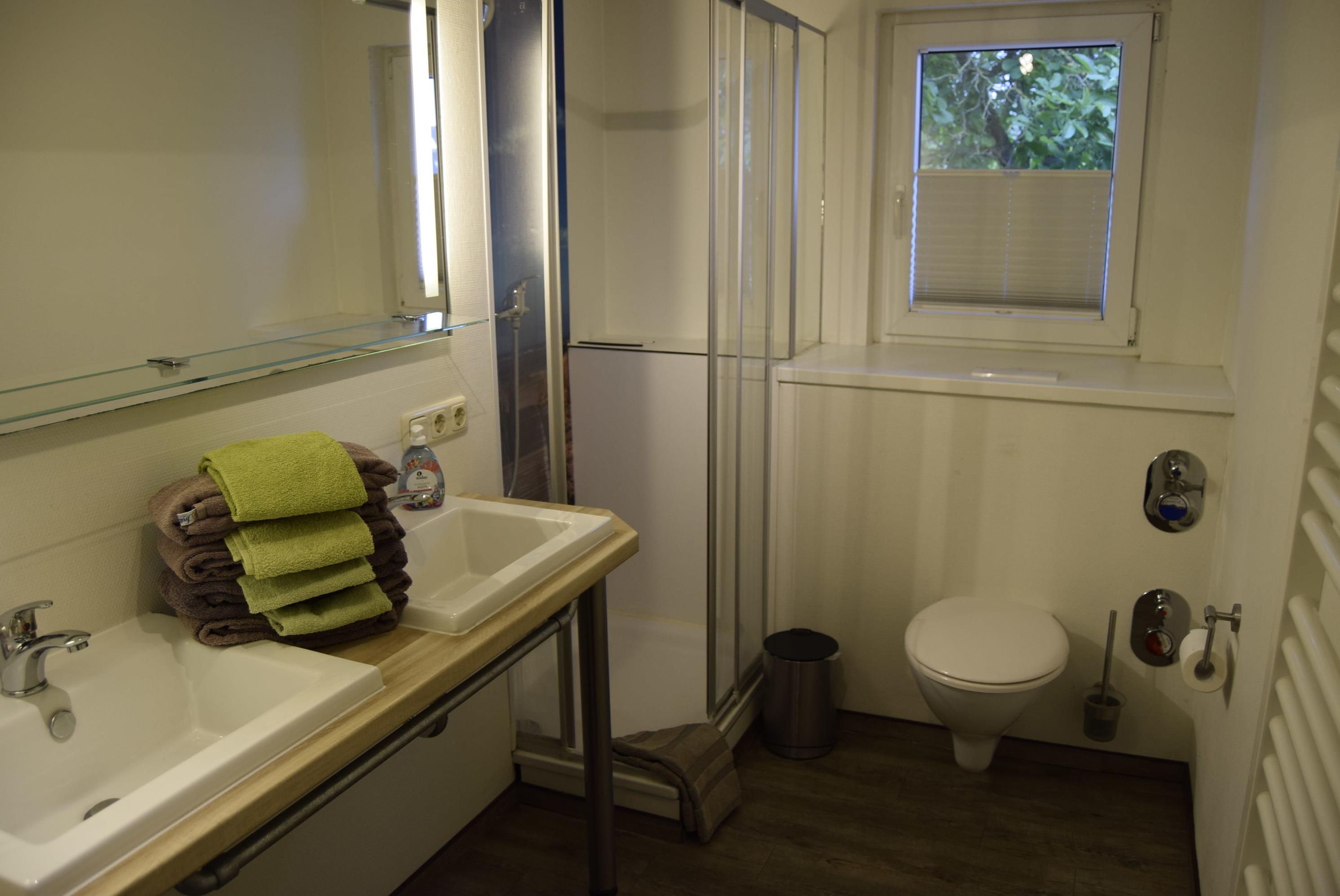 Das Badezimmer bietet Ihnen ein großzügiges Doppelwaschbecken sowie eine Dusche. Hier steht auch die Waschmaschine für Sie zur Verfügung